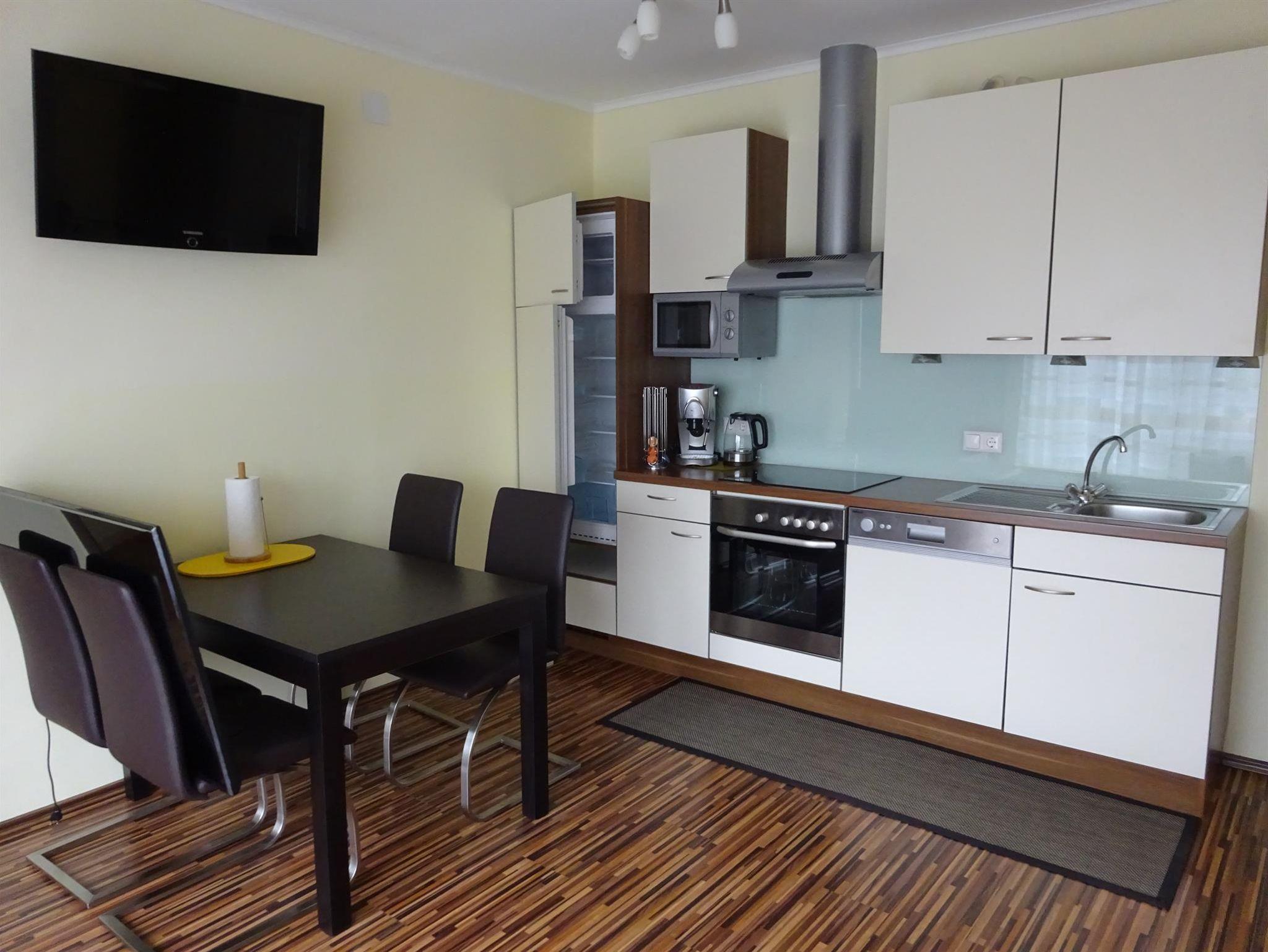 Wohn-Essraum mit Balkon ,Kochnische E-Herd 4 Platten,Backrohr,Spülmaschine,Kühlschrank mit Gefrierfach,Mikrowelle,Toaster,Wasserkocher,Filter u.TABS kaffeeautomat, Geschirr...