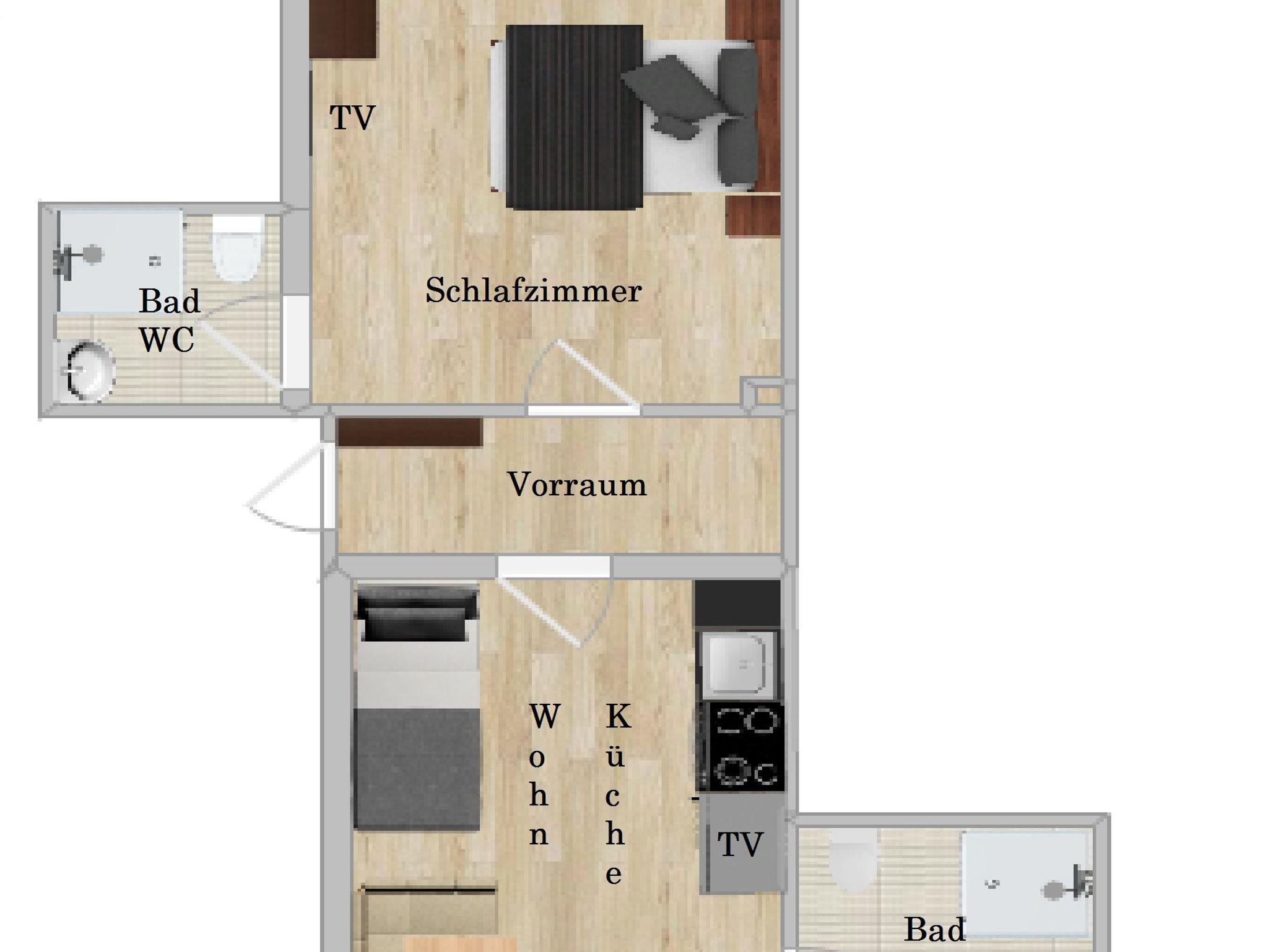 2 separate Schlafzimmer, 2 Bäder mit DU/WC. Ein Schlafzimmer mit Doppelbett, das zweite mit Doppelbett und 2 großen Zusatzbetten.