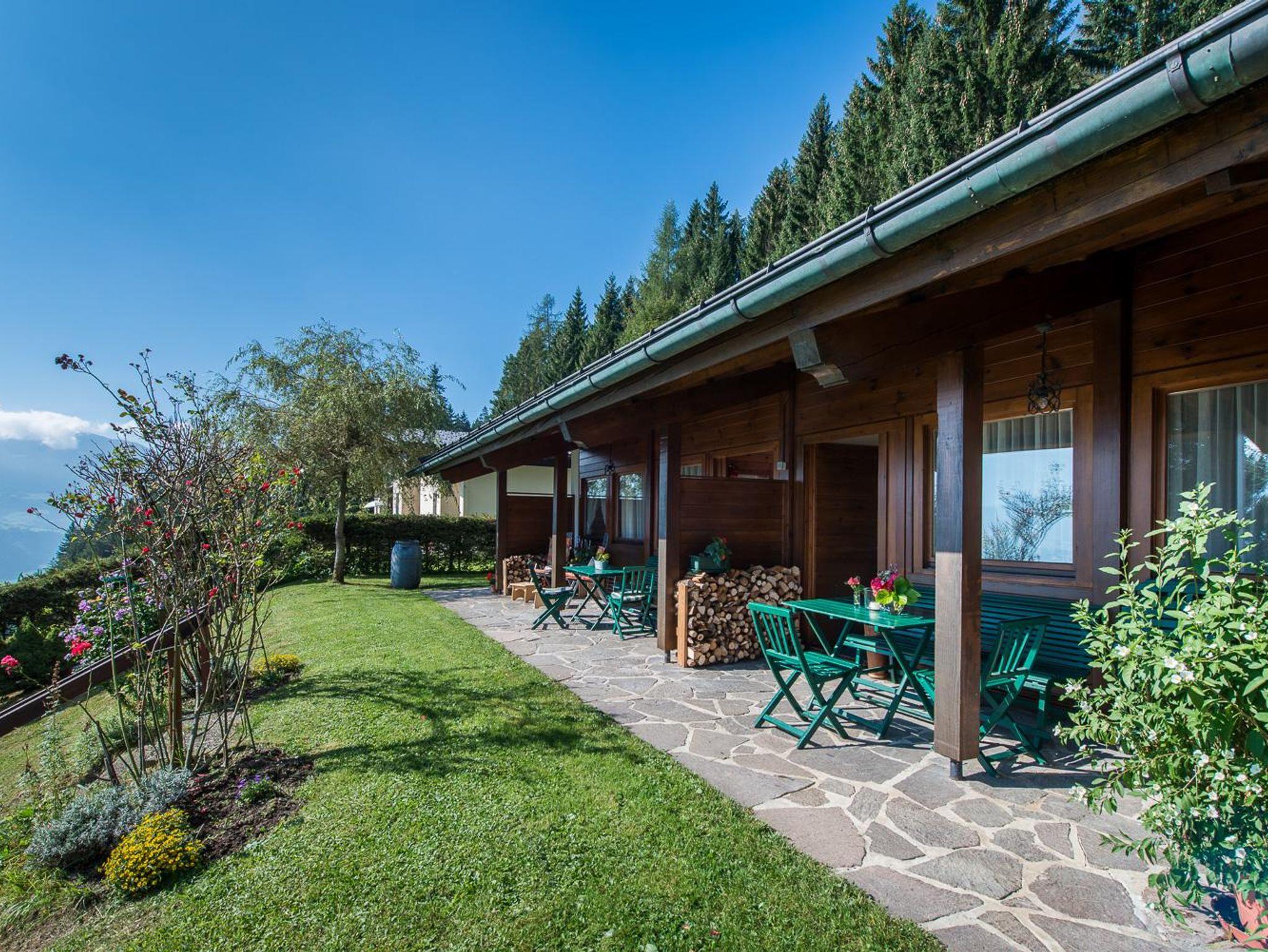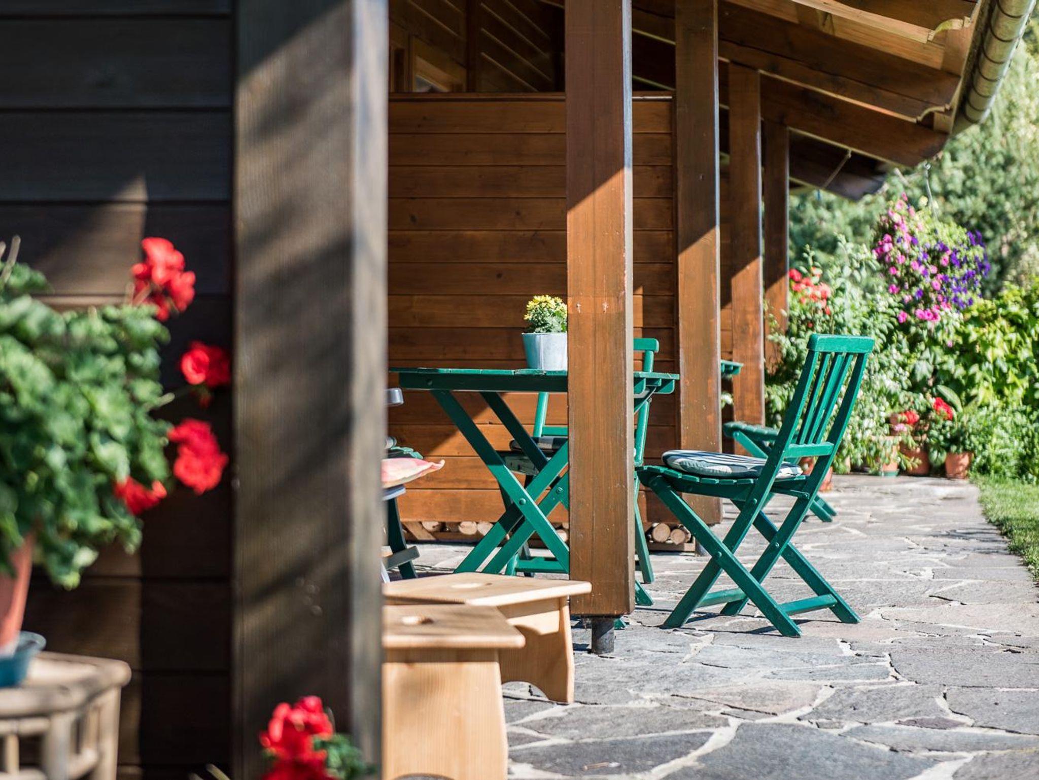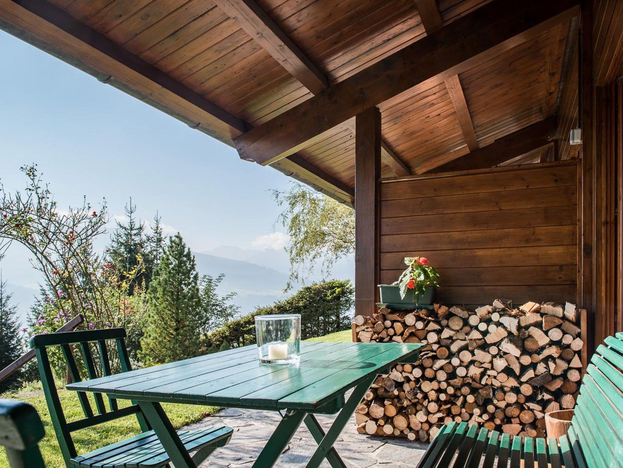 Im Aussenbereich Sitzmöglichkeit und Wiese mit herrlicher Talsicht