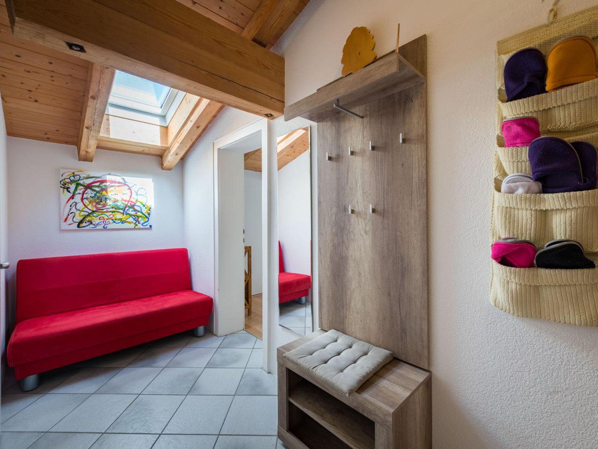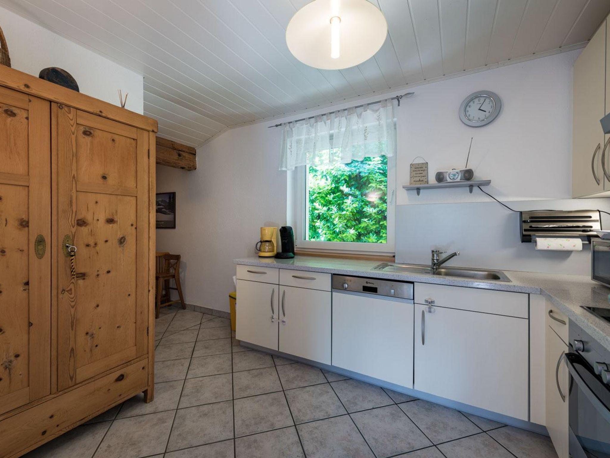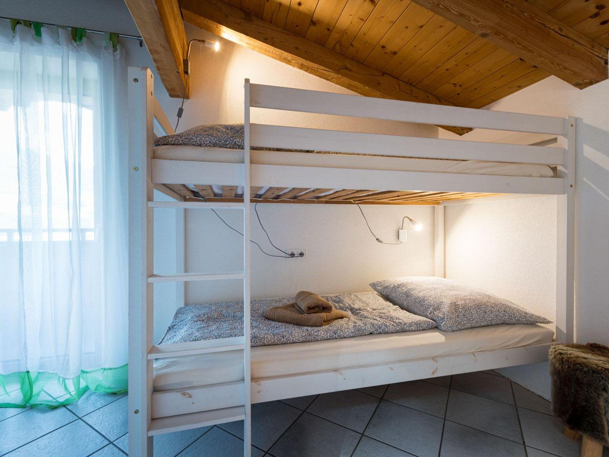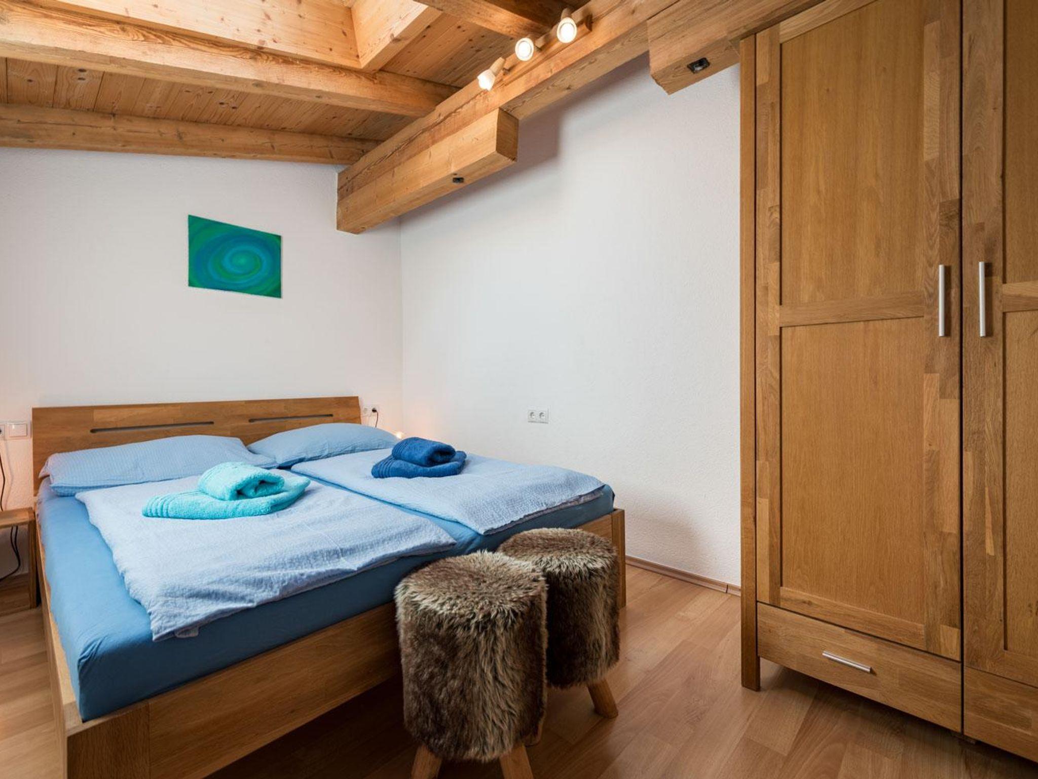 Die 100m² große Ferienwohnung verfügt über 3 Schlafzimmer mit 2 Doppelbetten und einem Stockbett. Ein ausziehbares Sofa ist ebenfalls vorhanden. Die Wohnung bietet Platz für bis zu 6 Personen. Nach einem Ski- oder Wandertag kann man in der Infrarotkabine und am Holzofen herrlich entspannen.