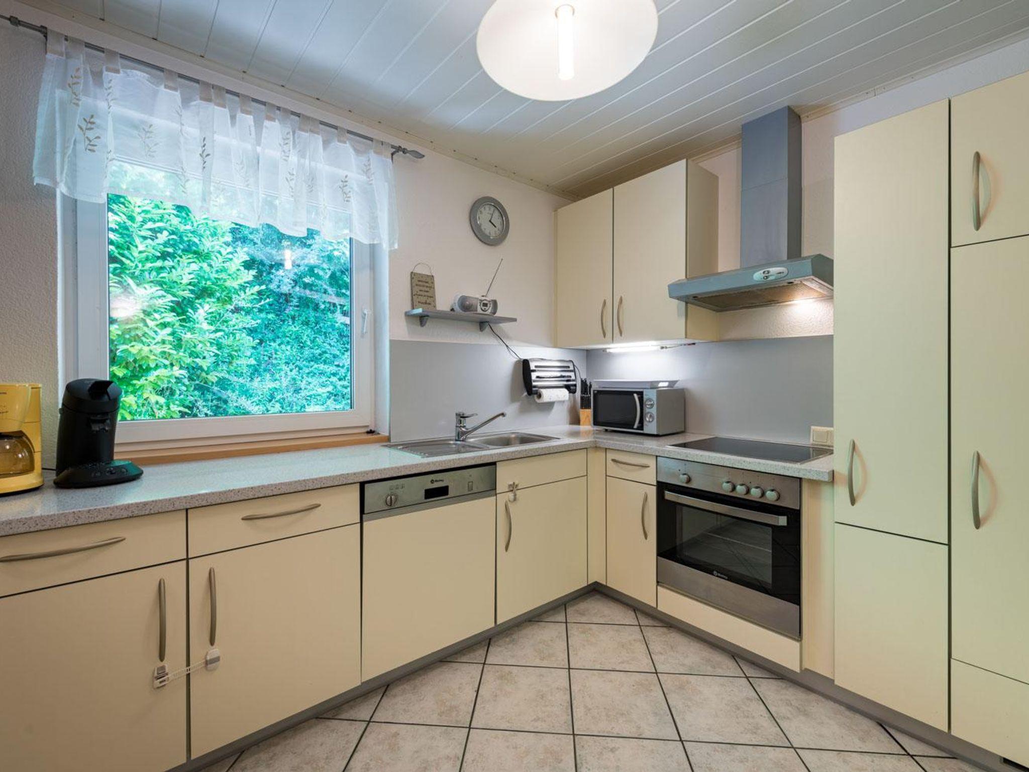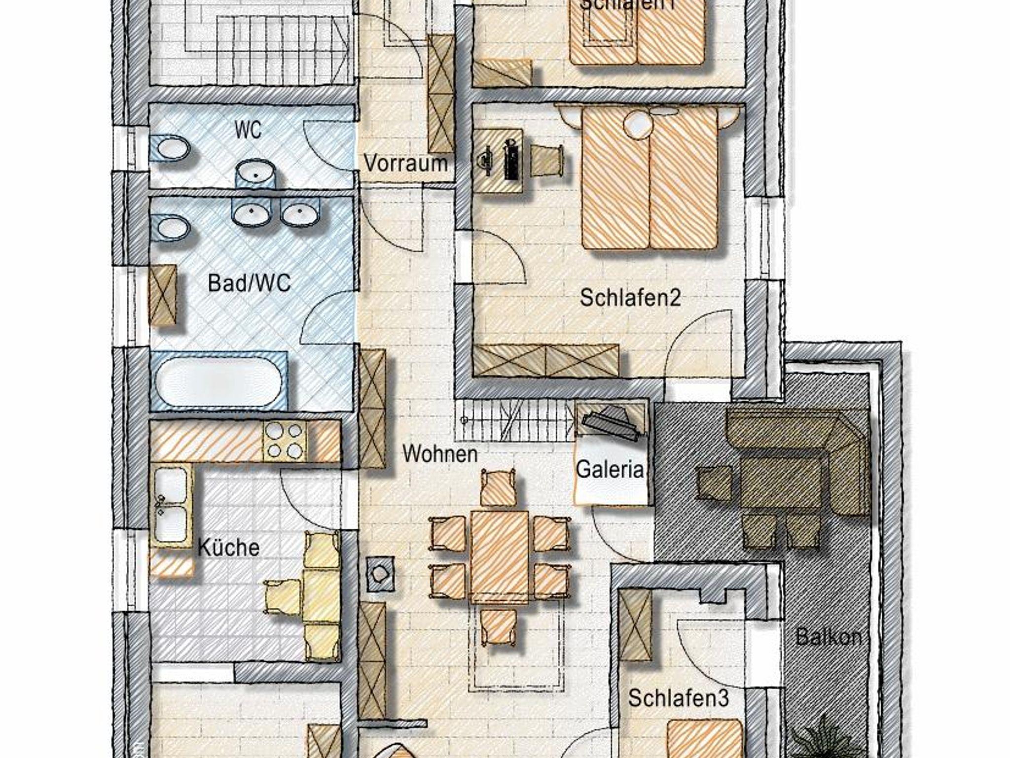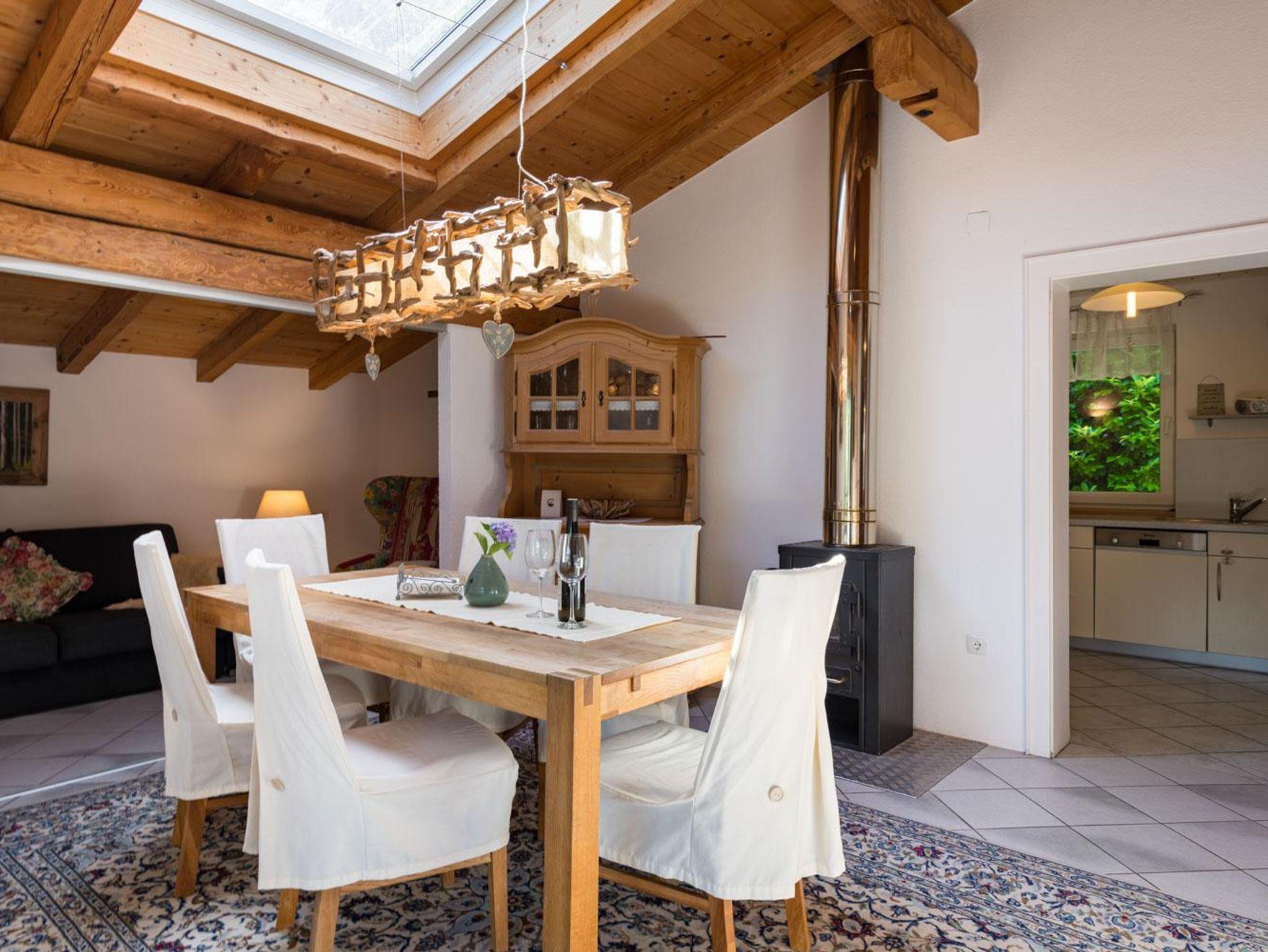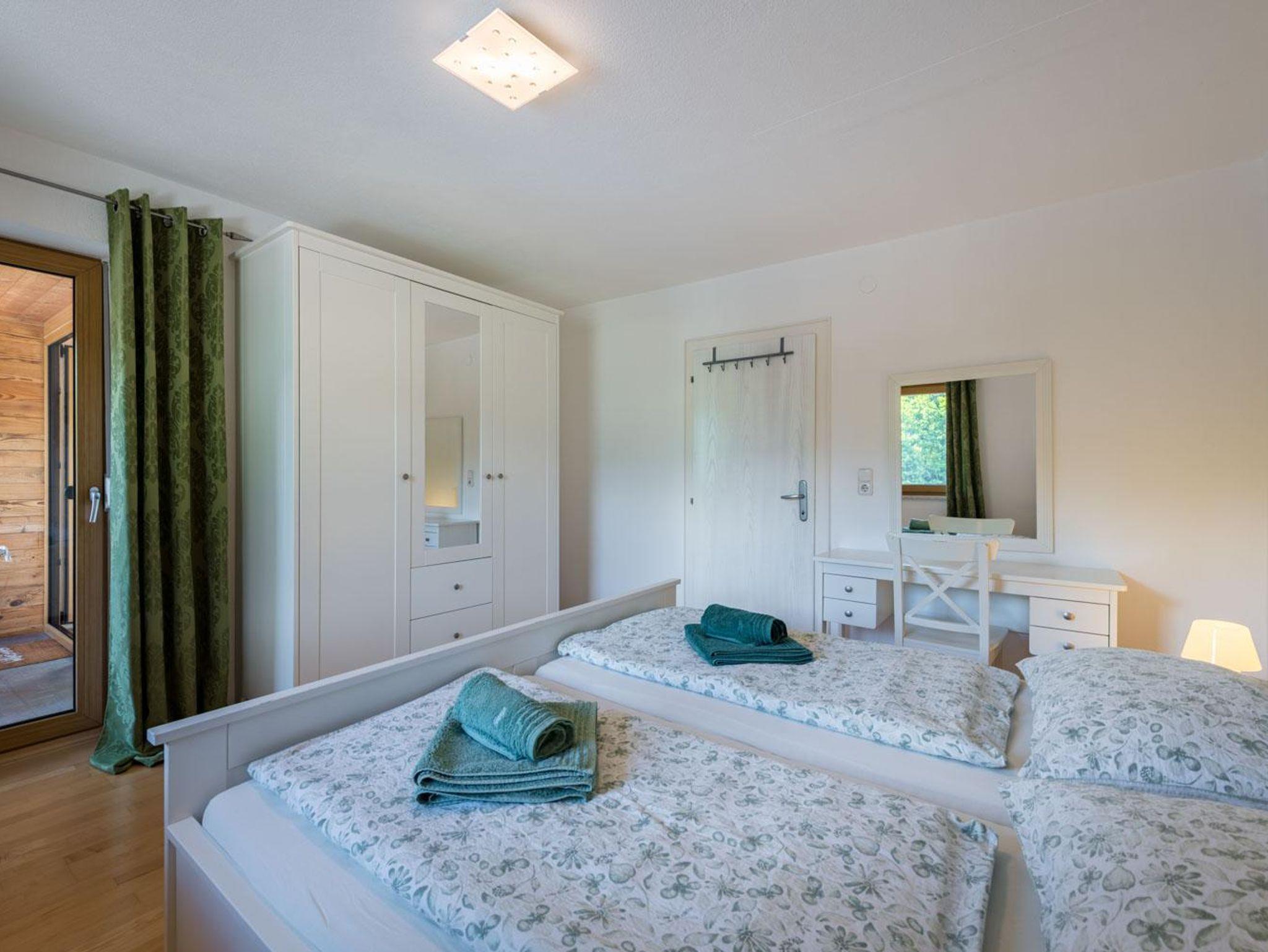 Die 100m² große Ferienwohnung verfügt über 3 Schlafzimmer mit 2 Doppelbetten und einem Stockbett. Ein ausziehbares Sofa ist ebenfalls vorhanden. Die Wohnung bietet Platz für bis zu 6 Personen. Nach einem Ski- oder Wandertag kann man in der Infrarotkabine und am Holzofen herrlich entspannen.