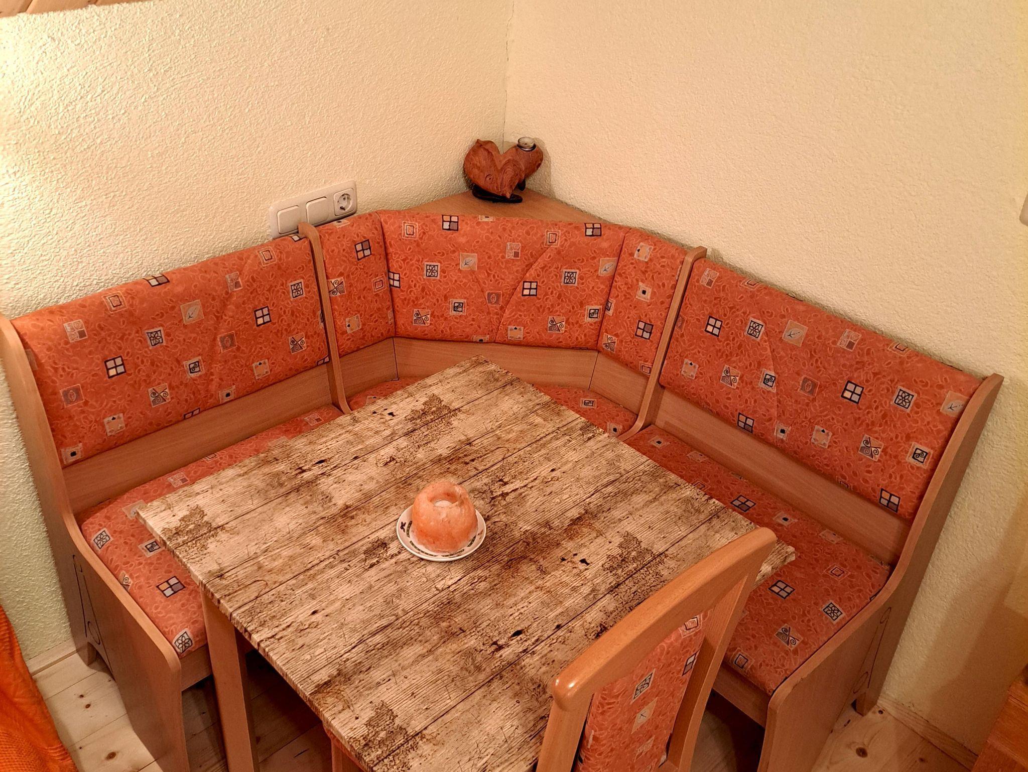 gemütliches Doppelzimmer mit einem Bett (2m x 1,60m) und einer Sitzcouch eine kleine Essecke 2 m Kochnische mit Kochutensilien Balkon mit Blick auf den Hang Sanitärbereich mit Bad und WC