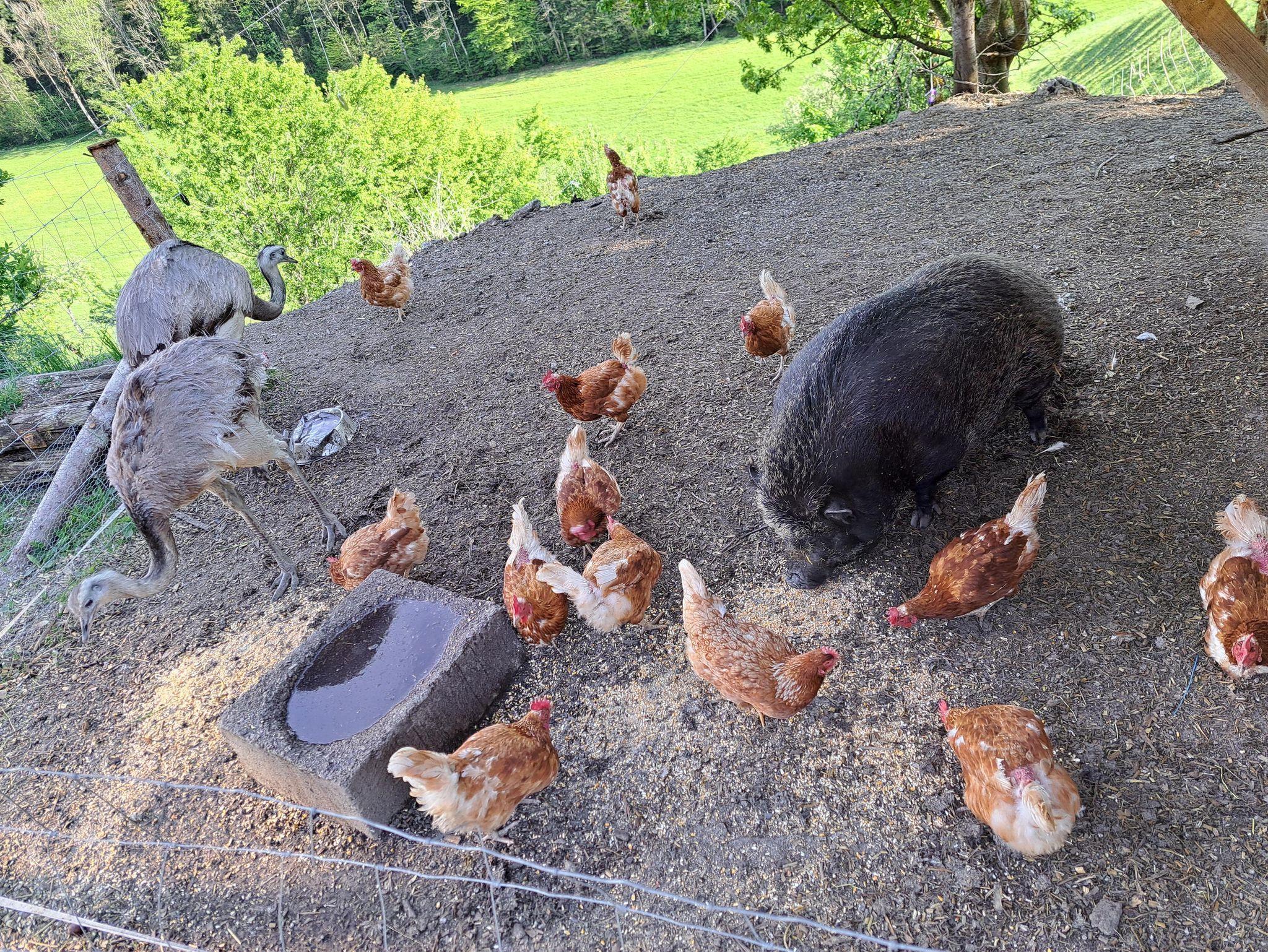 Auf unserem Hof leben ca. 100 Schafe und Lämmer, 4 Pferde, 3 Nandus, Katzen, zwei Hunde und Hühner.
