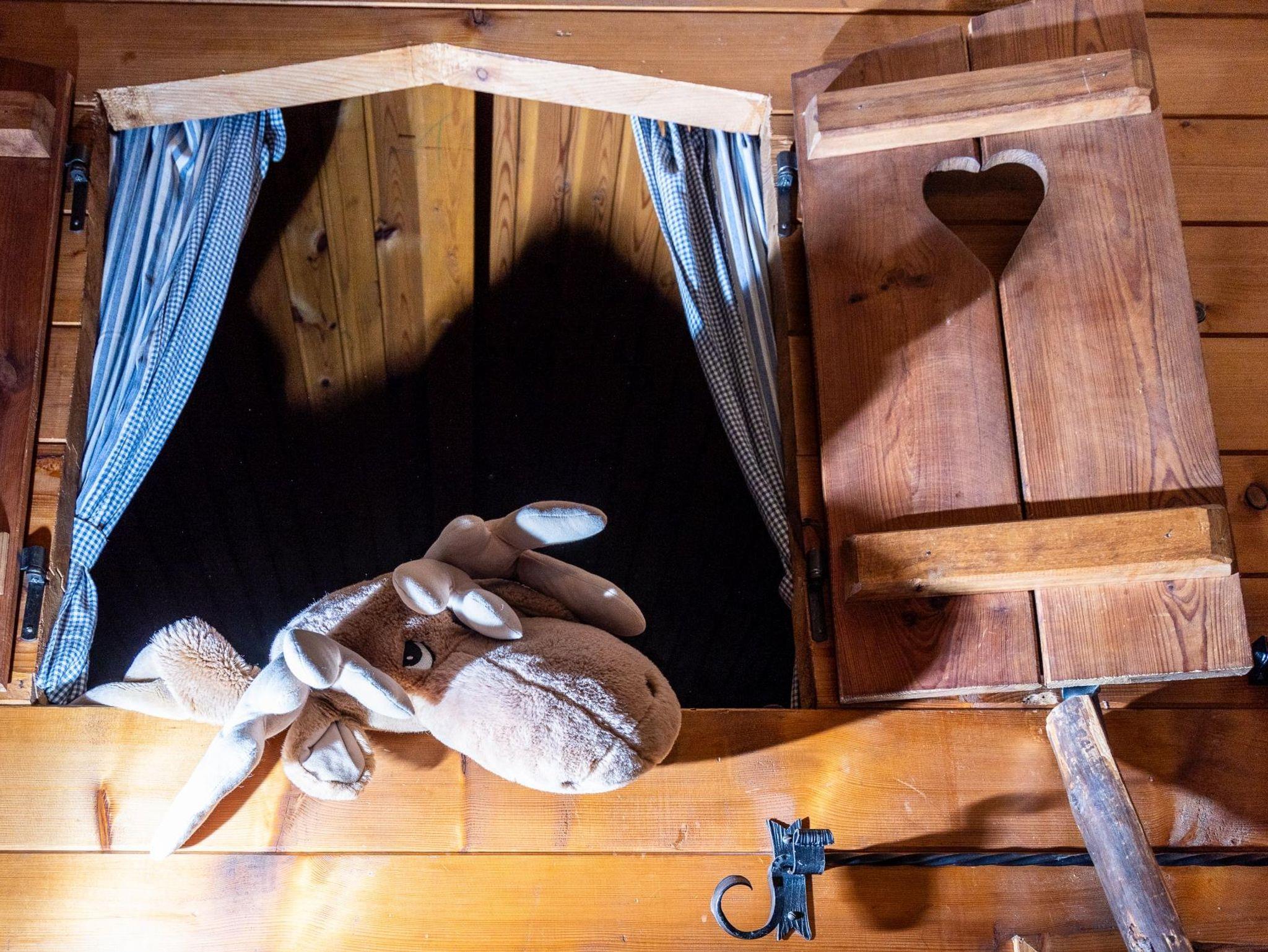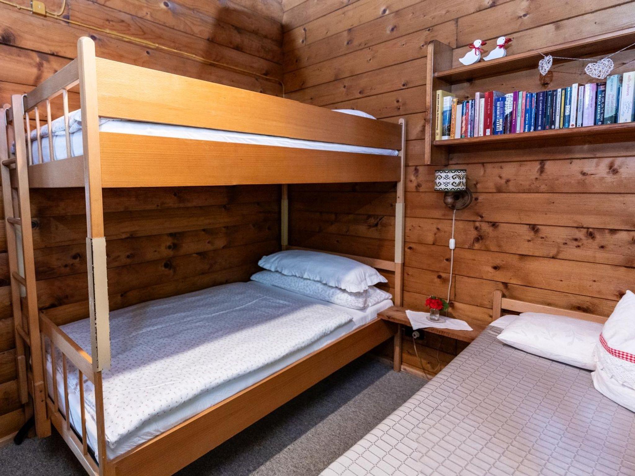 Die Hütte verfügt über ein gemütliches Wohnzimmer mit Esstisch und Fernsehcouch. Das Hauptschlafzimmer mit Doppelbett ist vom Wohnzimmer aus zugänglich. Zusätzlich gibt es ein zweites Schlafzimmer mit Etagenbett und Einzelbett. Das kleine, zweckmäßige Bad verfügt über eine Dusche, WC und ein Waschbecken. Die Küche ist mit sämtlichen Geräten und Geschirr ausgestattet. Ebenso eine kleine Sitzgelegenheit gibt es in der Küche.