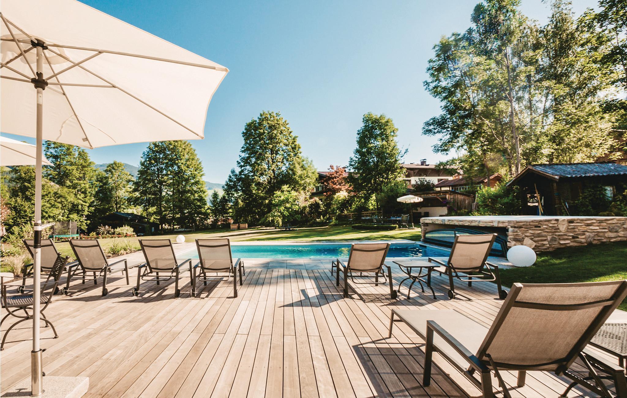 Den meget store have med opvarmet pool er ideel til at slappe af eller slappe af i solen.