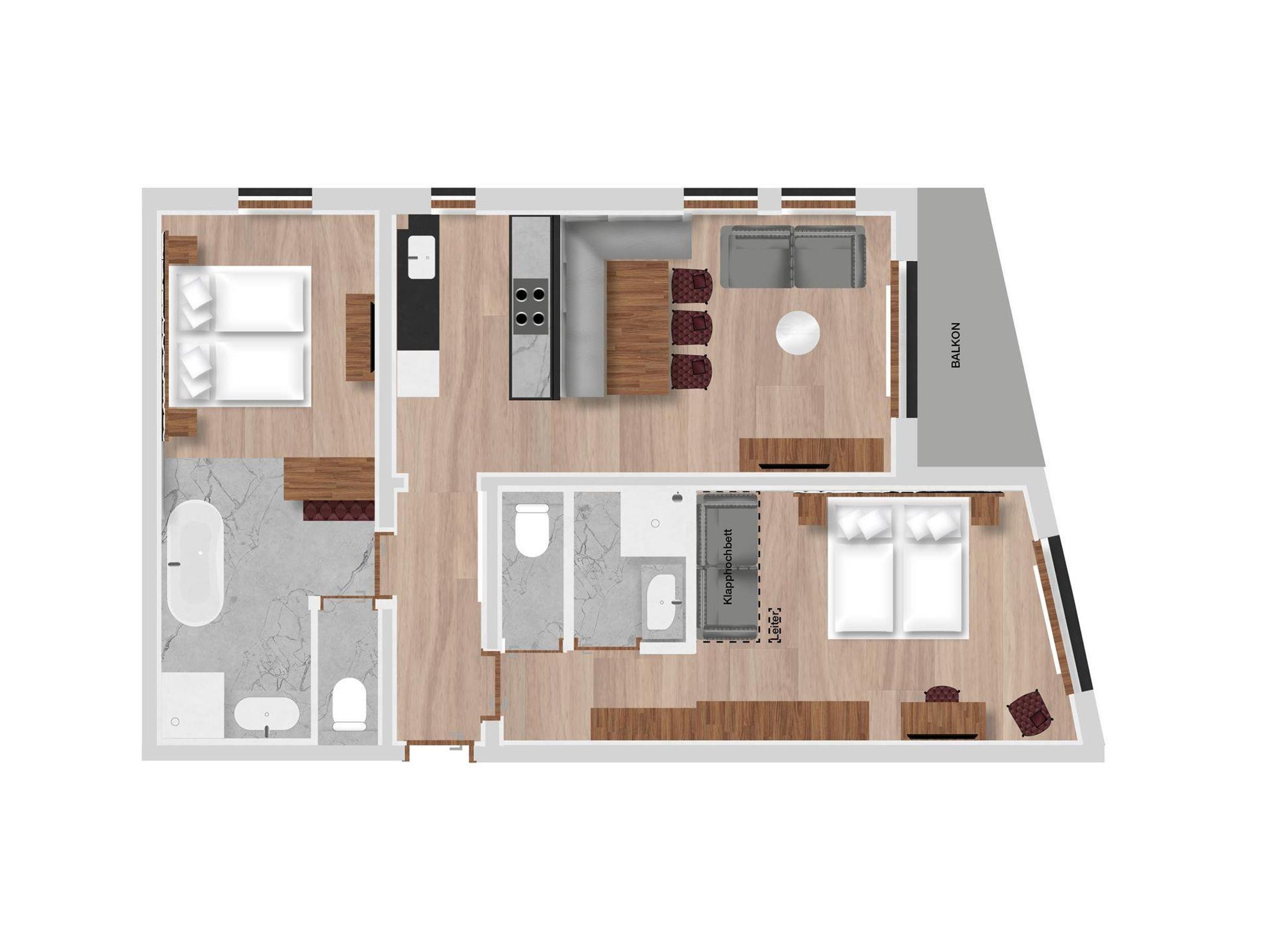 Dieses trendige lifestyle Apartment bietet Ihnen 2 Schlafräume mit gemütlichen Boxspringbetten, eine große Wohnküche zum kochen und relaxen sowie eine großzügige Balkon (5m²). Lage: Süd-östlich mit Blick auf die Hotelanlage/Hof