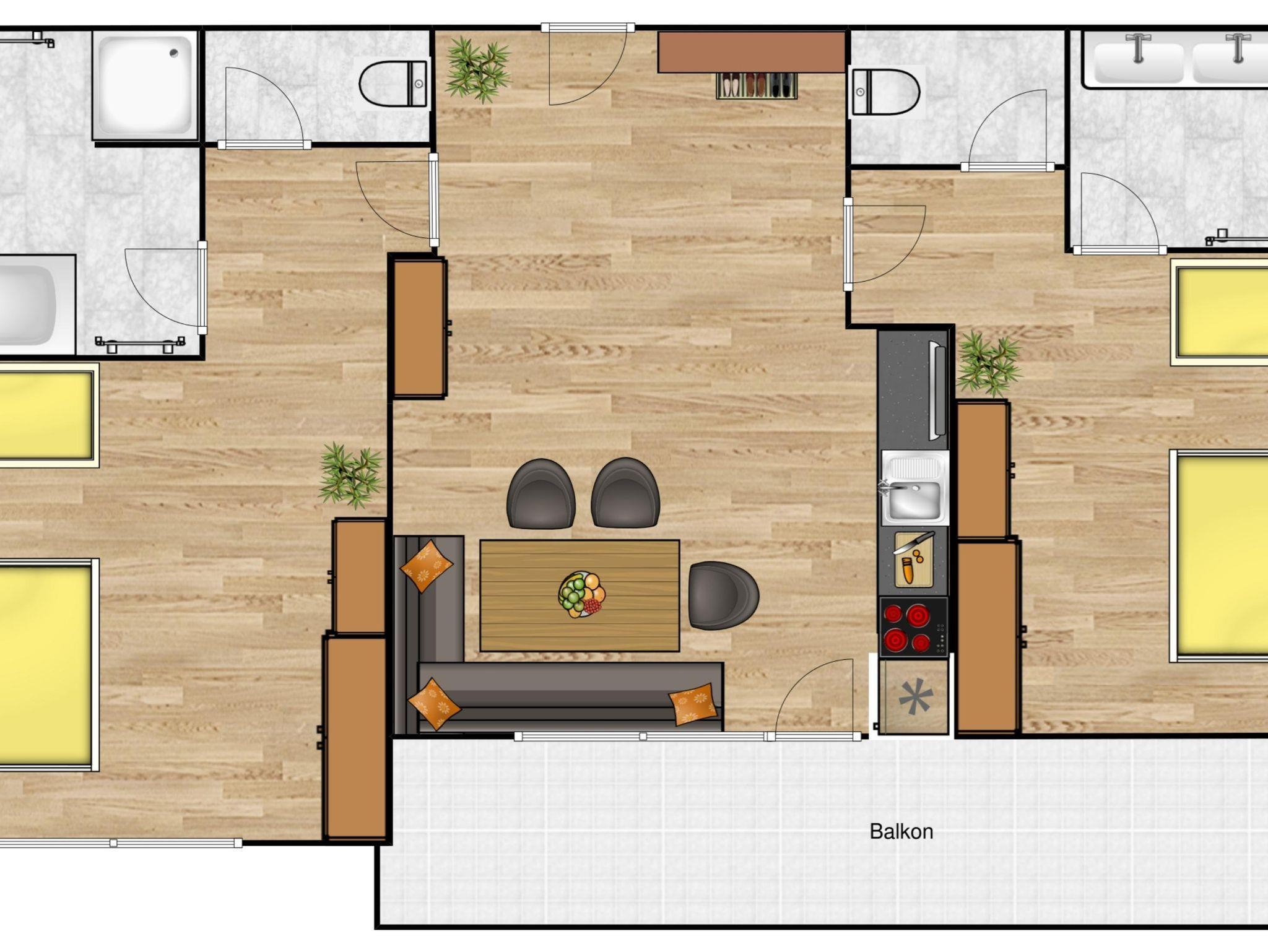 Sonniges Superior Appartement (88 m²) im 1. oder 2. Obergeschoss für bis zu 7 Personen. Ausgestattet mit Küchen-Wohnbereich, 2 Schlafzimmer, 2x Bad mit Dusche, 2x getrenntes WC, Flat-TV, Wifi Internet und südseitigem Balkon.