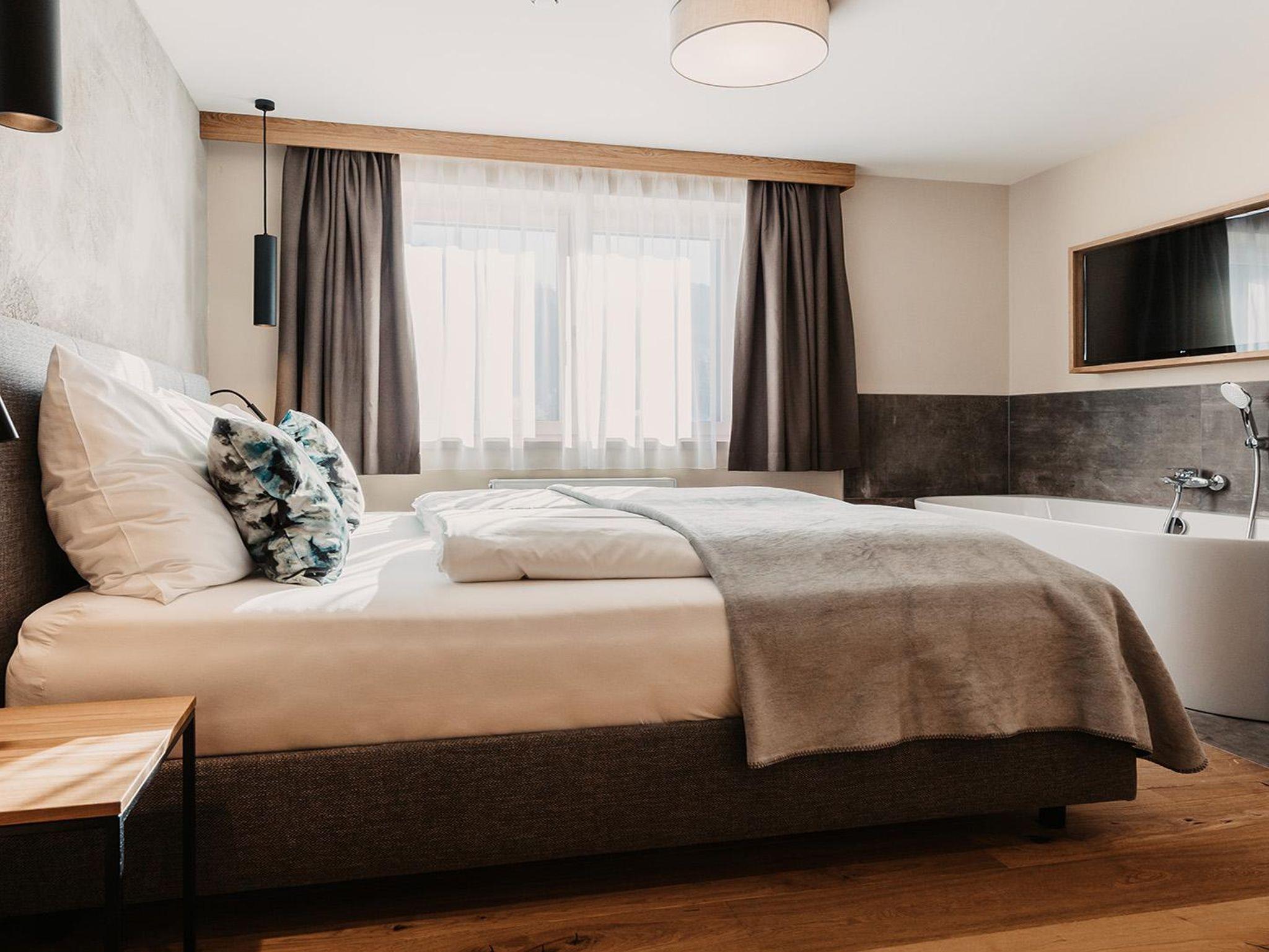 Dieses Suite Apartment bietet Ihnen 2 Schlafräume mit gemütlichen Boxspringbetten, eine große Wohnküche zum Kochen und Relaxen sowie einen Balkon. Lage: Haus LÄRCHE, Süd/Tal, Balkon südseitig,