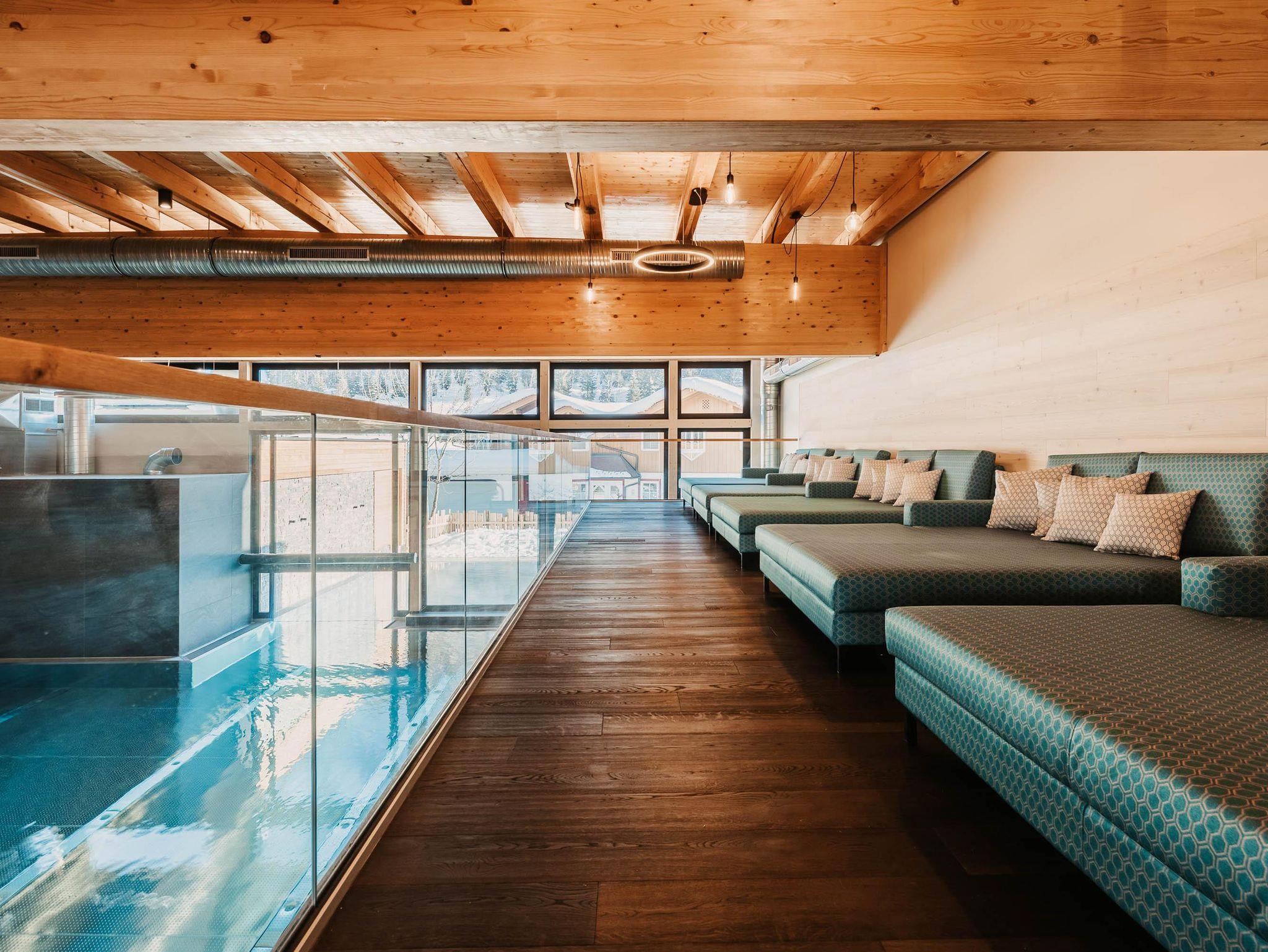 • Indoor Family Pool mit beheiztem Außenschwimmbecken, Kinderwasserrutsche, Textilsauna