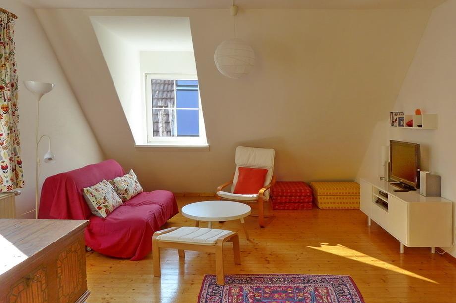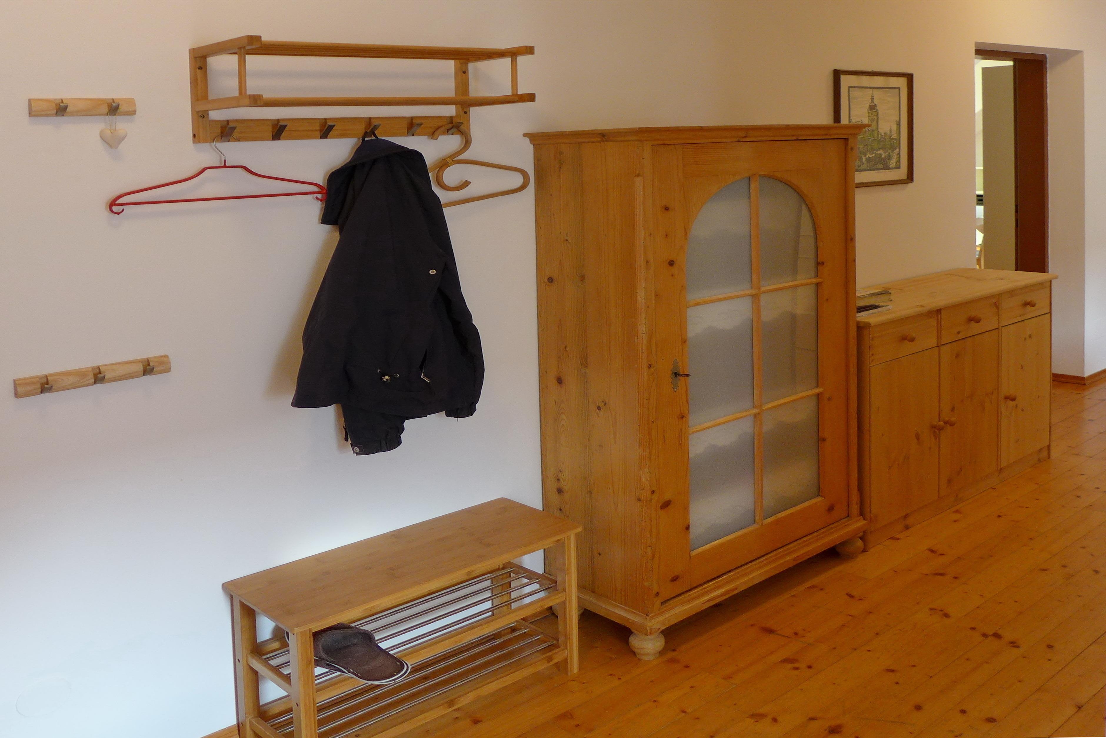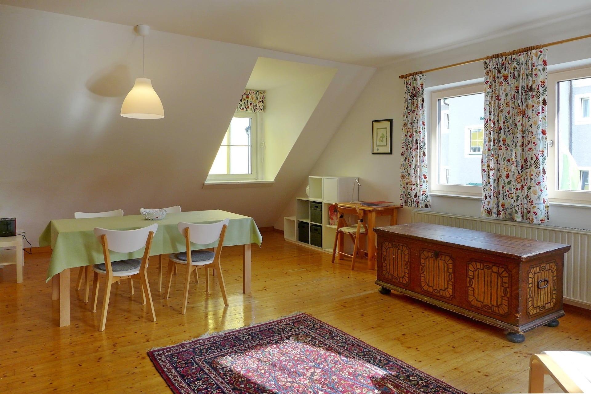 Die 80 m² große Wohnung verfügt neben dem zentralen Vorzimmer mit Garderobe, Bauernkasten, Kommode und großem Spiegel über ein gemütlich eingerichtetes Wohnzimmer mit einem großzügigen Essbereich sowie Sideboard mit Flachbildschirm (Sat-TV) und CD/DVD-Player.
