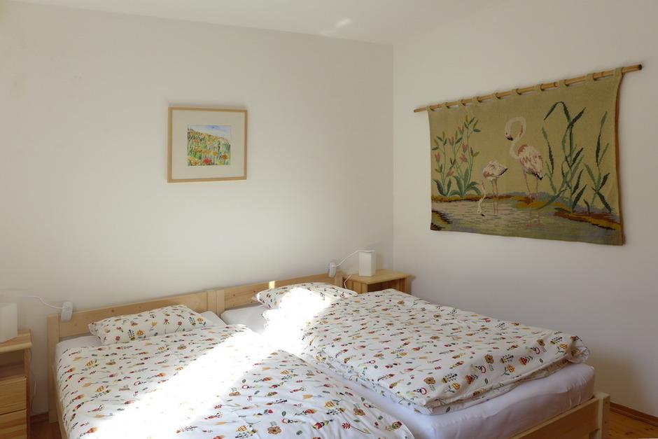 Das Schlafzimmer ist mit zwei Einzelbetten (können je nach Bedarf auch zu einem Doppelbett zusammengestellt werden), einem großem Schrank mit Schiebetüren, einer Wirtschaftsecke mit Staubsauger, Bügeleisen und -brett samt Wäscheständer ausgestattet. Jedes Bett hat zusätzlich zur Nachttischlampe eine mobile, verstell- und dimmbare Leselampe.