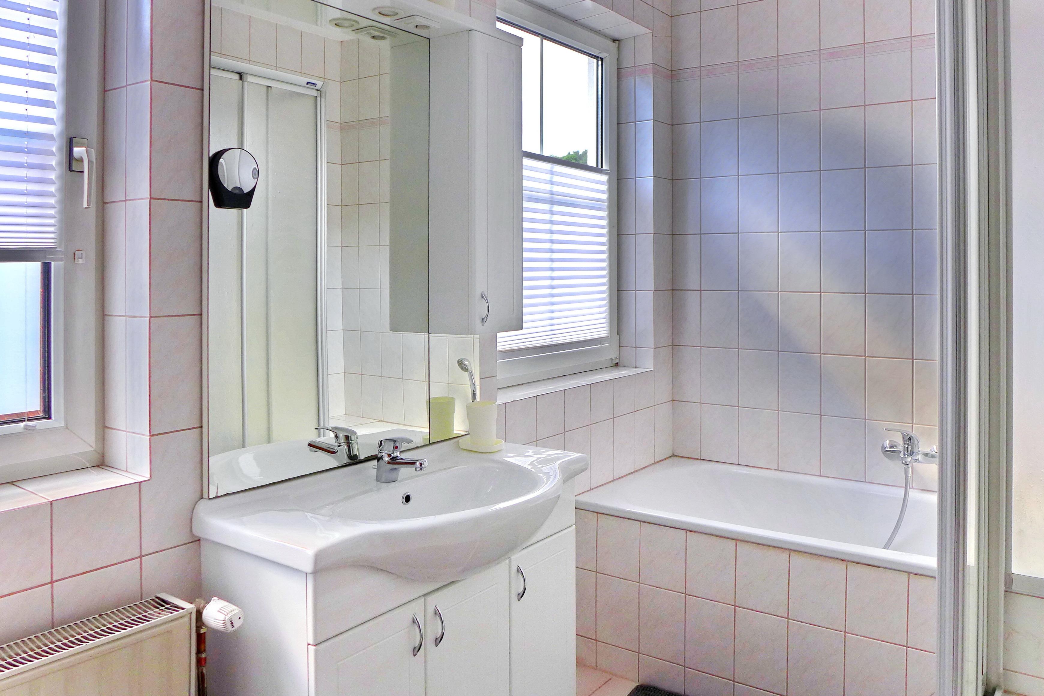 Das Badezimmer mit zwei Fenstern verfügt neben Wanne und Dusche auch über Waschtrockner, Wäschesammler, und einen Schrank mit Hand- und Badetüchern.