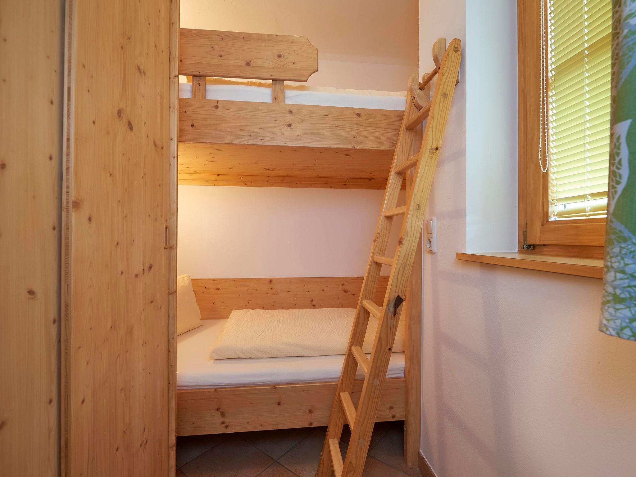 2 getrennte Schlafzimmer: 1 Zimmer mit 2 Einzelbettn und 1 Stockbett und 1 Zimmer mit Doppelbett