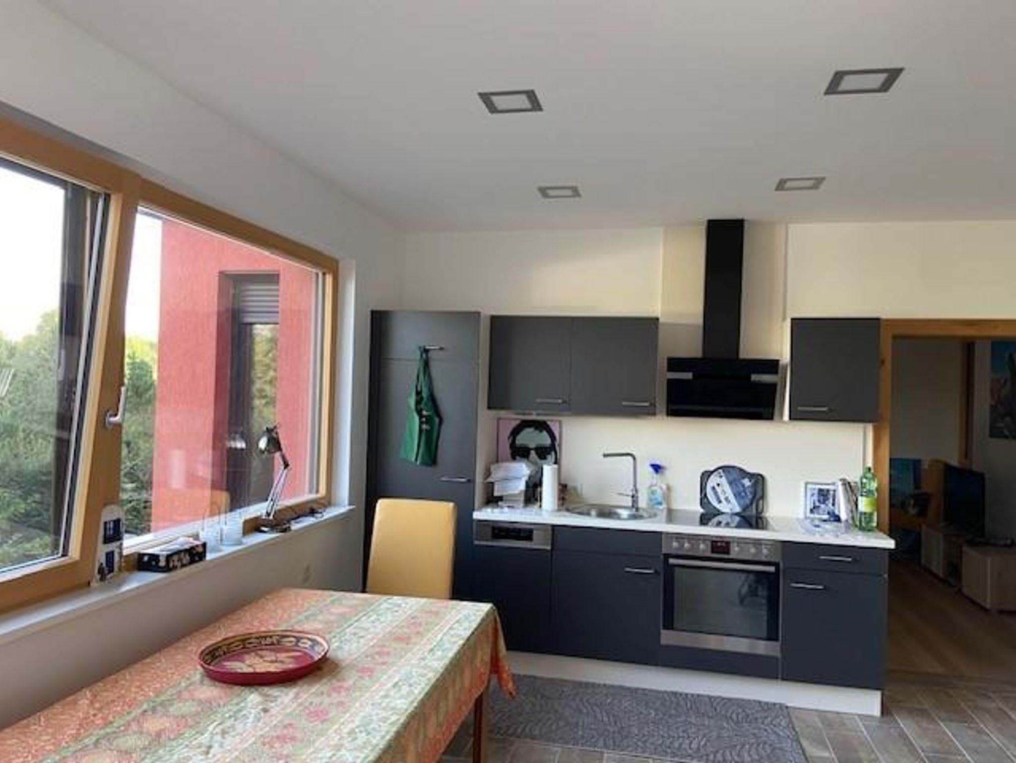 Die voll ausgestattete Küche lädt zum Kochen ein und im Wohnzimmer gibt es genügend Platz, um gemeinsam zu entspannen.