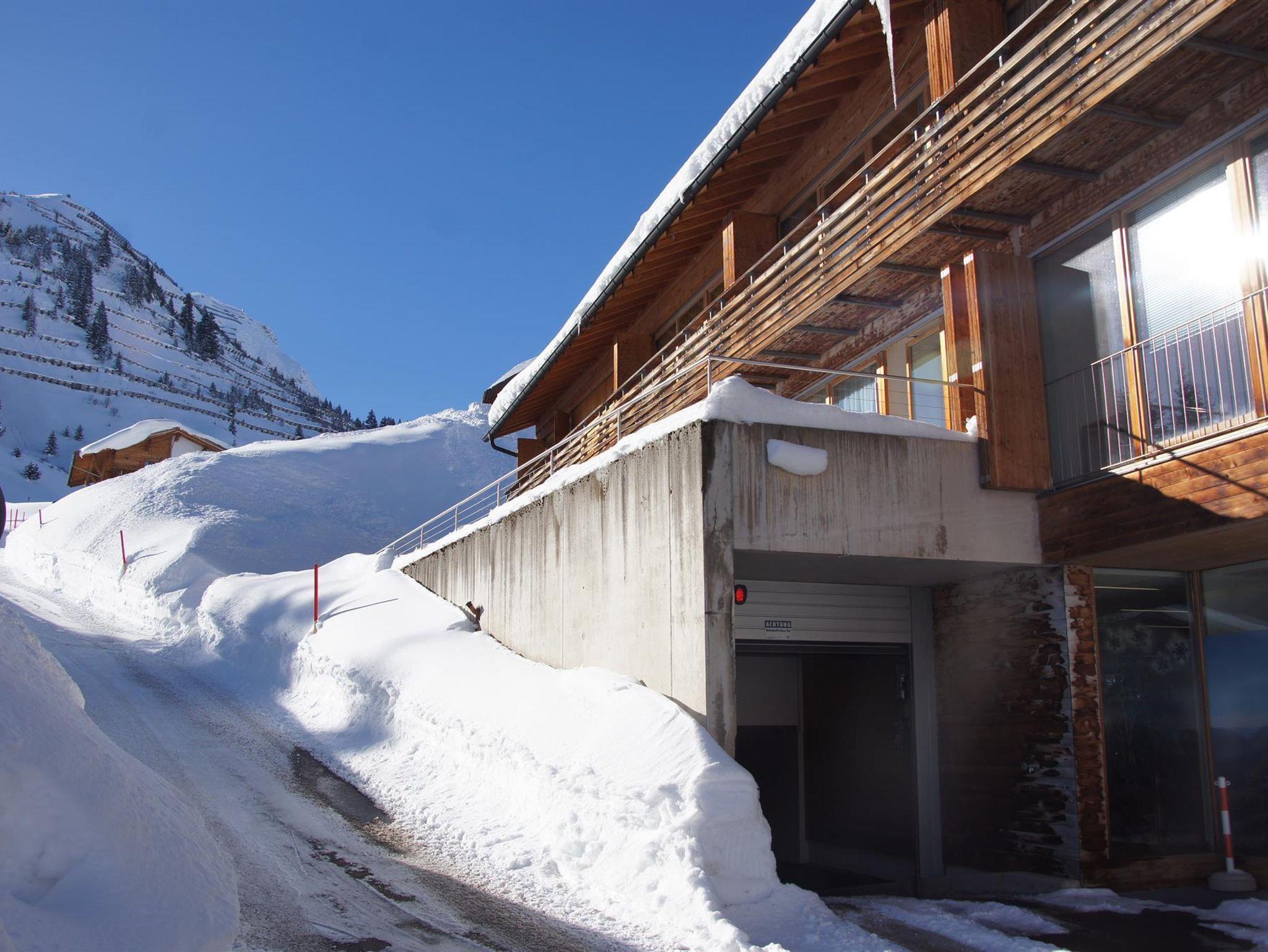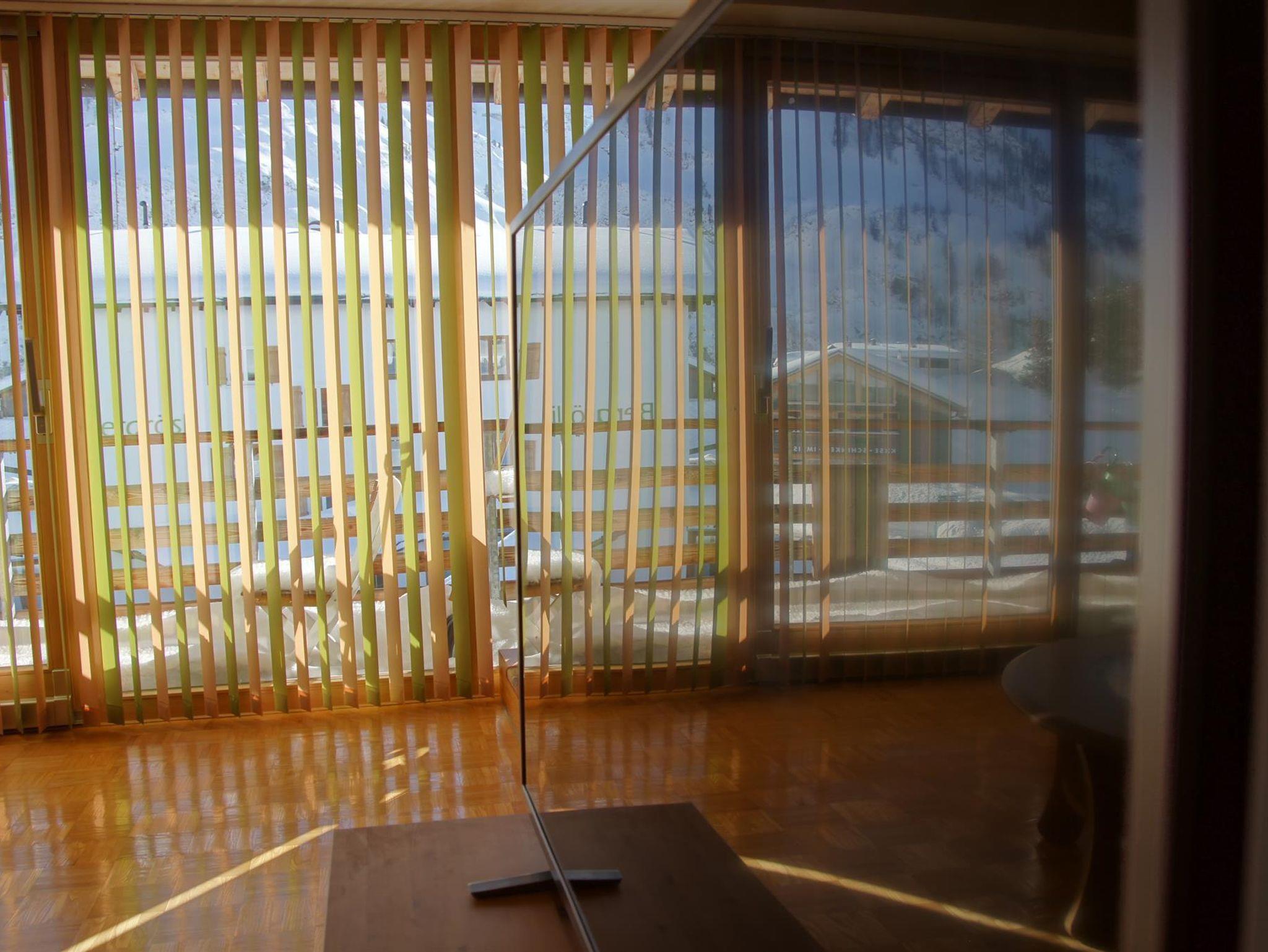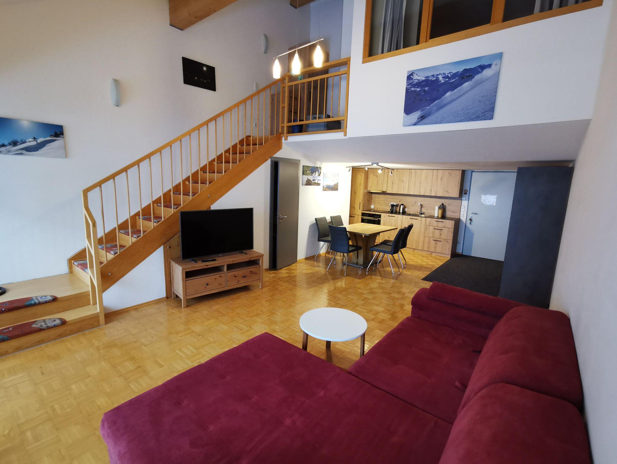 Die Maisonettewohnung befindet sich im zweiten Stock des Gemeindezentrums direkt am Dorfplatz mit der neuen Dorfbahn und Bushaltestelle. Im Gebäude steht Ihnen ein Tiefgaragenplatz zur Verfügung, ein Lift von der Tiefgarage in den zweiten Stock, eine Bank und das Tourismusbüro. Der Skiraum mit Schuhheizung befindet sich im ersten Stock. Die Skipiste geht direkt bis zur Haustüre und auch die Rodelbahn liegt nebenan. Mehrere Restaurants sind zu Fuß in wenigen Minuten erreichbar. Freies Wifi sowie Satelliten- und Kabel TV sind vorhanden (TV Diagonale 123cm). Im unteren Bereich der Wohnung sind eine Wohnküche, ein Abstellraum mit Waschmaschine, eine Garderobe, ein WC und eine Glasfront die auf einen kleinen Balkon mit wundervoller Aussicht führt. Über eine Treppe gelangen Sie in den oberen Stock mit zwei getrennten Schlafzimmern (einmal Standartgröße, einmal mit französischem Bett und Dachfenster) und einem Bad (Dusche, WC, Doppelwaschbecken) mit Dachfenster.