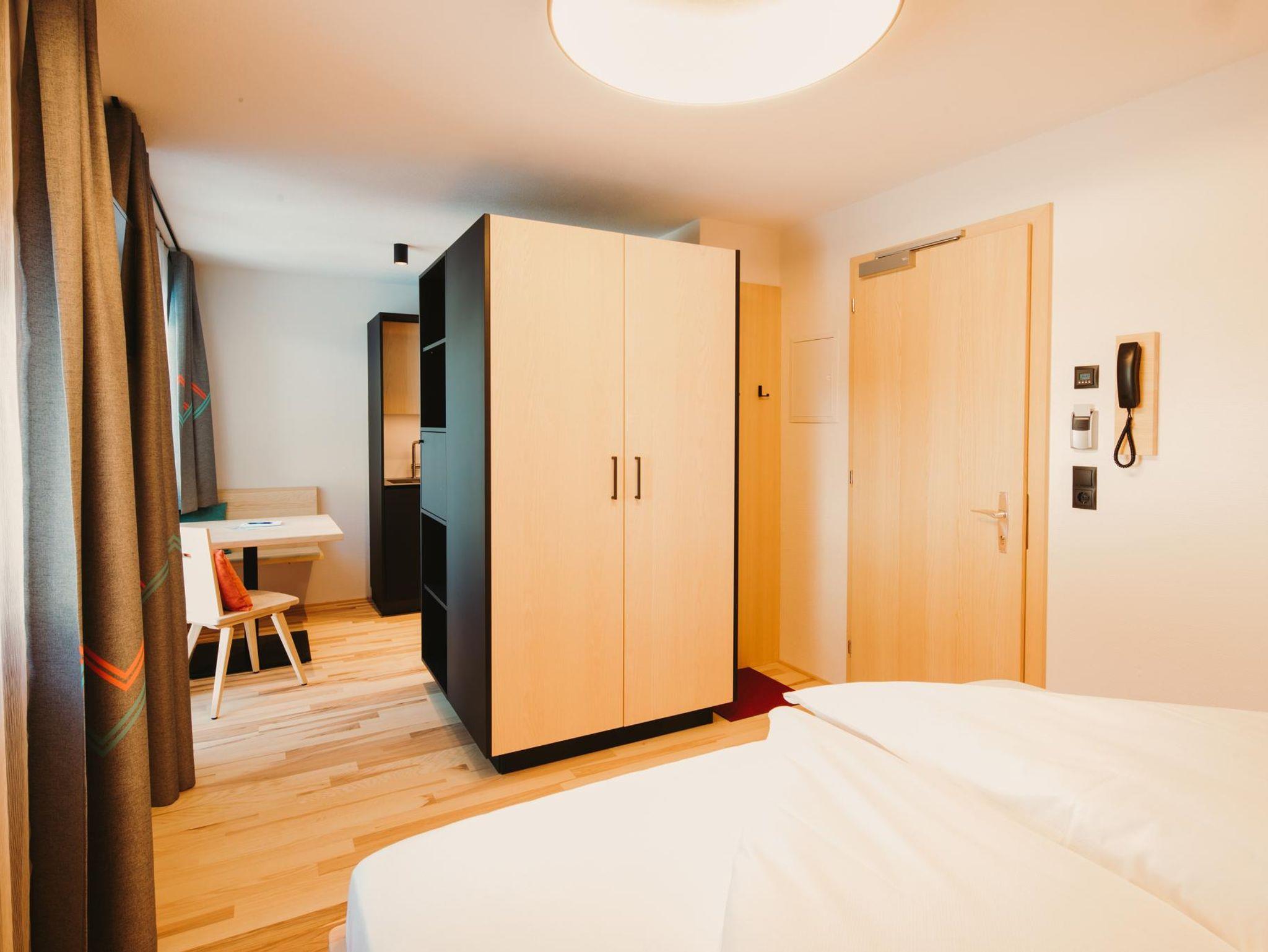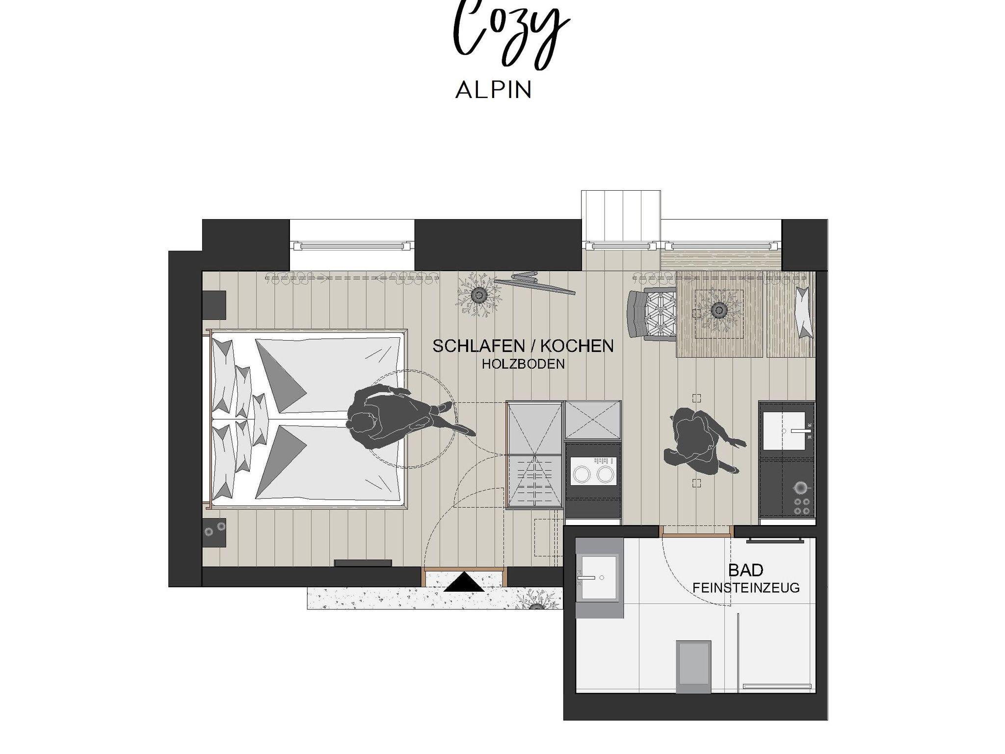 Das Cozy Alpin ist eines unserer ruhigsten Doppelstudios und überzeugt mit fabelhaftem Bergblick vom französischen Balkon aus. Hochwertiges Bett aus Zirbenvollholz für pure Erholung während des Schlafs. Kitchenette für die nötige Flexibilität bei der Verpflegung. Kleiner Essbereich, Badezimmer mit Walk-In Regendusche und WC. Glasfaser-TV, Telefon, Safe und kostenloses WLAN.