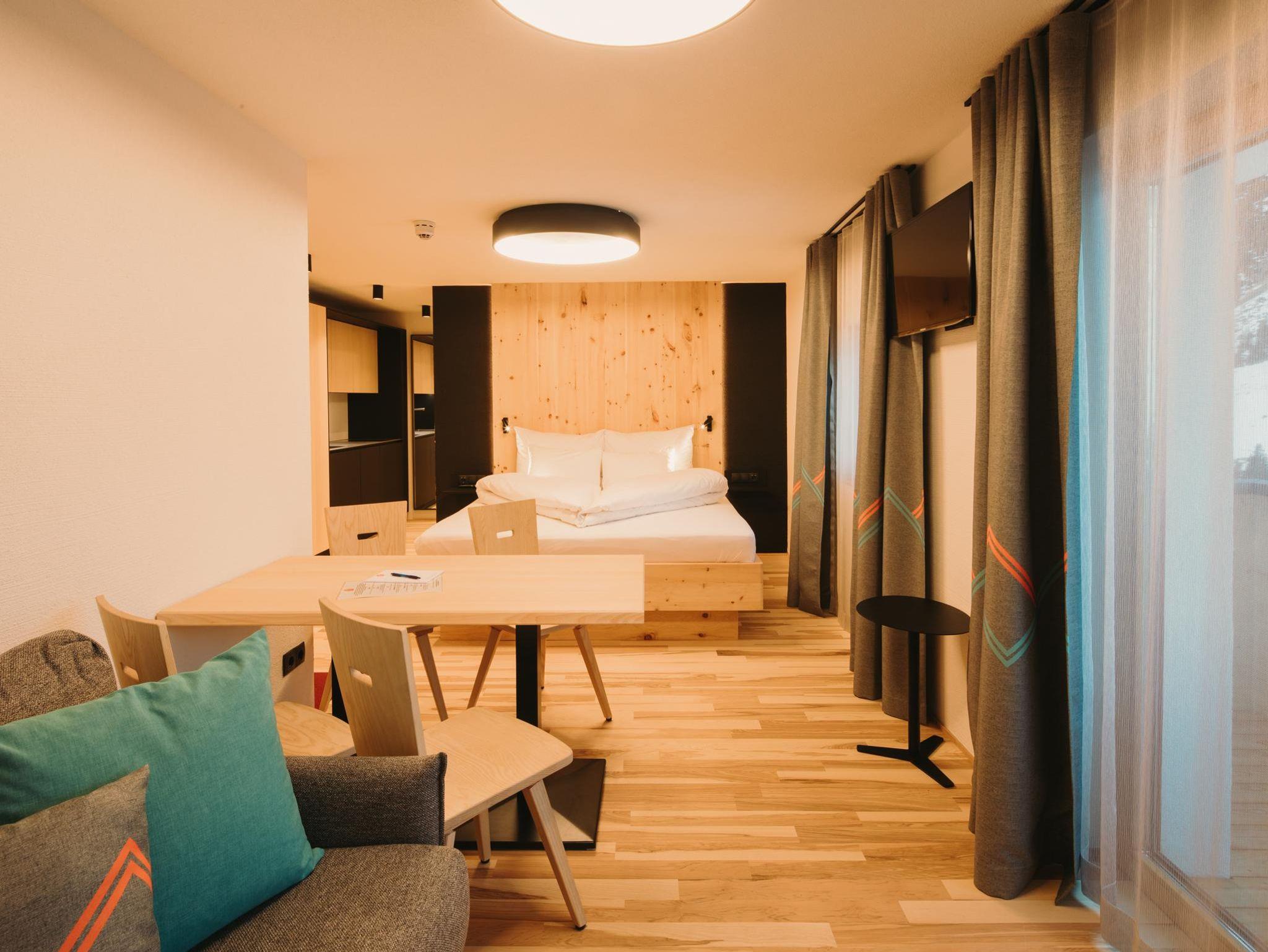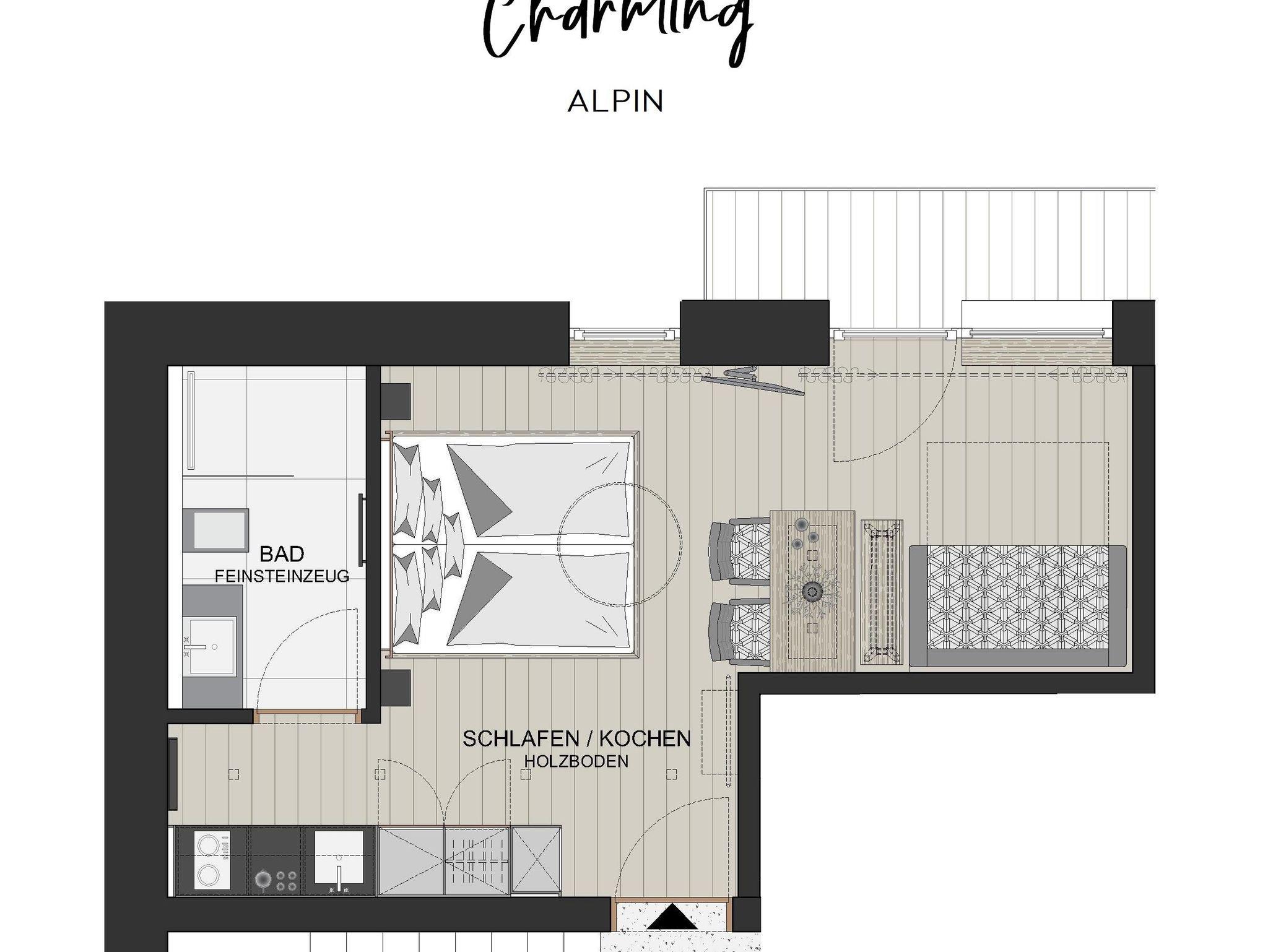 Unser ruhigstes Familienstudio Charming Alpin überzeugt mit atemberaubenden Bergblick vom Balkon aus. Helles Eschenholz gepaart mit dunklen Akzenten und natürlichen Materialien sorgt für sofortigen Wohlfühl-Effekt. Großzügig für 2 Personen, gemütlich für Familien mit einem Kind oder zwei Kindern. Wohn- und Schlafräume sind offen gestaltet mit hochwertigem Doppelbett aus Zirbenvollholz, Kitchenette, Essbereich und Qualitäts-Schlafcouch für die 3. und 4. Person. Badezimmer mit Walk-In Regendusche und WC. Glasfaser-TV, Telefon, Safe