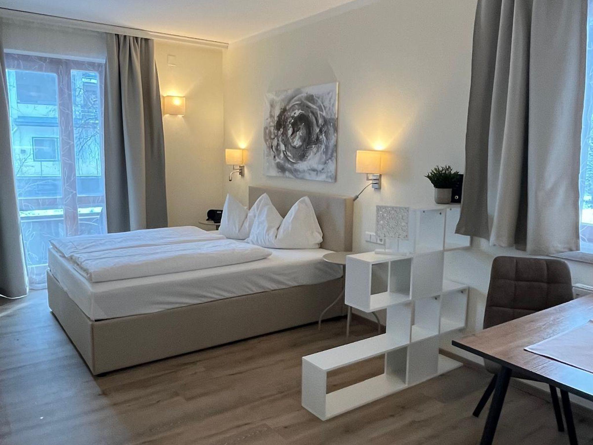 1 Schlafzimmer mit 1 Queensizebett, WC/Dusche getrennt, SAT-TV, Radio, Telefon, Zimmersafe, Brötchenservice, Balkon, Gratis W-LAN.