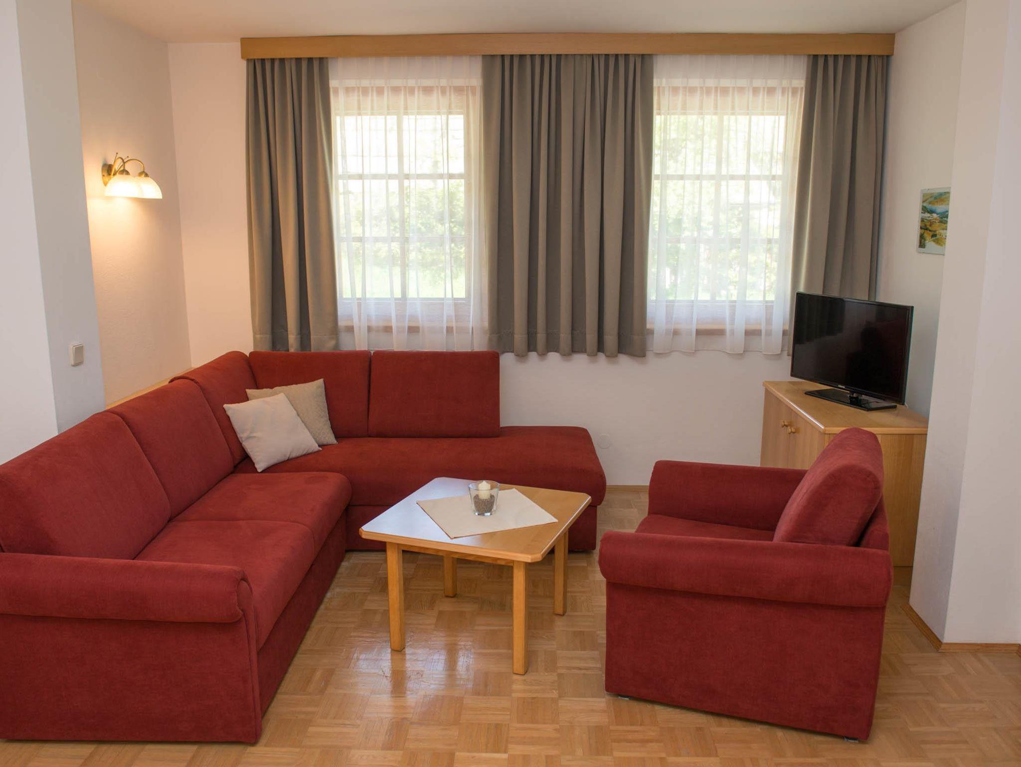 Ferienwohnung mit 70 m² für 3-6 Personen Lage: Erdgeschoss, Nordost, Talblick, Morgensonne Wohnzimmer mit Doppelschlafcouch und Essecke 2 Schlafzimmer mit Doppelbetten kleine Küche mit Spülmaschine Vorraum Badezimmer mit Doppelwaschbecken und Dusche WC Balkon