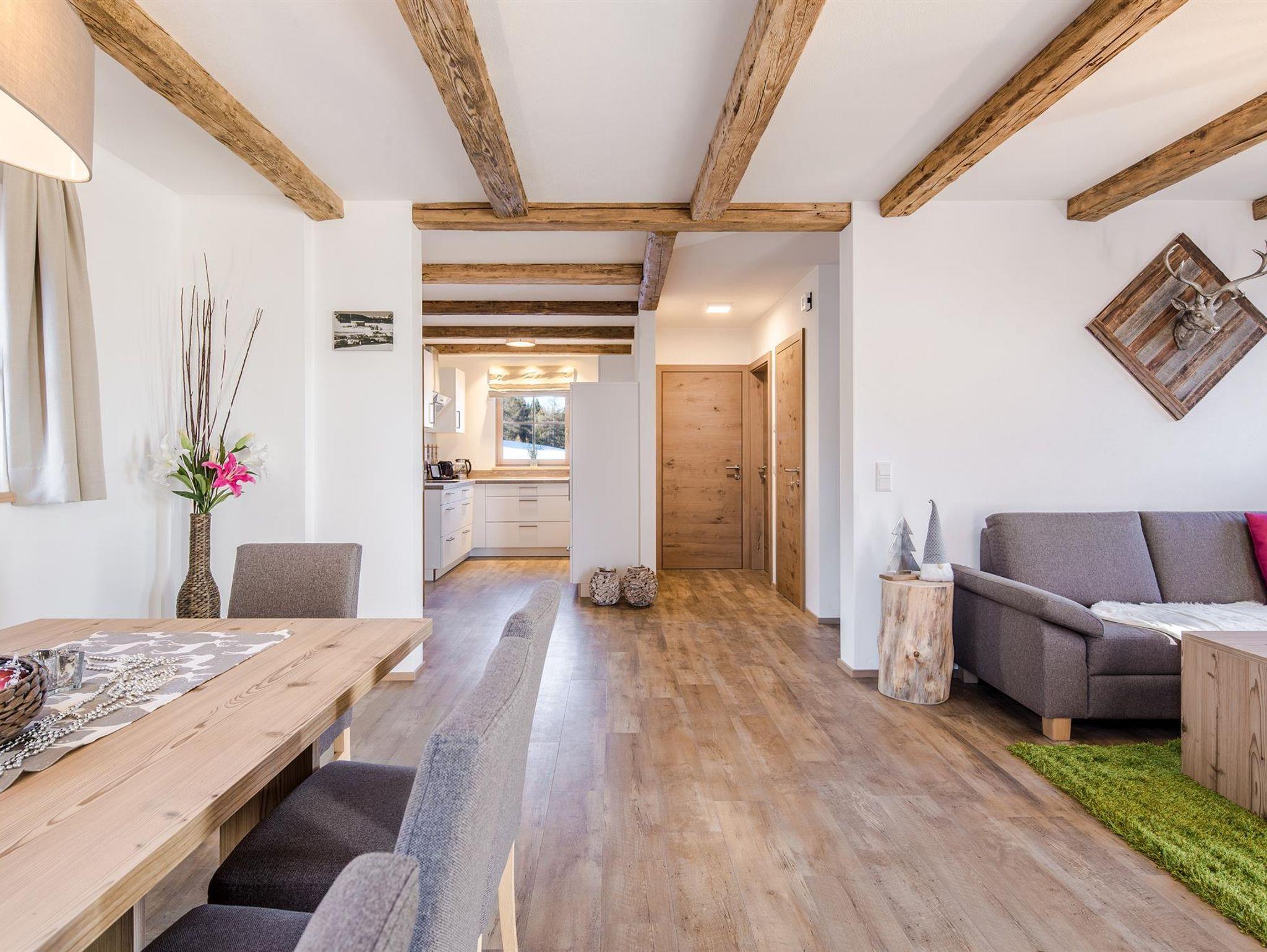Zwei Stile sind kombiniert: Der Bauerntisch und die Holzsessel identifizieren Küchen- und Essbereich zu typischer Ländlichkeit, der Wohnbereich ist im angesagten New-Country-Stil gehalten. Dem Gast stehen 4 Schlafzimmer, 3 Badezimmer, eine eigene Hüttensauna und eine schöne Sonnenterrasse zur Verfügung.
