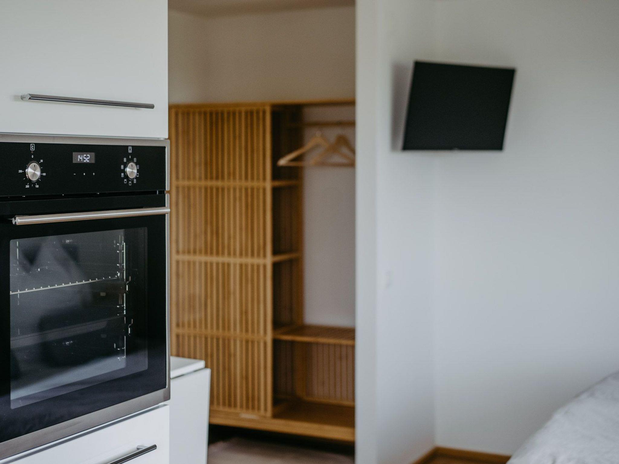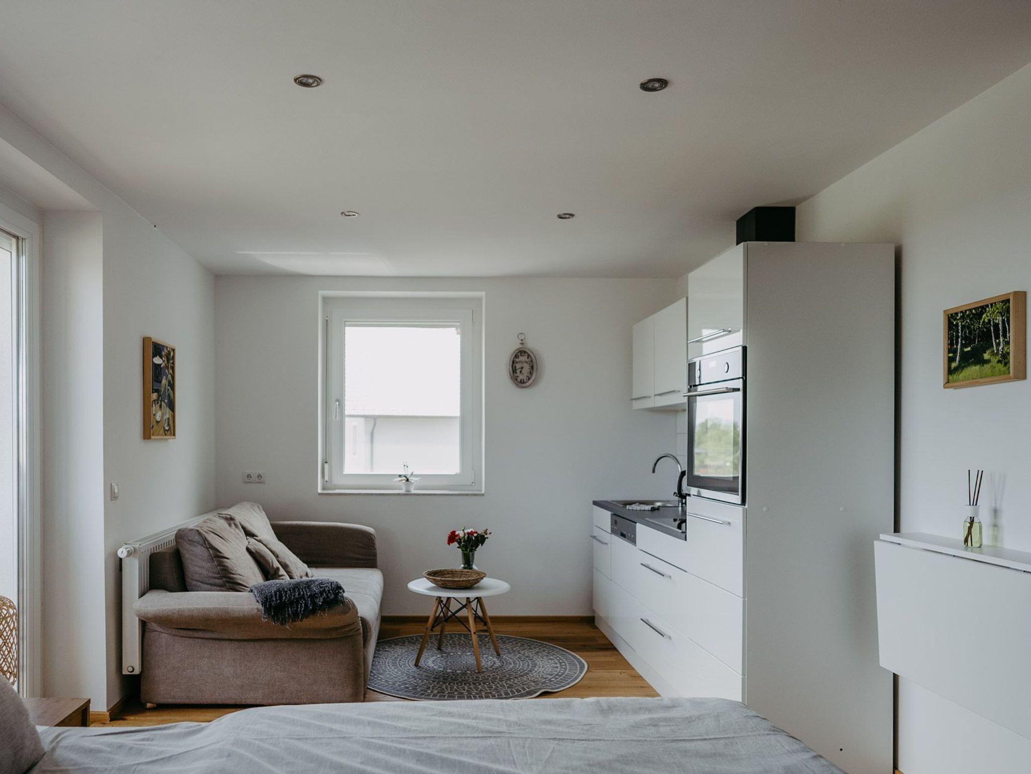 28m² Apartment, 1 King Size Bett, Smart TV und Safe, ausziehbares Schlafsofa in Doppelbettgröße, Küchenzeile, überdachter 9m² Balkon Richtung Westen (Sonnenaufgang), Badezimmer,