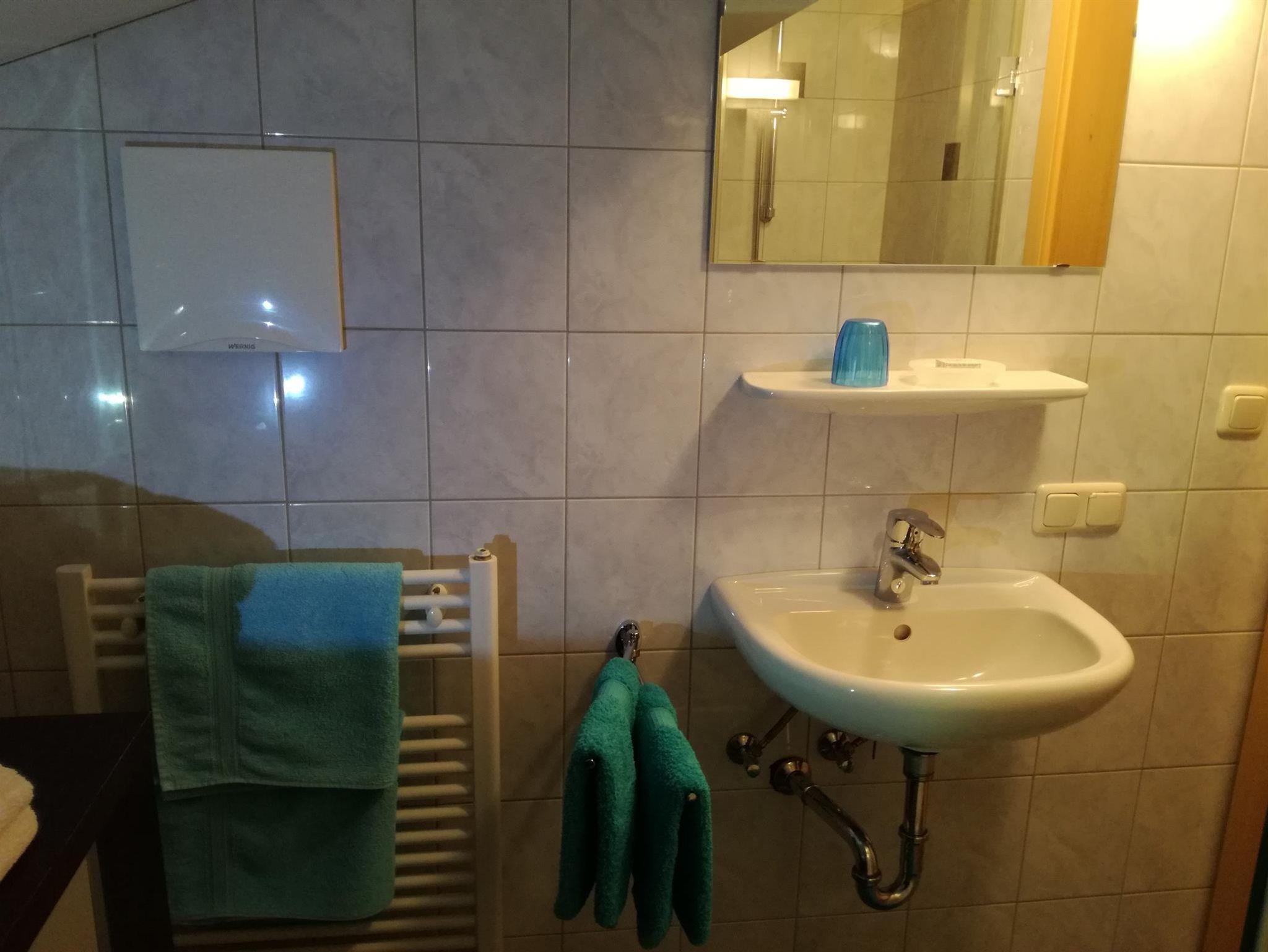 -- Bad/WC getrennt – mit Waschgelegenheit im WC, Handtücher, Duschtücher, Toilettenpapier, Haartrockner