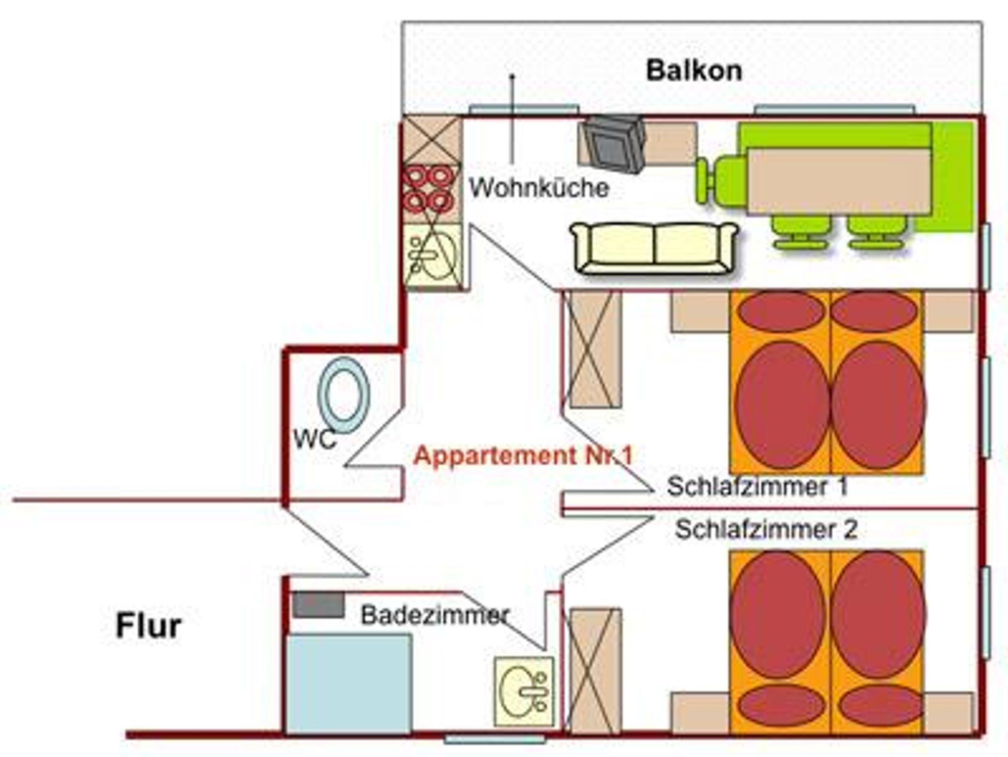 Schönes, helles, gemütliches, großes, komplett ausgestattetes Appartement mit geräumigen Wohnraum, 2 Schlafzimmer und ein großer Balkon.
