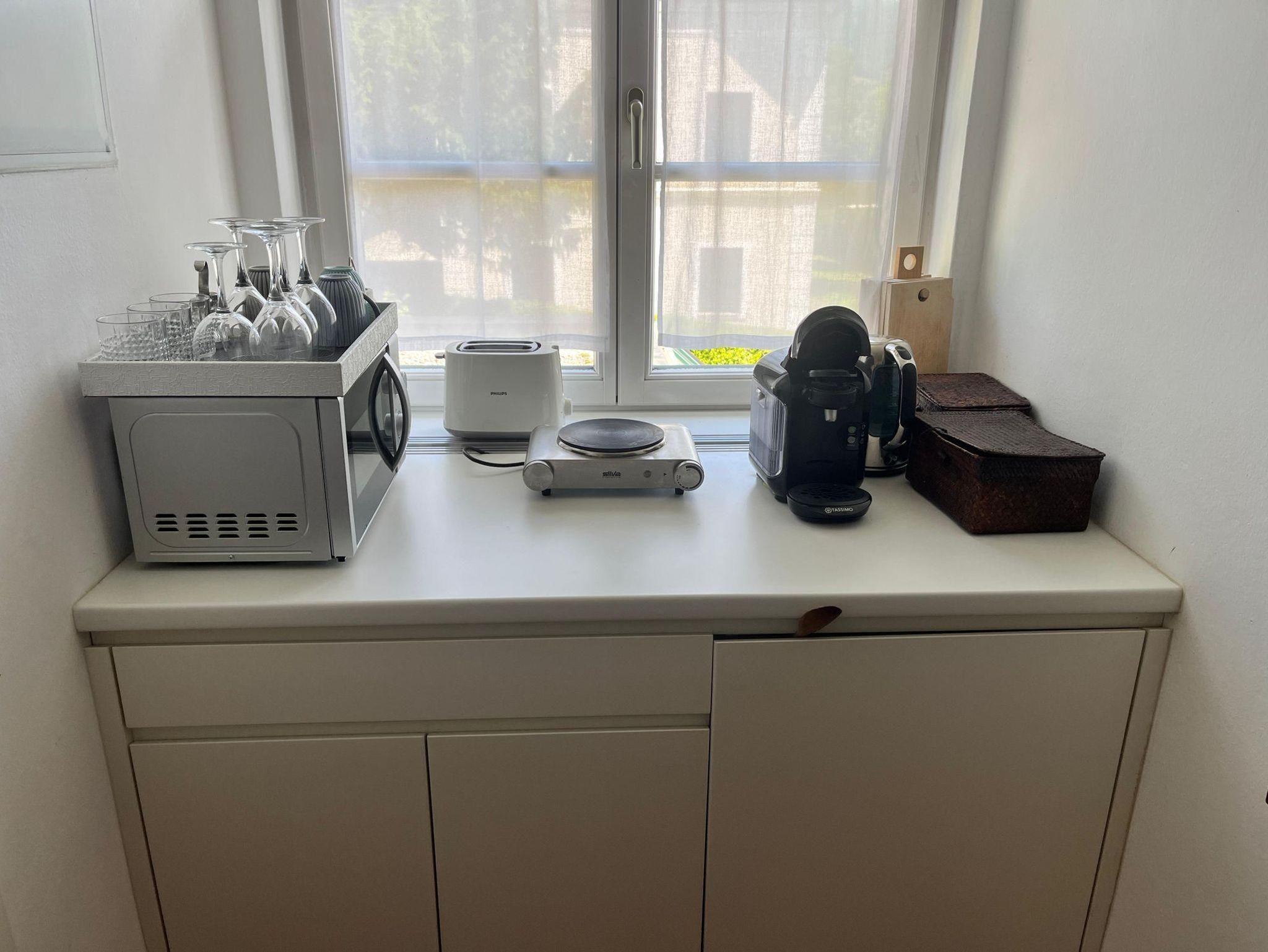 Küchenzeile mit Kühlschrank - Tee/Kaffee/ - Toaster und Mikro - dazu jeweils eine Sitzgruppe auf der Gartenterrasse.
