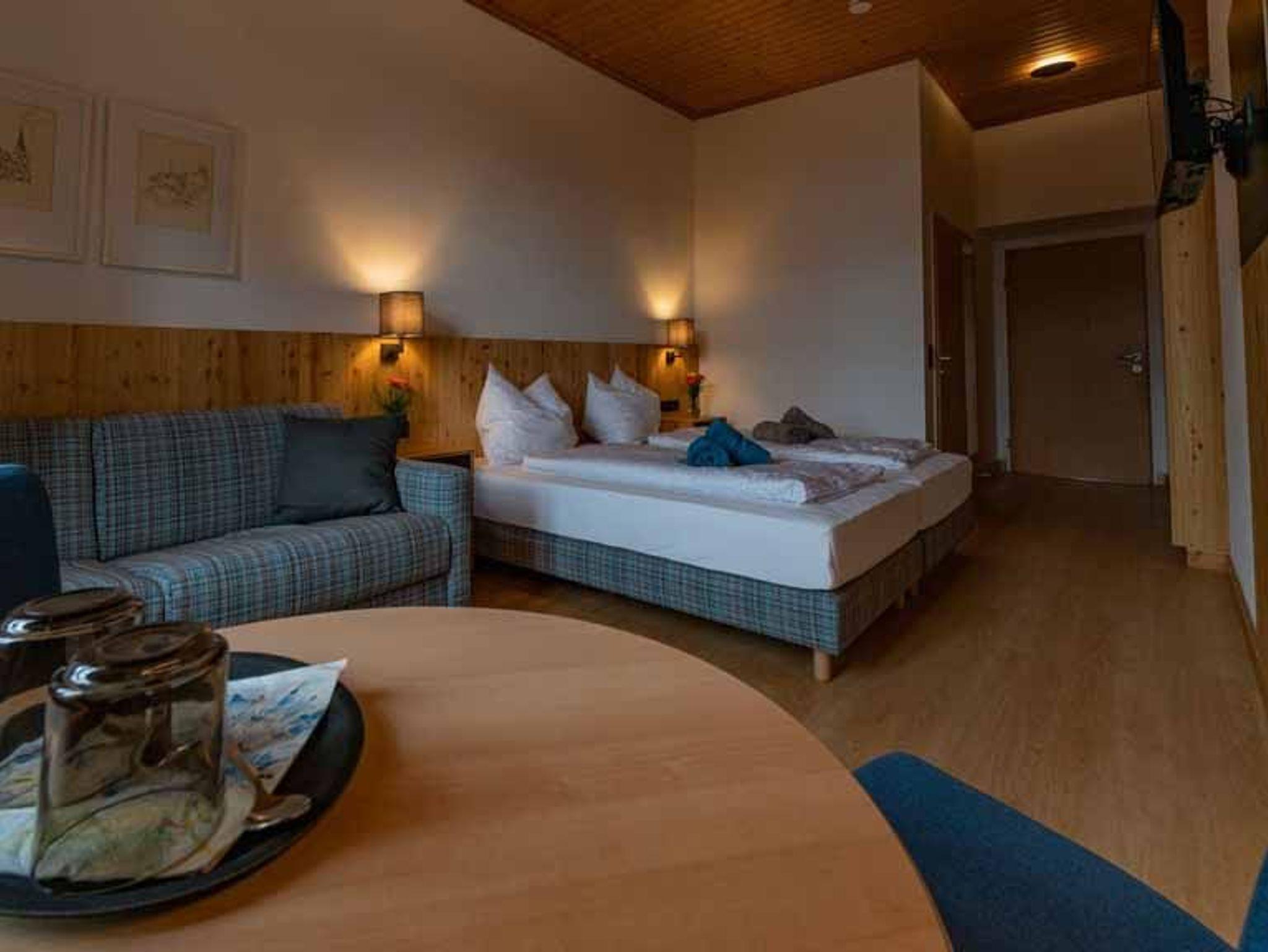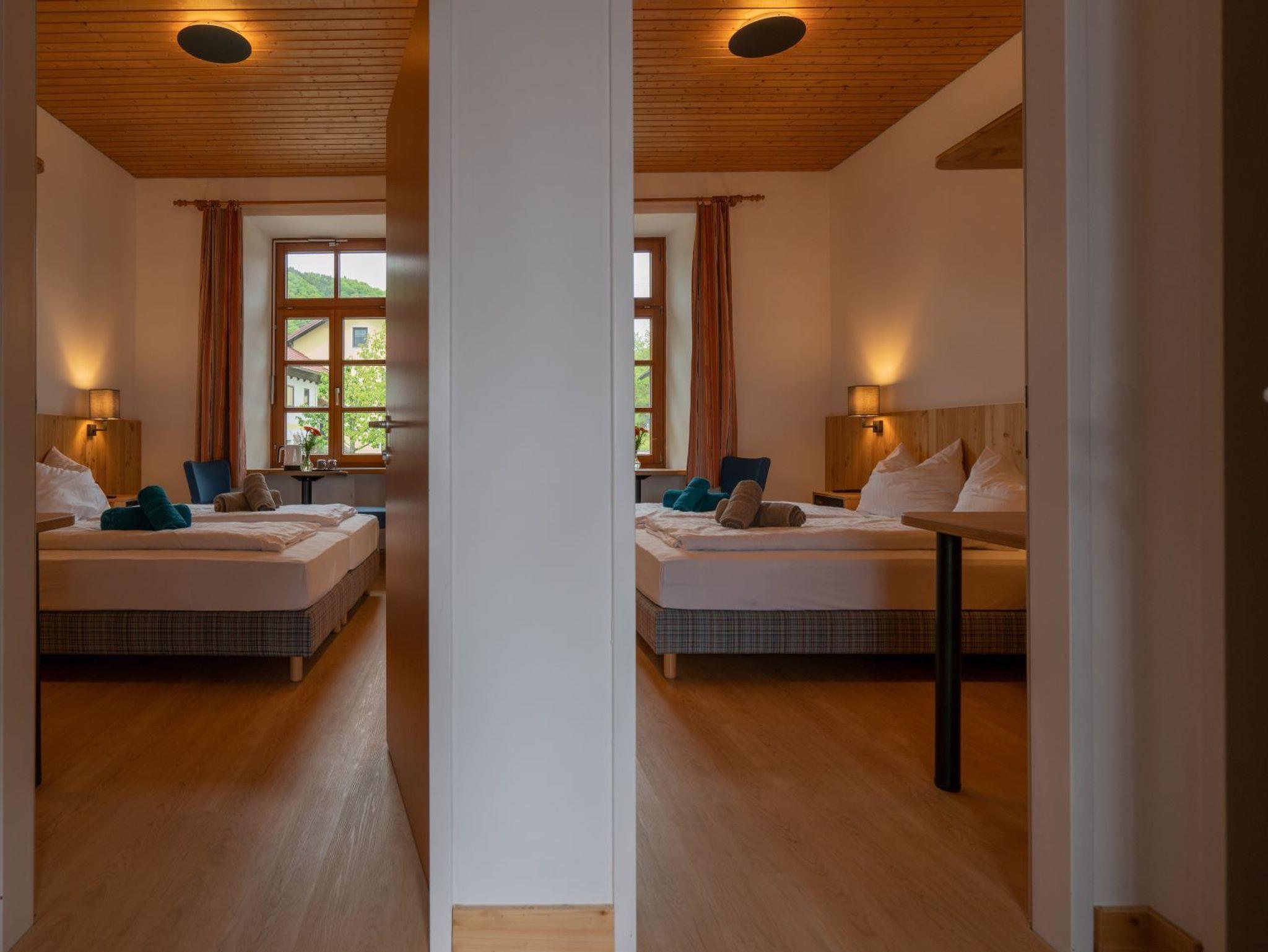 All unsere Familienzimmer befinden sich im 1. Stock unserer Pension. Dieses ist ein sehr helles, freundliches, neu renoviertes Zimmer mit Doppelbett, Sitzgelegenheit und Schlafsofa für 1 Person. In diesem Zimmer kann bei Bedarf ein Gitterbett beigestellt werden. Alle Familienzimmer sind ausgestattet mit Kabel-TV, Wasserkocher und Schranksafe. Das Badezimmer ist mit Dusche, WC und einem Föhn ausgestattet.