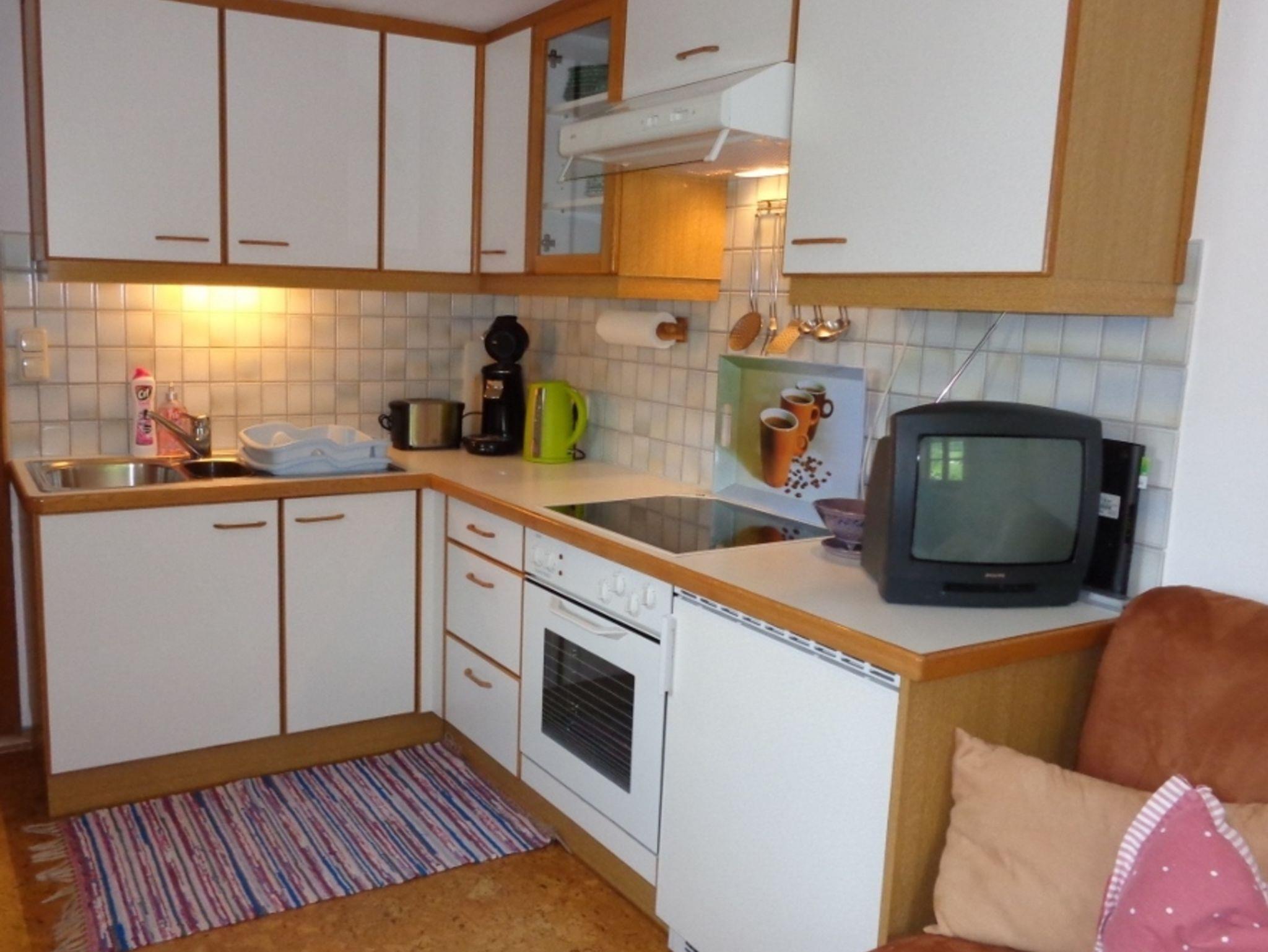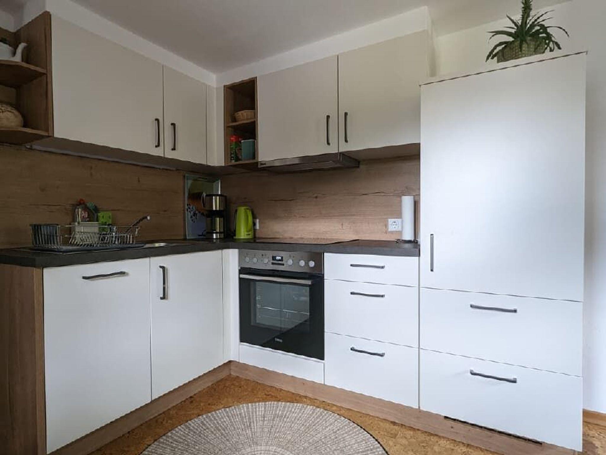 Die Küche ist ausgestattet mit einem Kühlschrank mit Gefriermöglichkeit, einem Backrohr, einem Herd mit 4 Platten, Wasserkocher, Kaffeemaschine, Toaster, Töpfen-Pfannen, Gläser sowie Tafel- und Kaffeegeschirr für 6 Personen uvm.