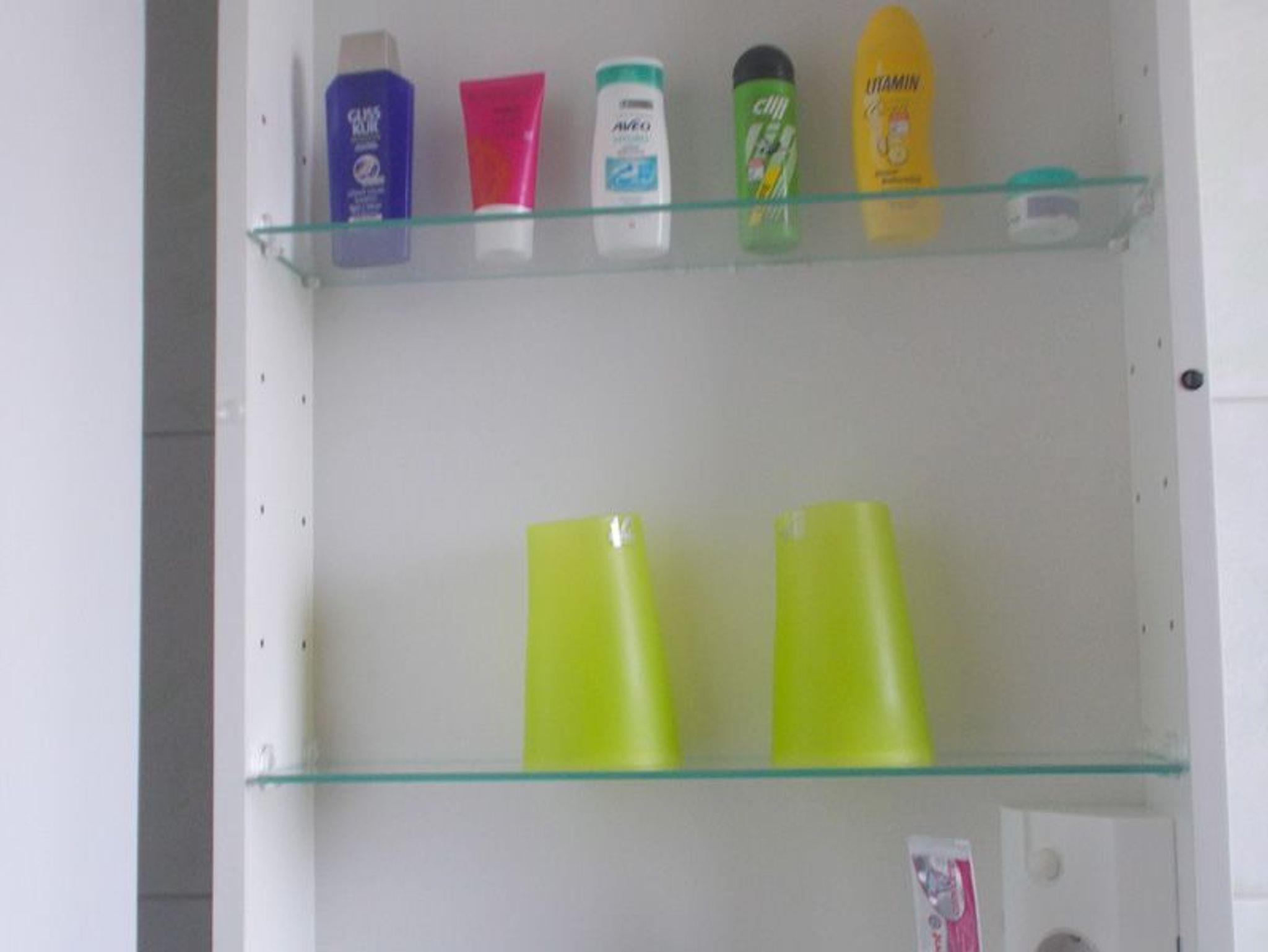 Spiegelschrank im Bad ausgestattet mit kleinen Proben (Shampoo, Duschgel, Zahnbürste/Zahnpasta...)