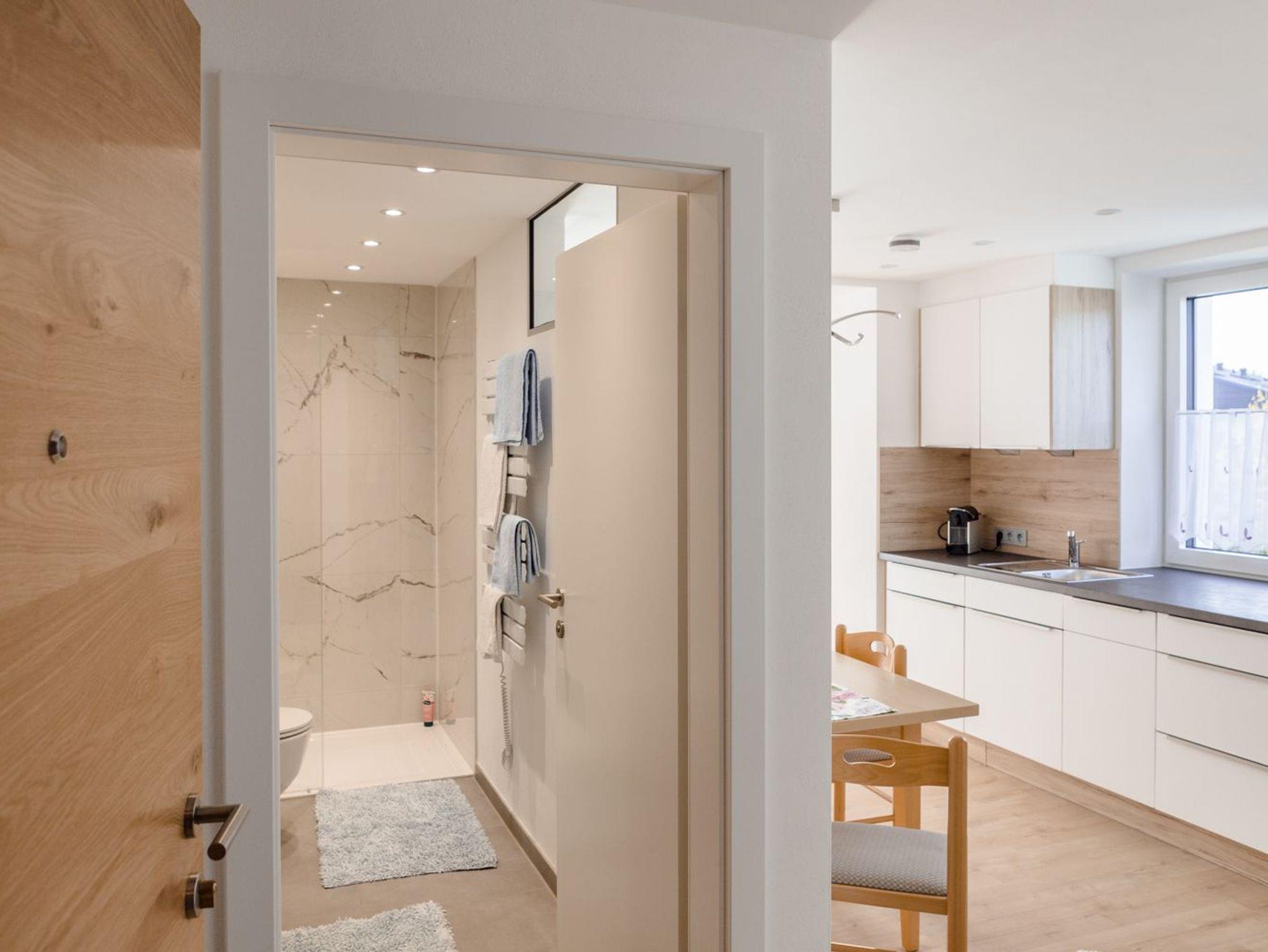 Das Tageslichtbad wirkt besonders hochwertig: eine ebenerdige Dusche, edle Fliesen und ein klarer, moderner Stil schaffen ein Gefühl von Spa-Atmosphäre.