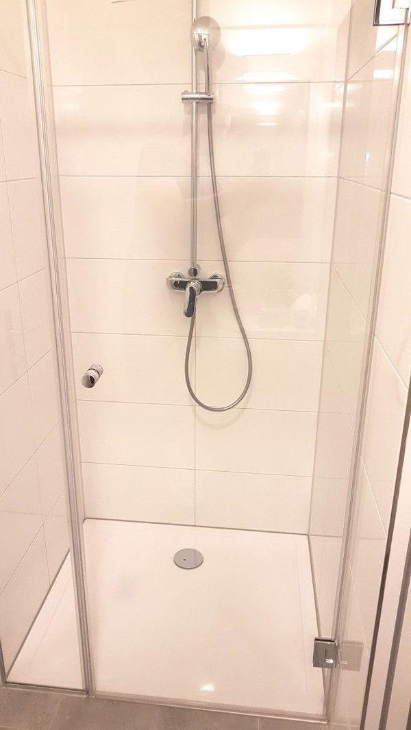 Das Badzimmer bietet eine bodentiefe Dusche und WC.