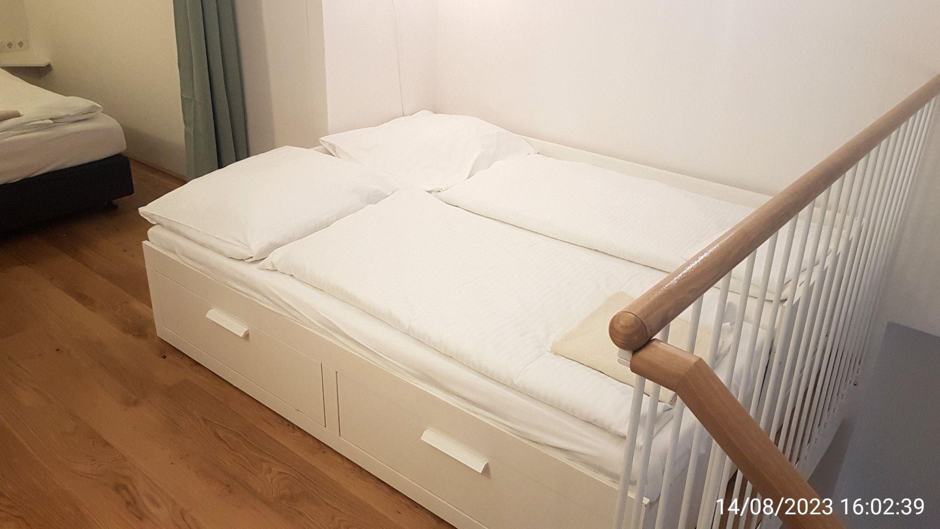 Im oberen Bereich der Gallerie befindet sich das kuschelige Schlafzimmer, davor ein Galleriebereich mit einem Schlafsofa (richtige und komfortable Matratze, wahlweise ausziehbar zu einem Doppelbett).
