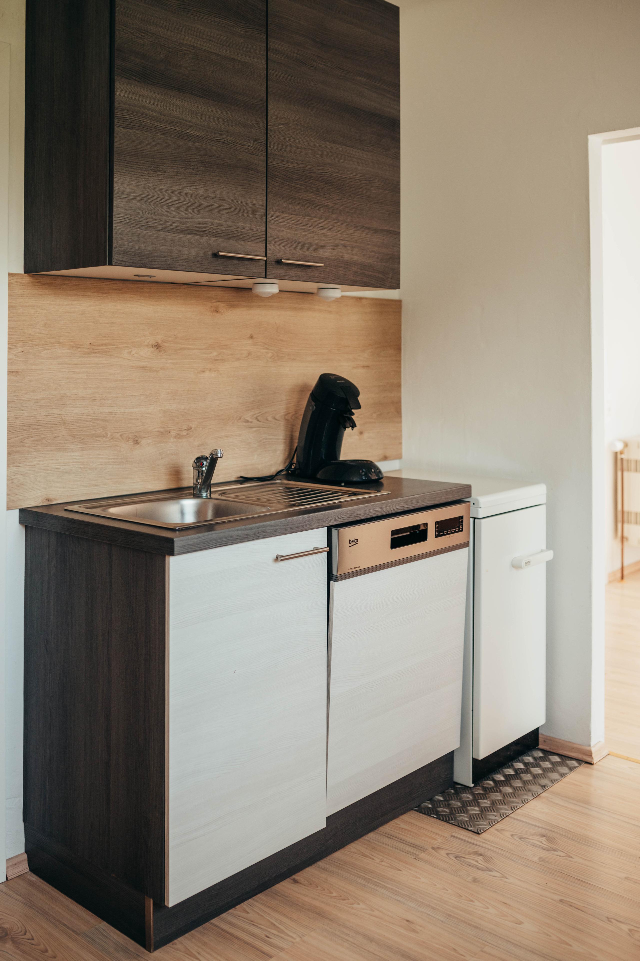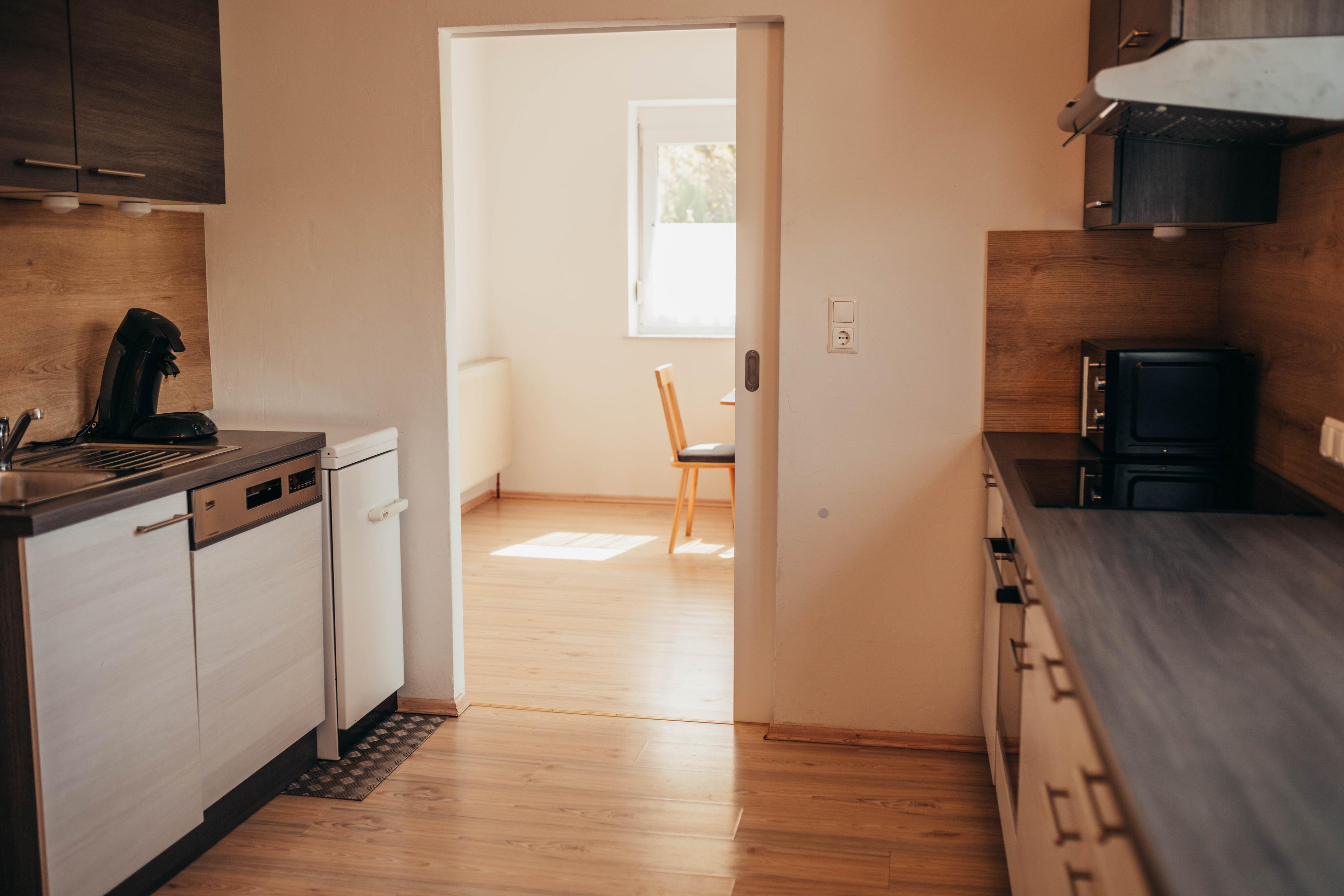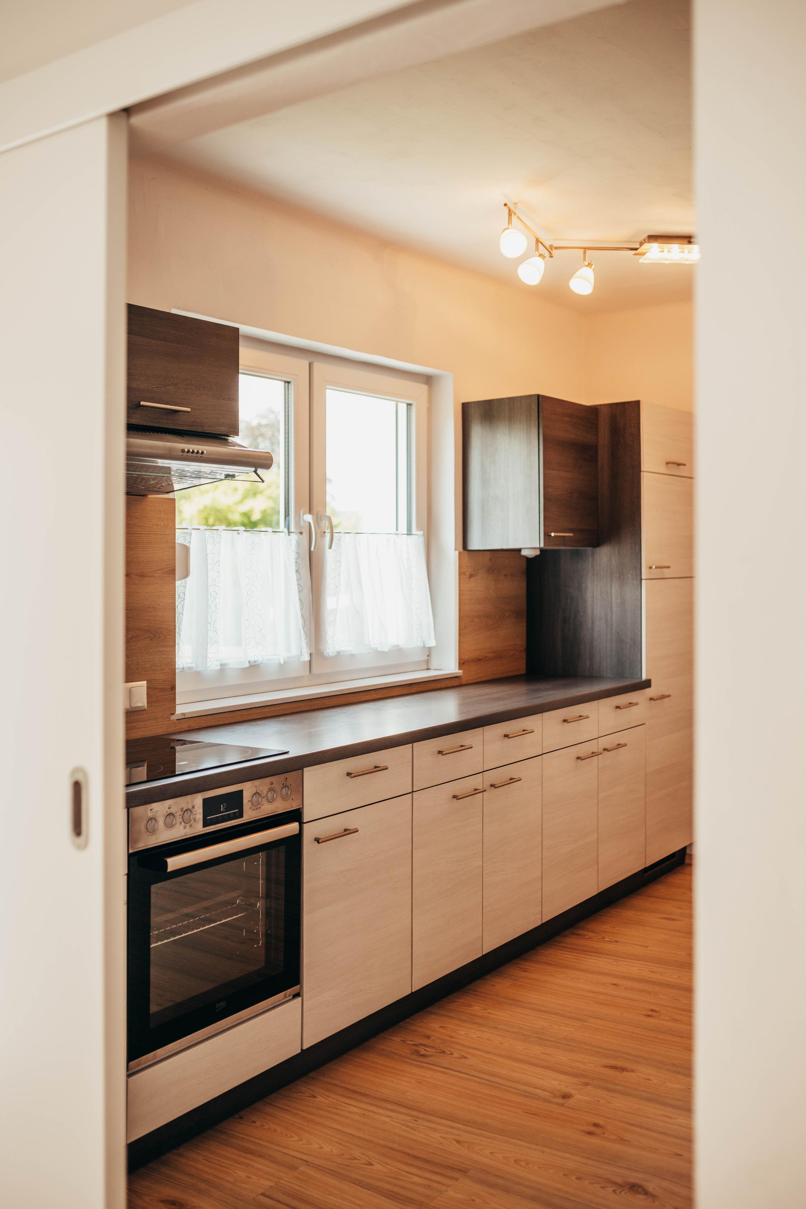-) Voll ausgestattete Küche mit Geschirrspüler, Herd, Backofen, Kühlschrank mit Gefrierfach