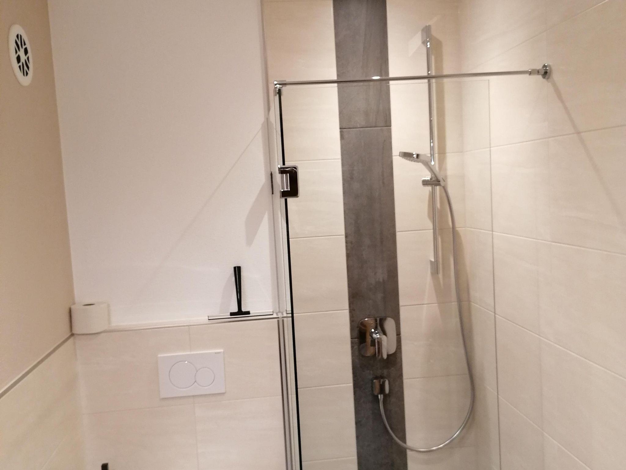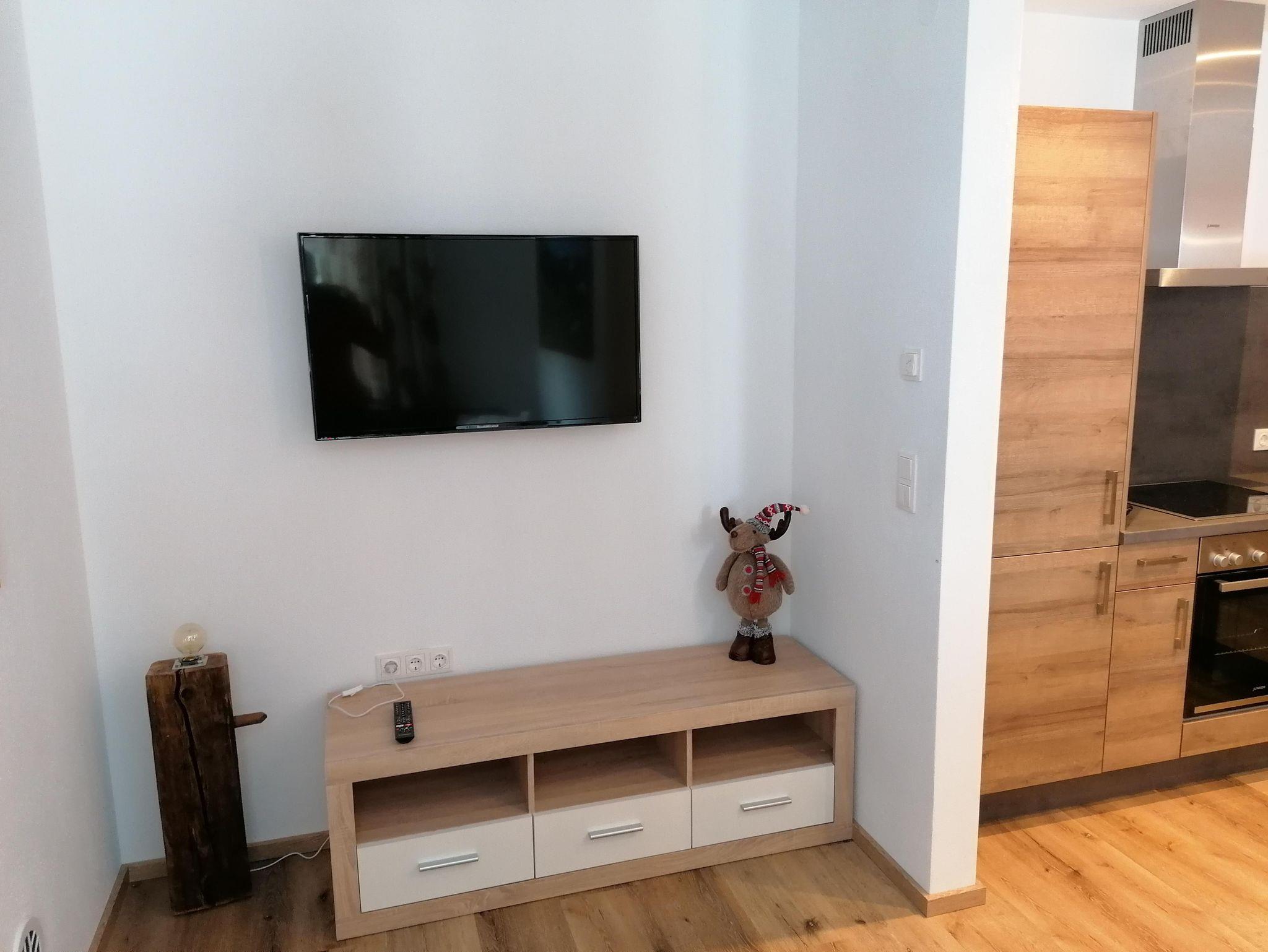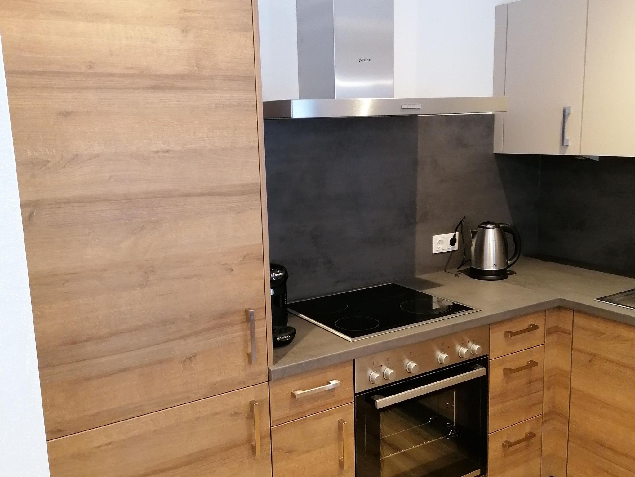 Für 4 Personen, 45 m², neuwertig, Schlafzimmer mit Doppelbett, Wohnzimmer mit Schlafcouch für 2 Personen, Küche, Wohnraum, Badezimmer mit Dusche, Waschbecken, WC, Sitzecke, Couch, TV im Wohnzimmer, gut ausgestattete Küche, Wohnung im Parterre.