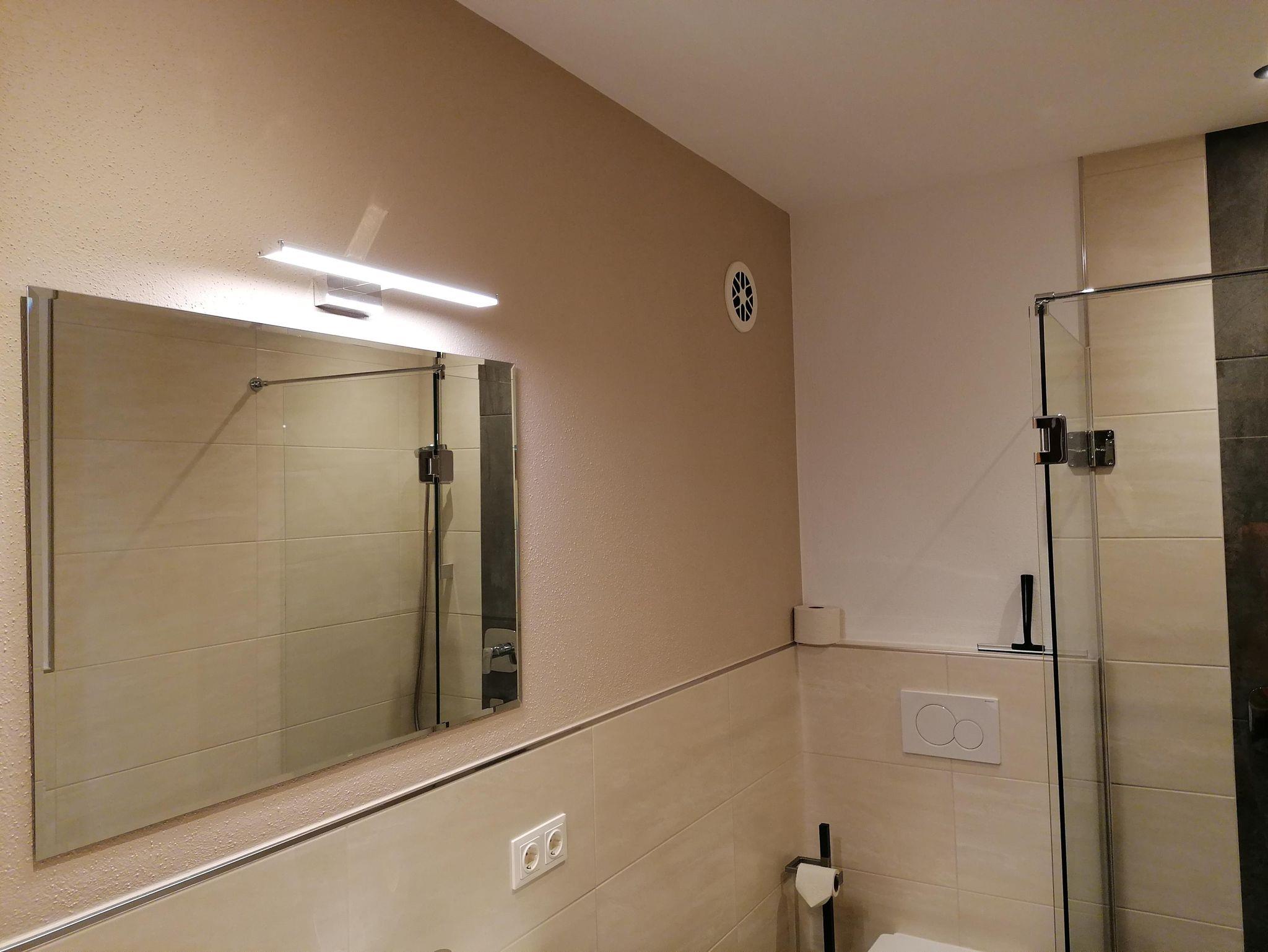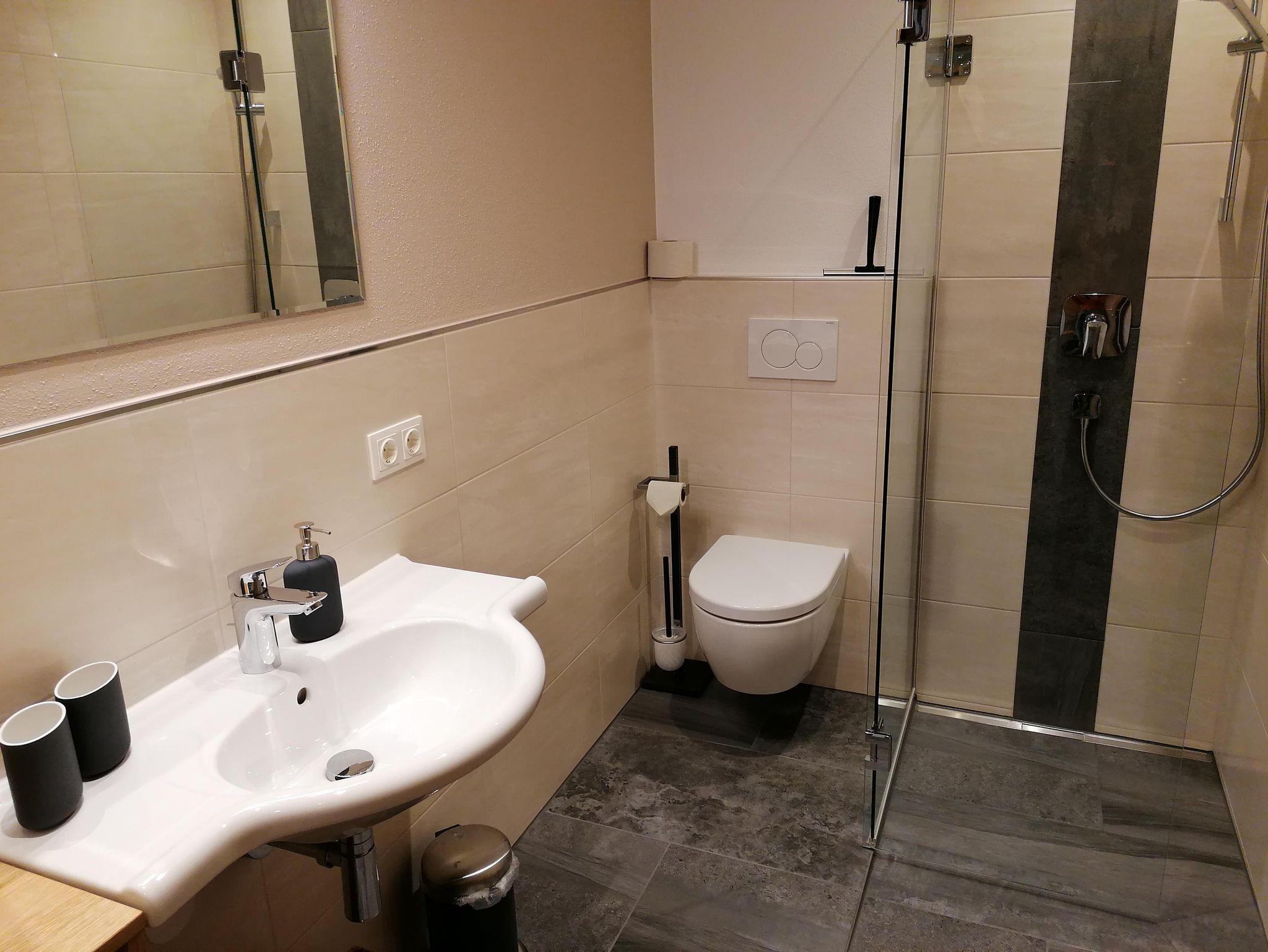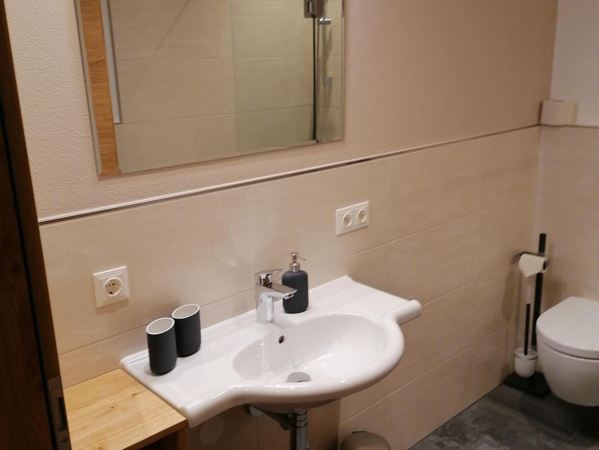Für 4 Personen, 45 m², neuwertig, Schlafzimmer mit Doppelbett, Wohnzimmer mit Schlafcouch für 2 Personen, Küche, Wohnraum, Badezimmer mit Dusche, Waschbecken, WC, Sitzecke, Couch, TV im Wohnzimmer, gut ausgestattete Küche, Wohnung im Parterre.
