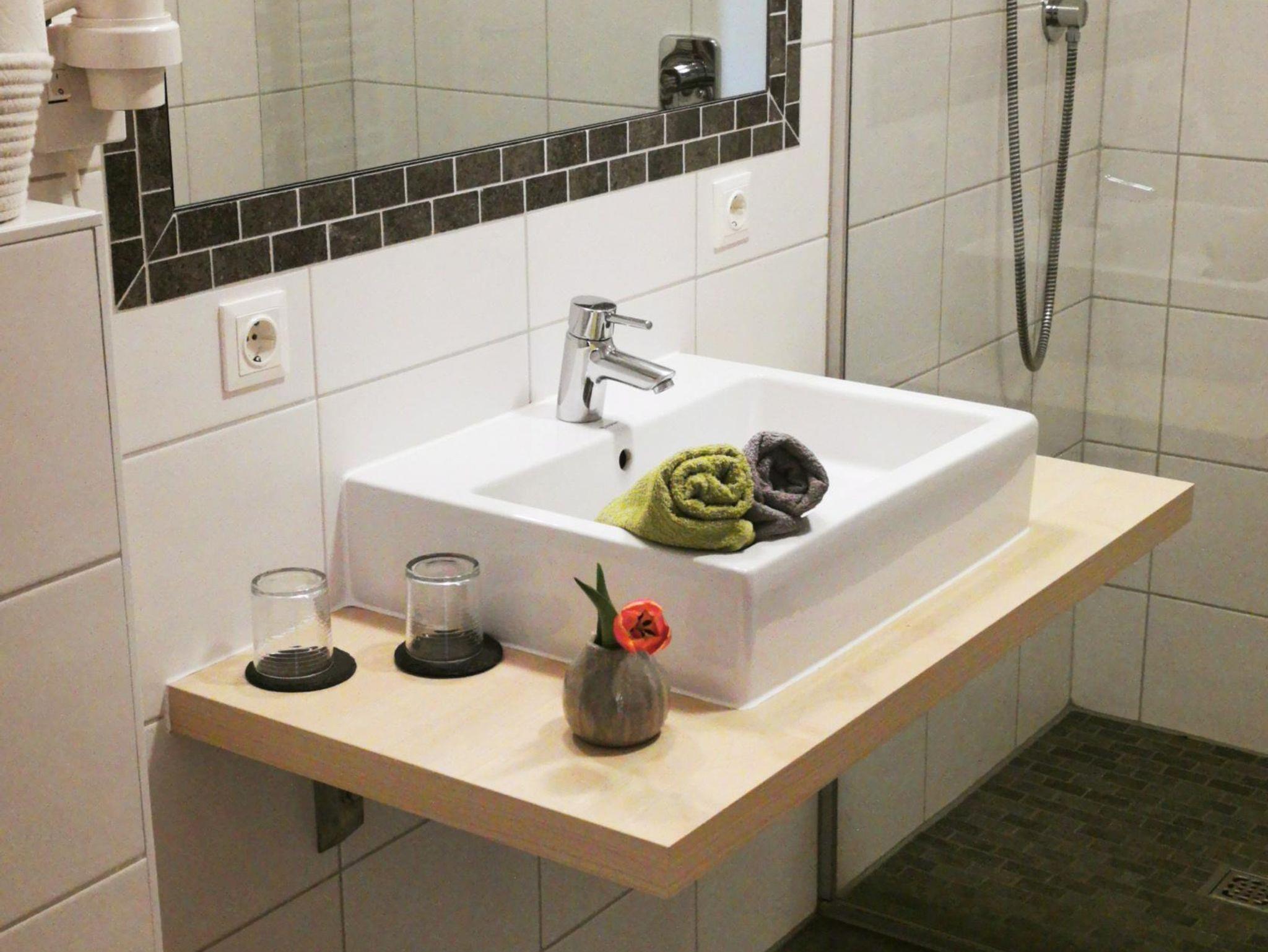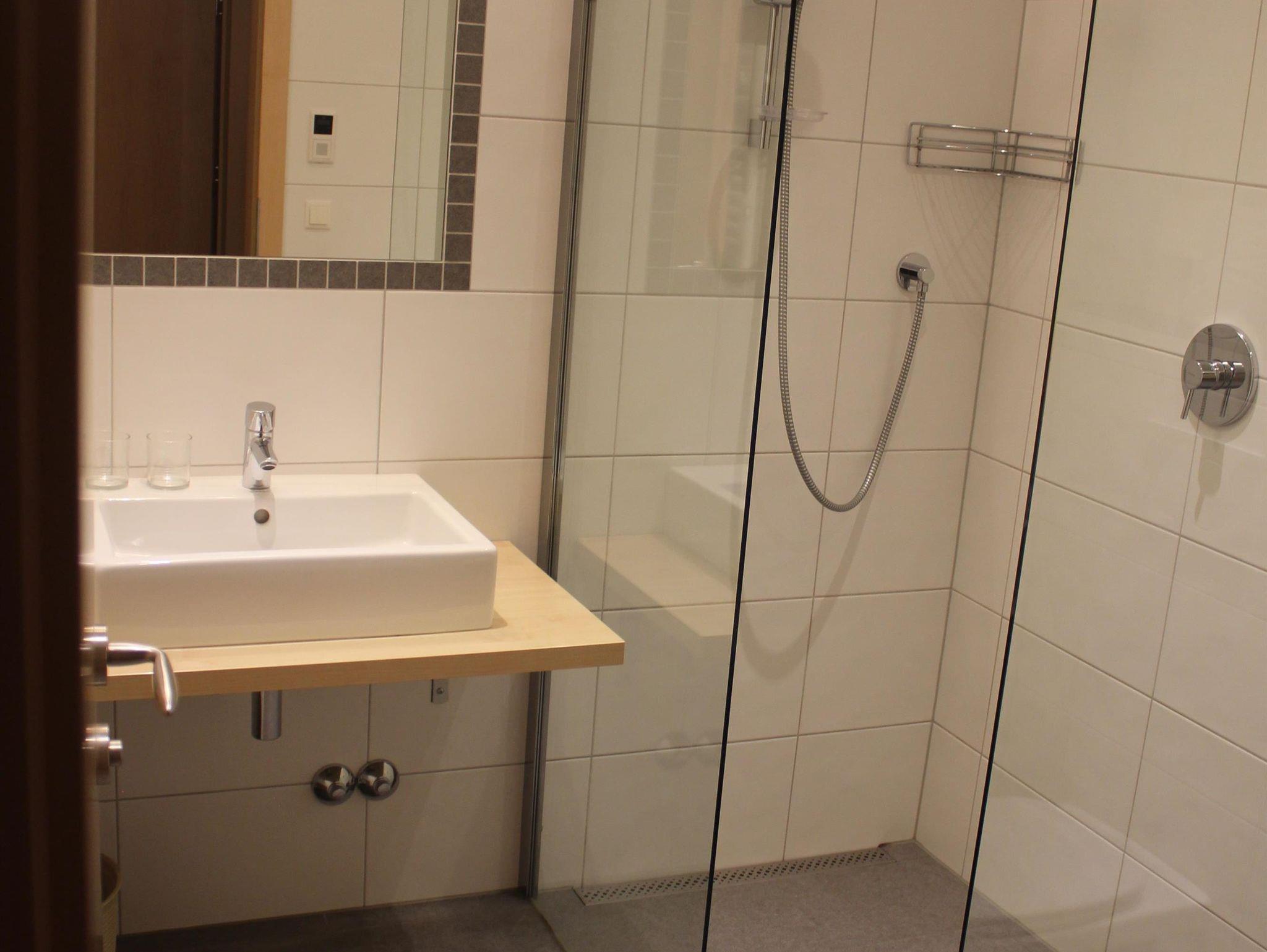 Das Bad ist neu renoviert in den Vierbettzimmern.