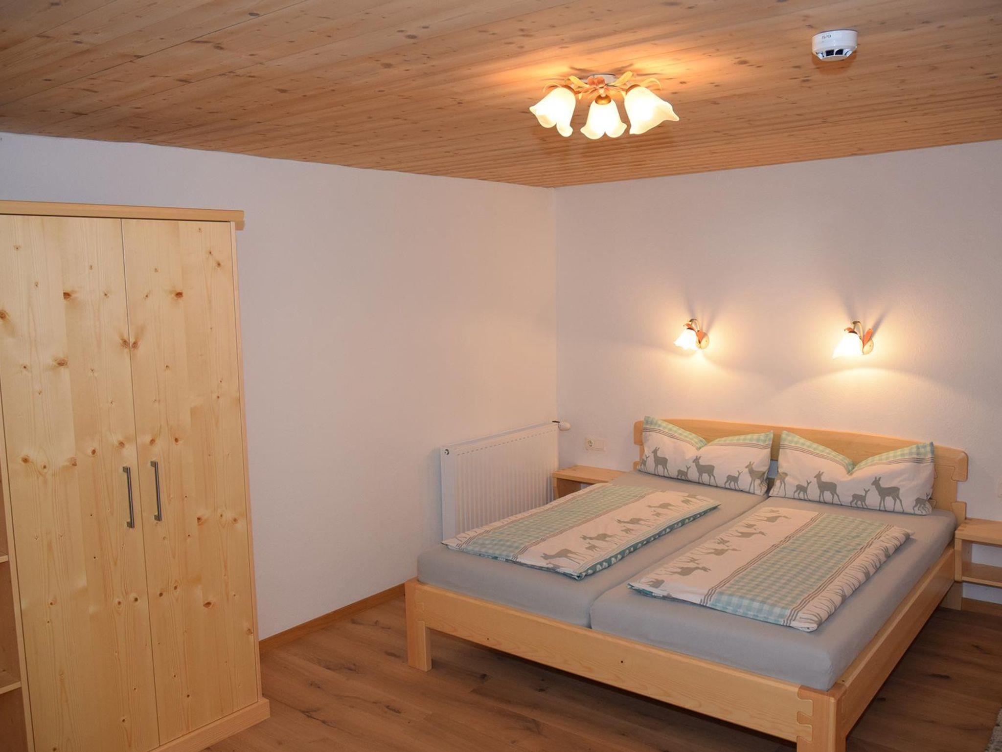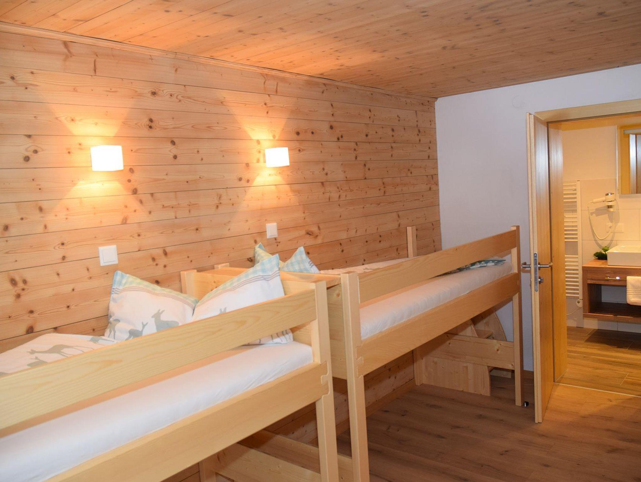 Familienzimmer (Doppelbett, 2 Kinderbetten + Zustellbett möglich) mit offenem Durchgang zur Wohnküche, Dusche/WC, Fön, TV, Wifi, Tal-/Bergblick, Balkon