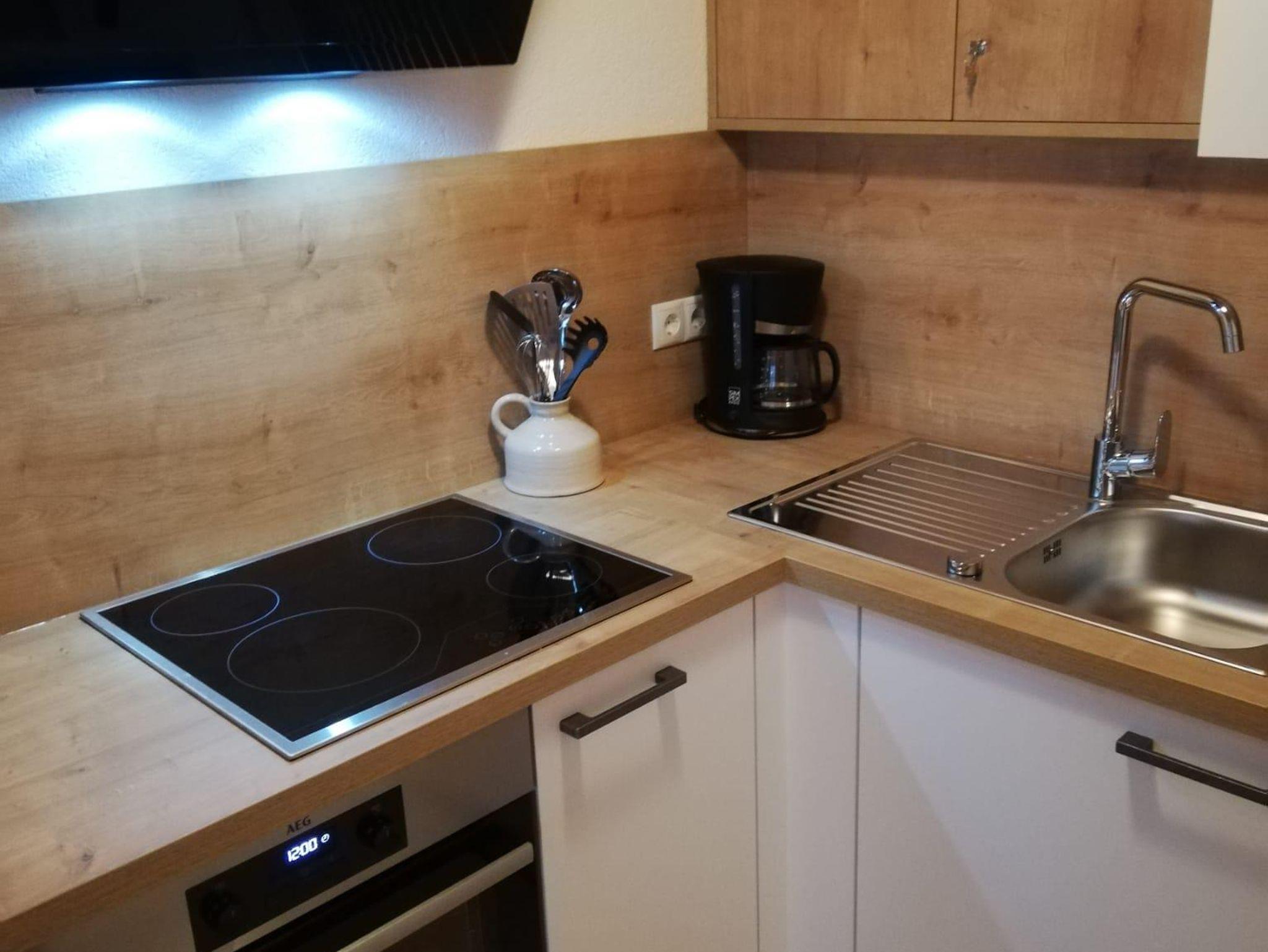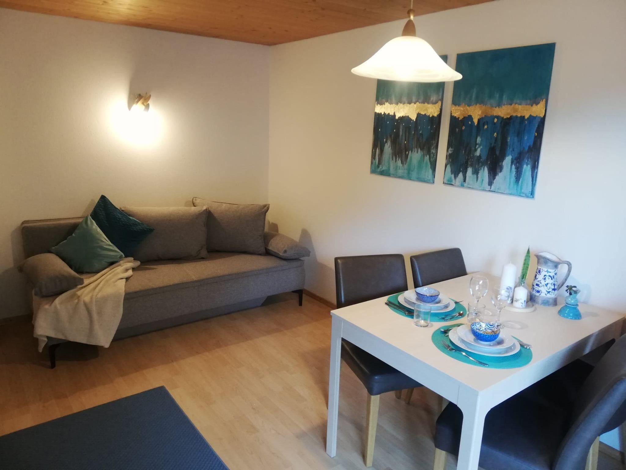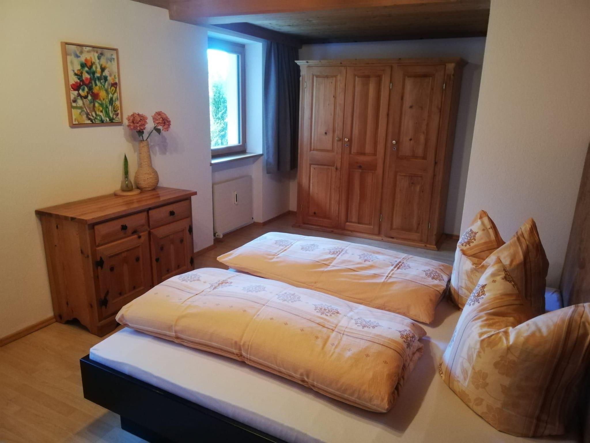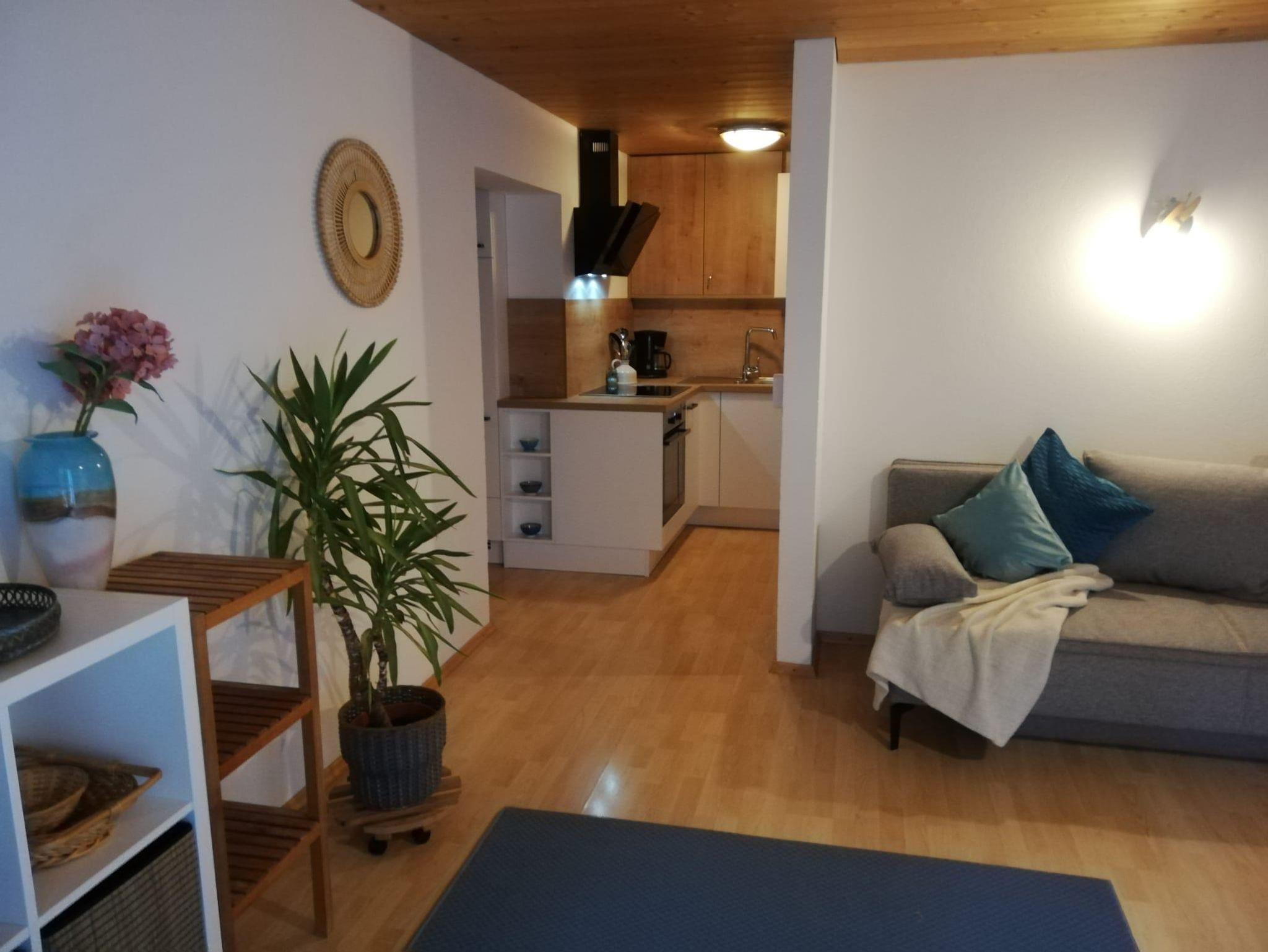 Teilrenovierte Wohnung im EG eines Mehrfamilienhauses Haus Jenewein. Die Wohnung hat eine Fläche von 55m² mit einer großzügigen Terrasse. Das Appartement besteht aus einer Wohnküche, Schlafzimmer, Badezimmer und Garderobe. Die Wohnküche ist neu und bietet ausreichend Platz (Backrohr, Ceranfeld, Geschirrspüler, Dunstabzug, Kaffeemaschine, Kühlschrank mit Gefrierfach). Das angrenzende Wohnzimmer verfügt über einen Esstisch, Sitzmöglichkeiten, TV, genügend Stauraum und mit Zugang zur Terrasse. Die im Wohnzimmer befindliche Couch bietet bei Bedarf für 2 Personen eine Schlafmöglichkeit. Das Schlafzimmer besteht aus einem Doppelbett, großem Schrank und Möglichkeit für ein Kinderbett.