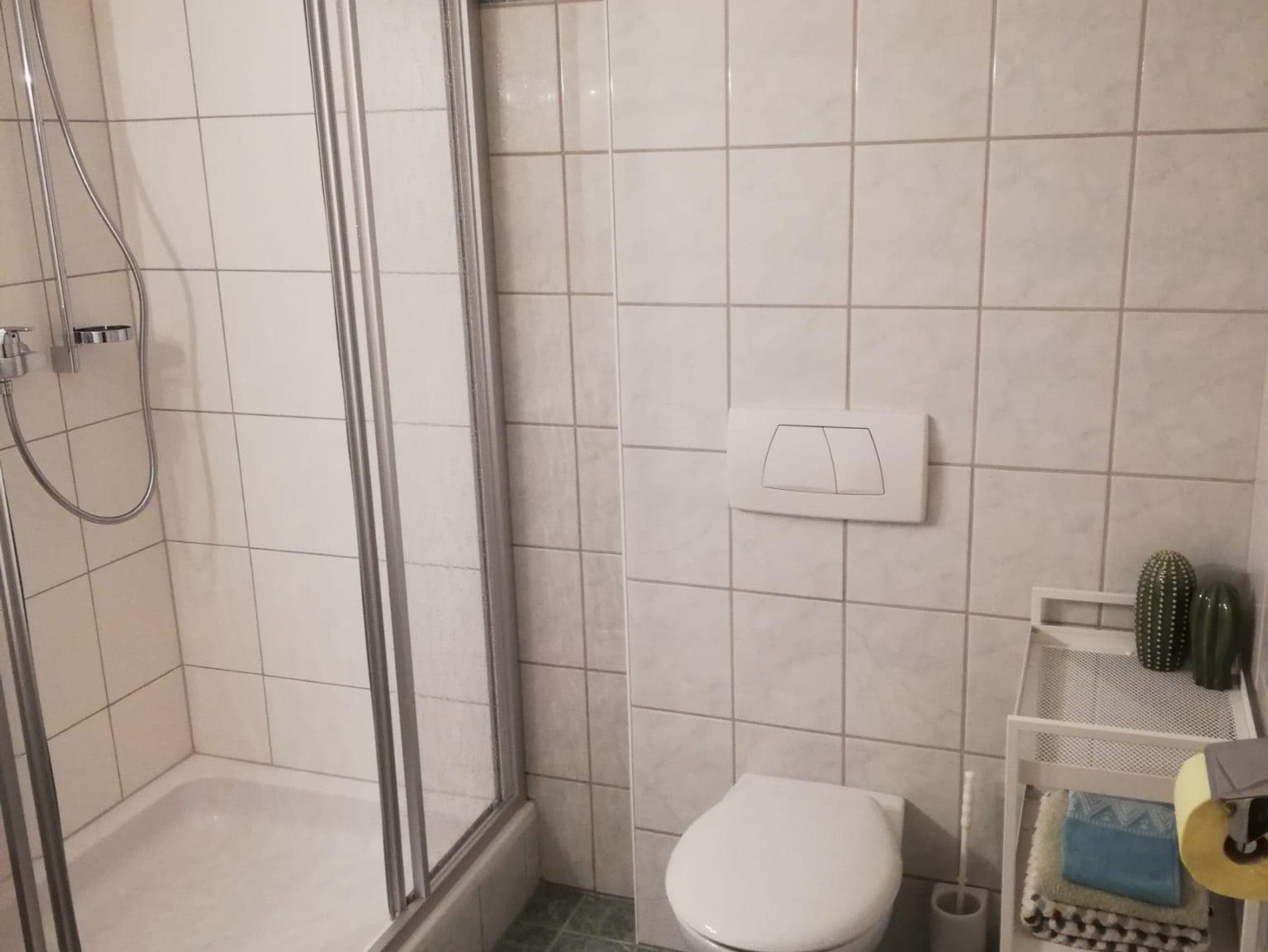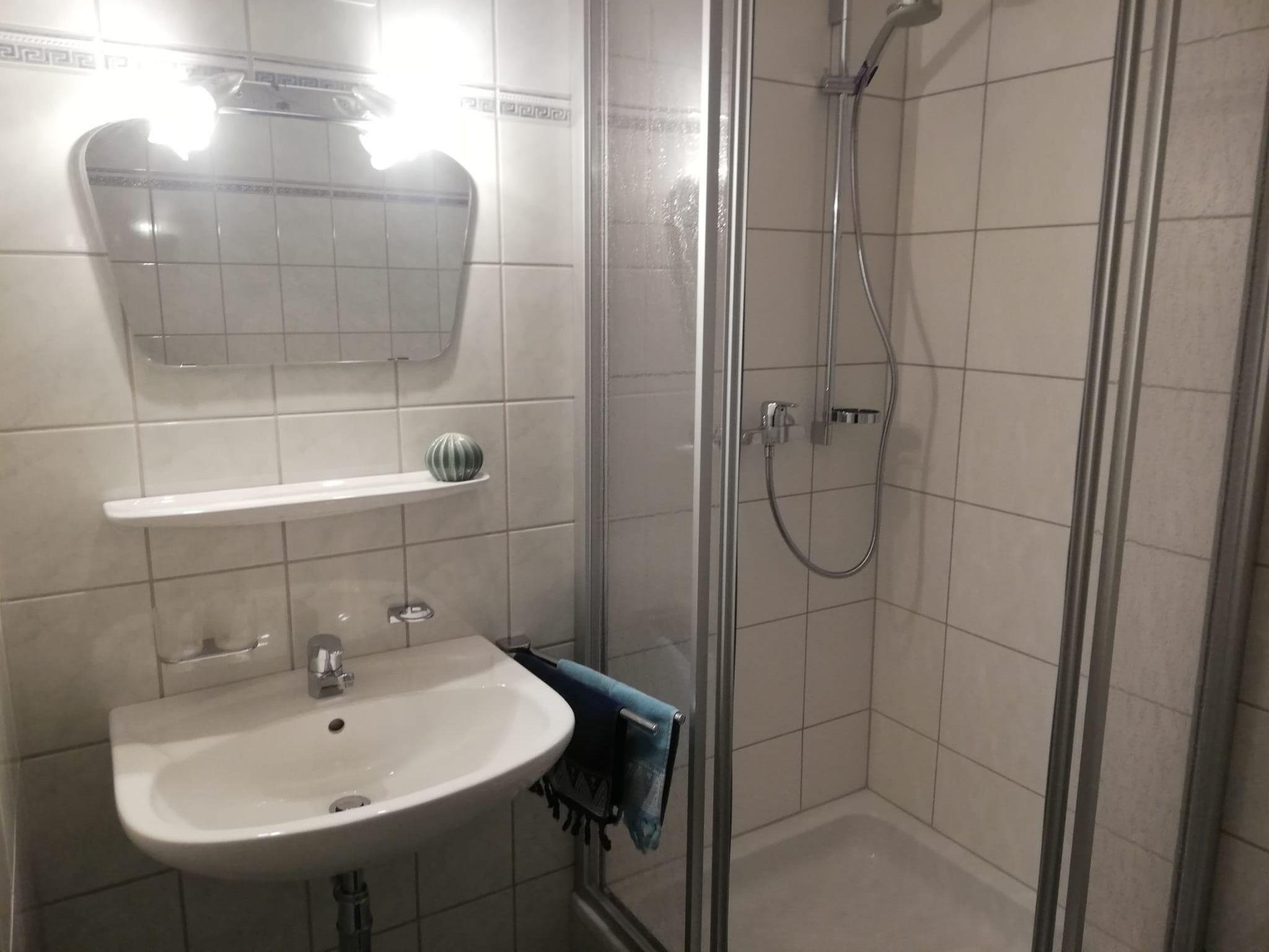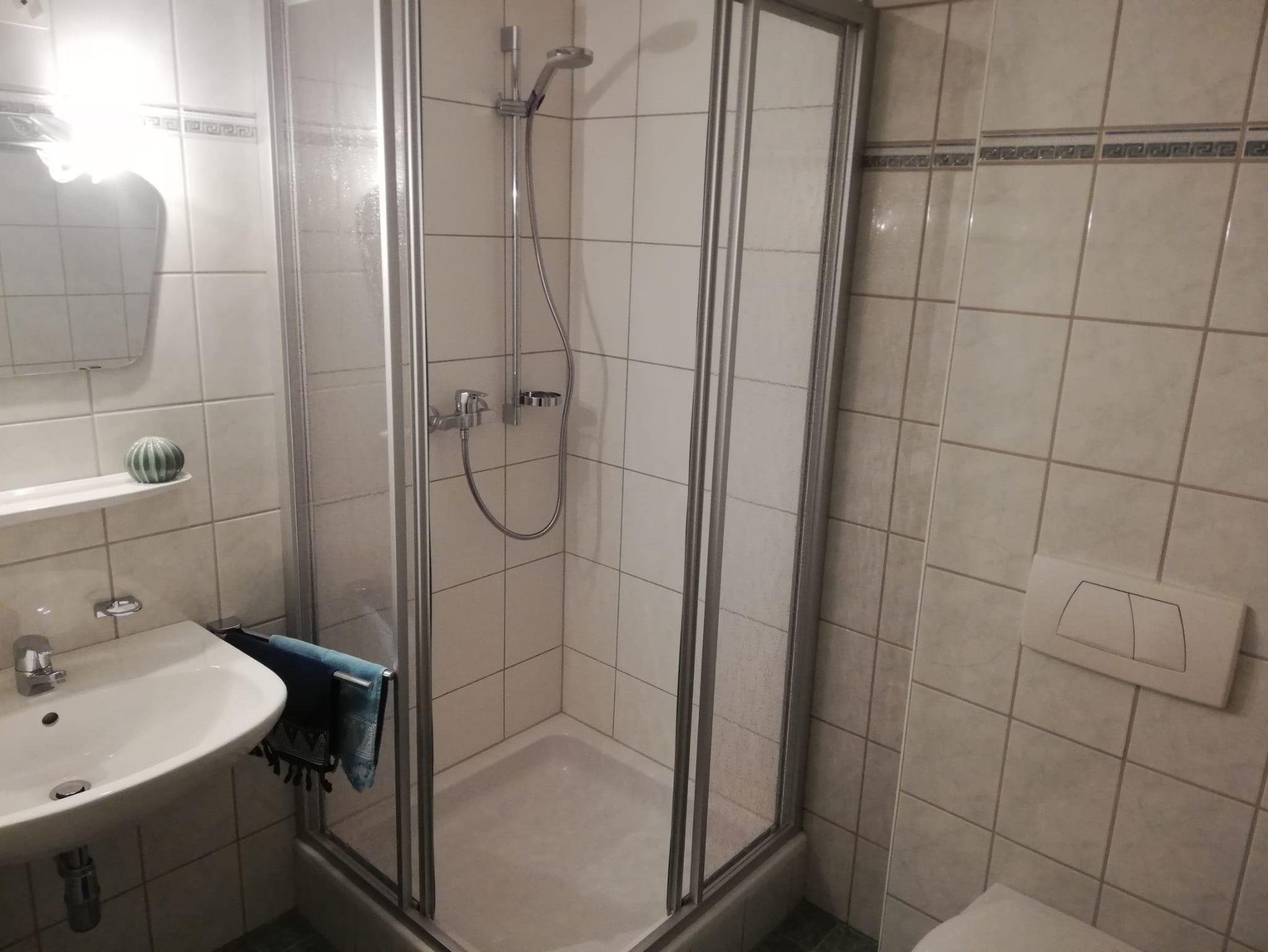 Im neu renovierten Bad befindet sich eine neue Dusche, neues WC und ein Waschbecken.