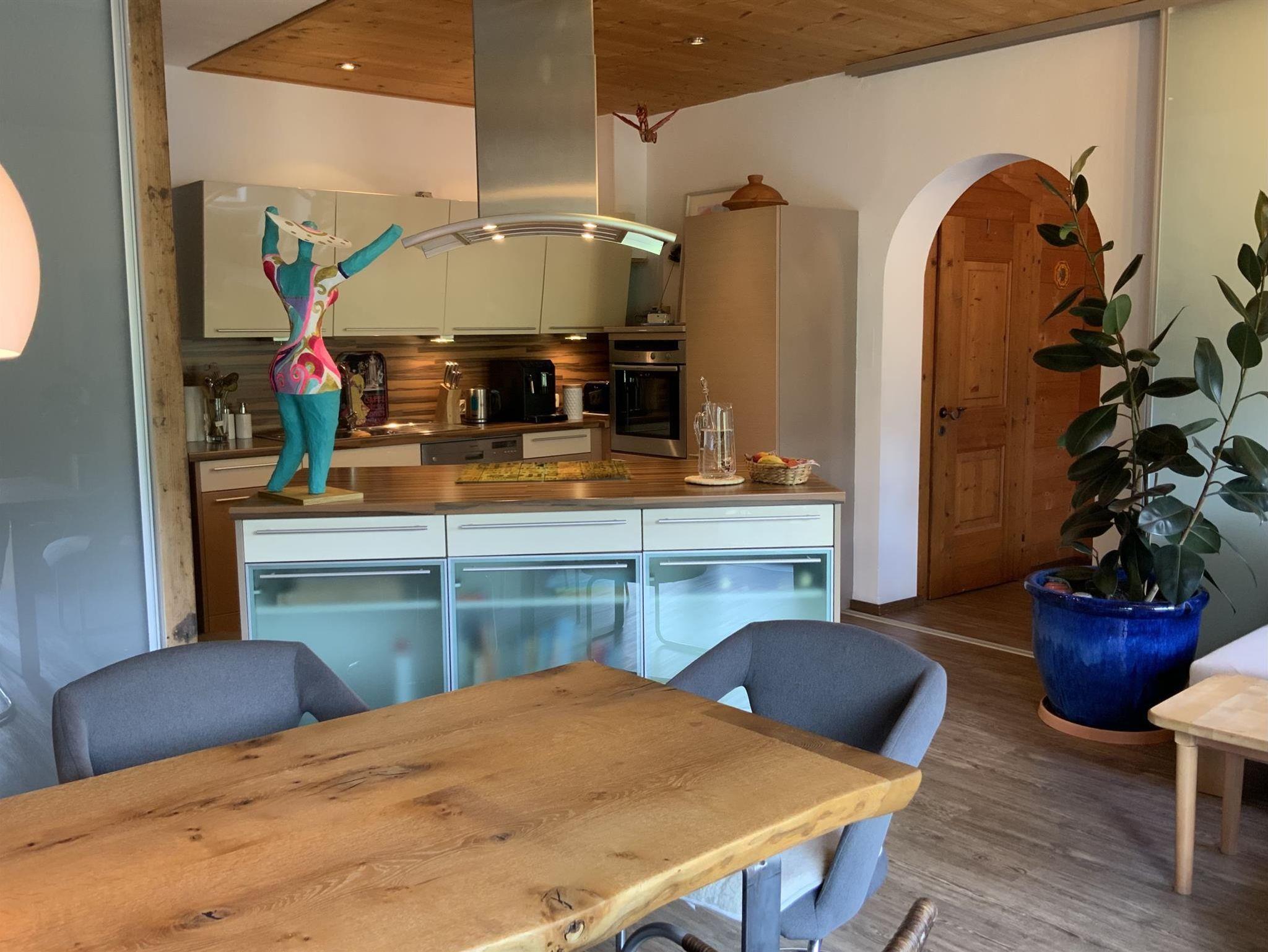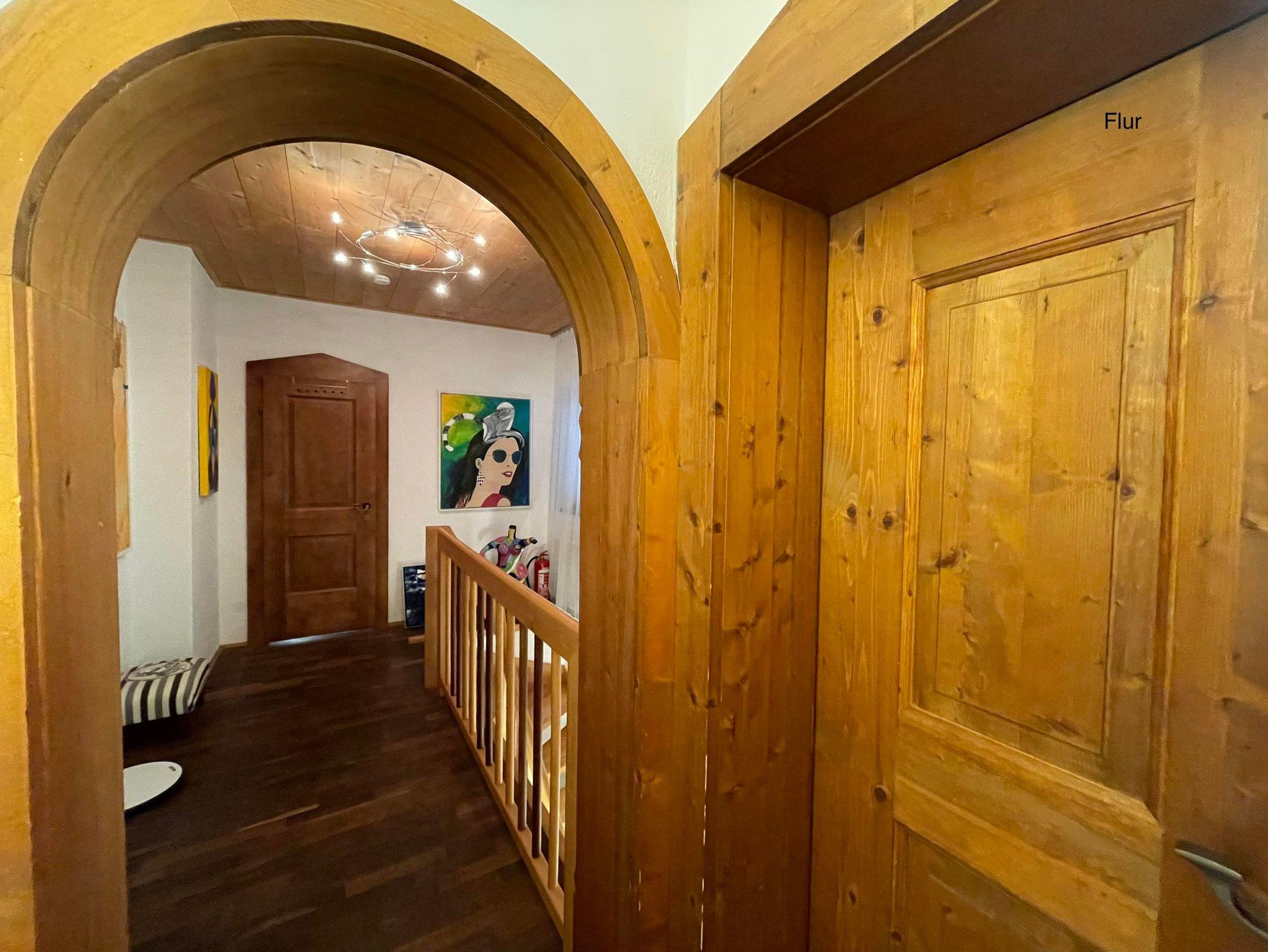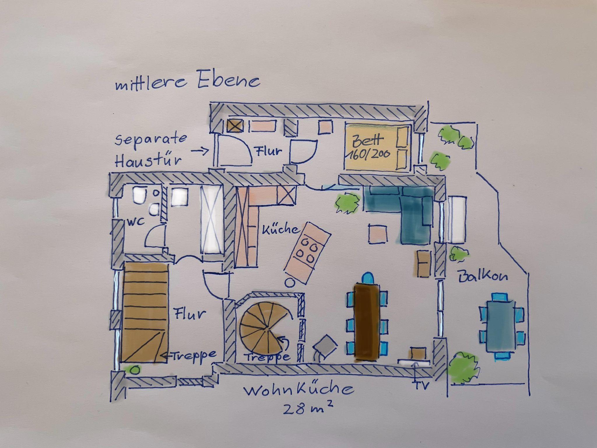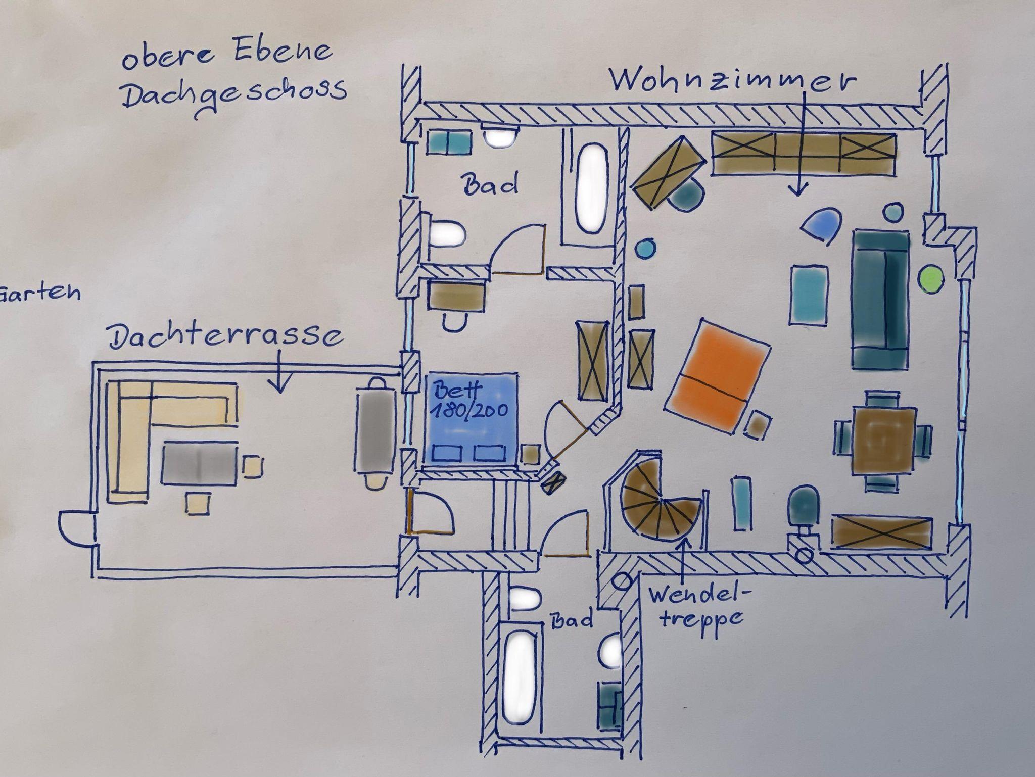 IHR kommt in das außergewöhnliche Urlaubsdomizil von den überdachten Parkplätzen durch die separate Haustür, den Flur, einem kleinen Schlafzimmer (160/200 cm Bett) zur geräumigen Wohnküche mit angrenzendem Südbalkon incl. Tischgruppe. Auf gleicher Wohnebene befinden sich auch ein ExtraWC und ein Schrankraum mit Waschmaschine. Über die Treppe gelangt IHR in die Gartenebene mit dem großen Schlafraum ( 180/200 cm Luxusbett, 90/200 cm Einzelbett, Infrarot-Wellness-Liege), Bad, sowie Zugang zur Terrasse, Arkaden mit Fitnessgeräten, Garten incl. Saunahäuschen ( zur alleinigen Nutzung). Zur dritten Wohnebene gelangt IHR von der Küche über die Wendeltreppe. Dort befindet sich das dritte Schlafzimmer (Doppelbett 180/200 cm), 2 weitere Badezimmer, das sehr großzügige Wohnzimmer mit angrenzender Dachterrasse incl. Lounge. In allen 3 Wohnebenen befindet sich jeweils ein TV. Die Wohnküche incl. Kochinsel ist hochwertig mit allem Komfort wie z.B. Kaffeevollautomat ausgestattet. Je nach Verfügbarkeit könnt IHR 2 E-Trekking-Bikes bzw. 2 Schlitten kostenfrei nutzen.