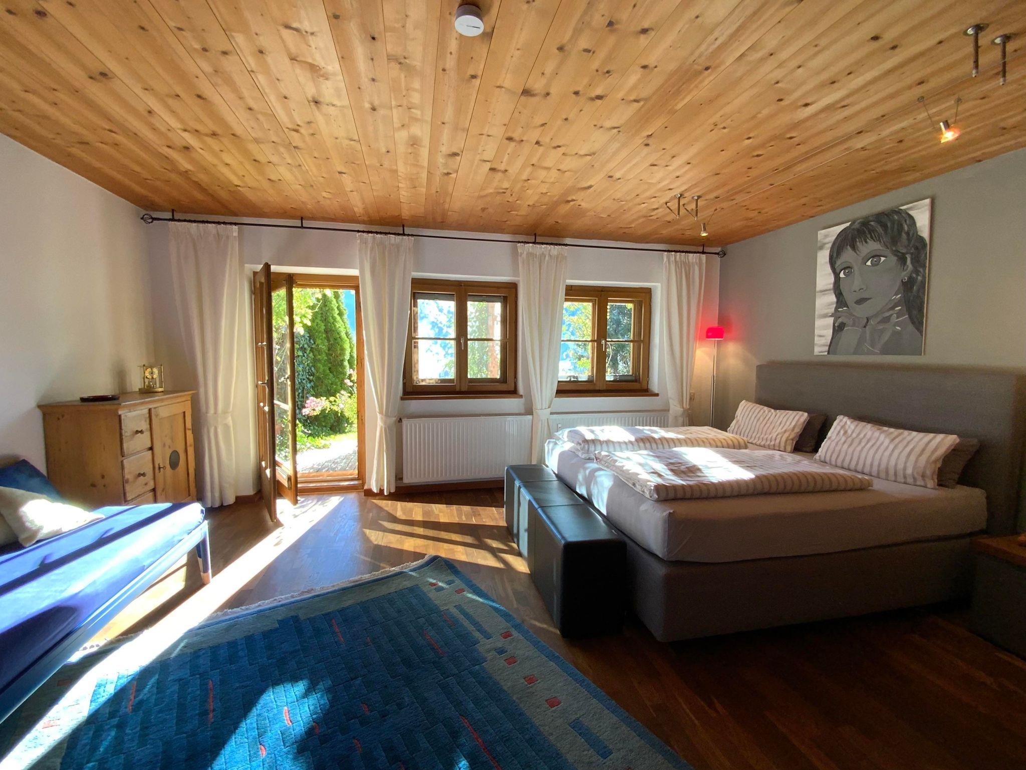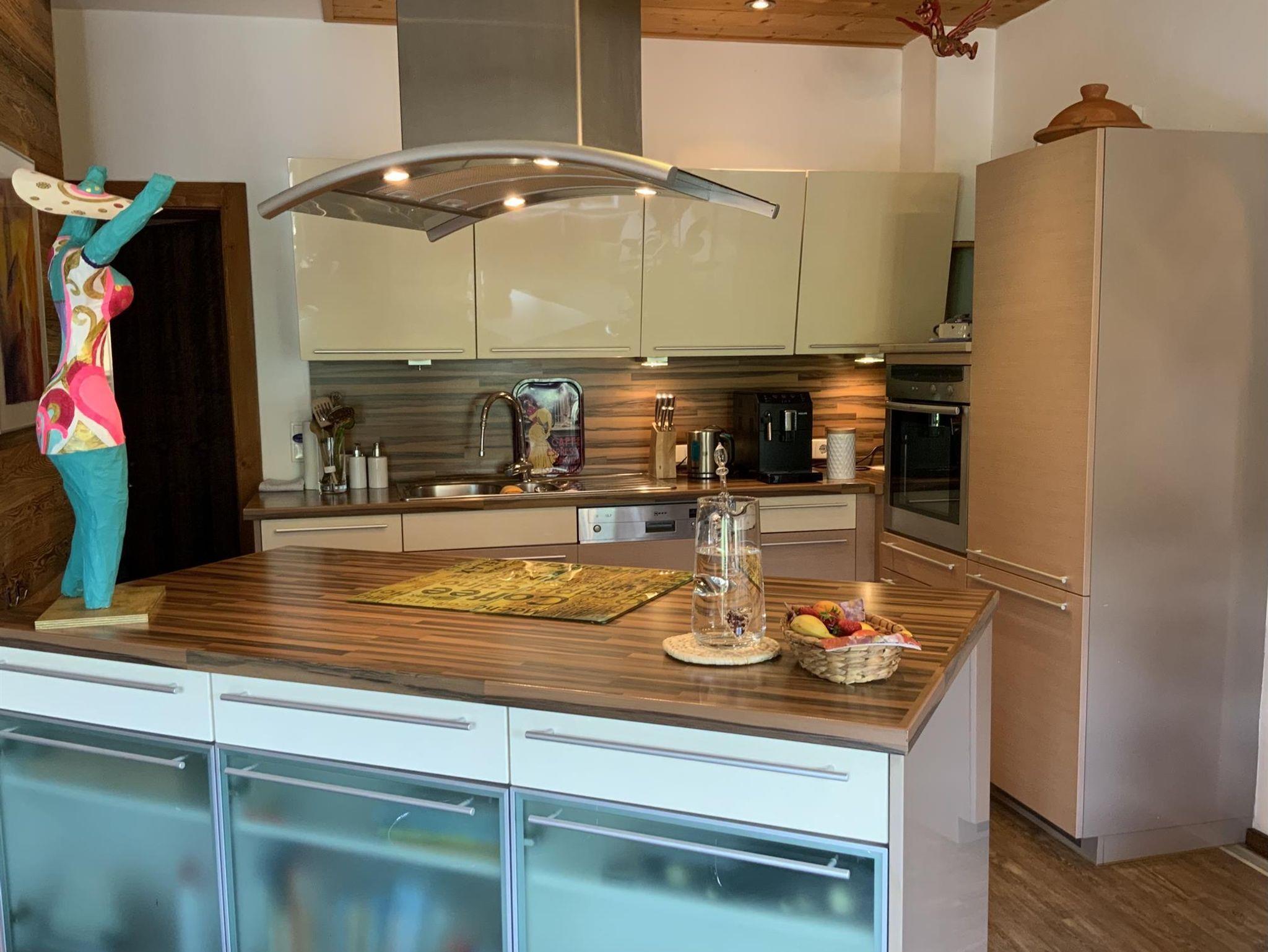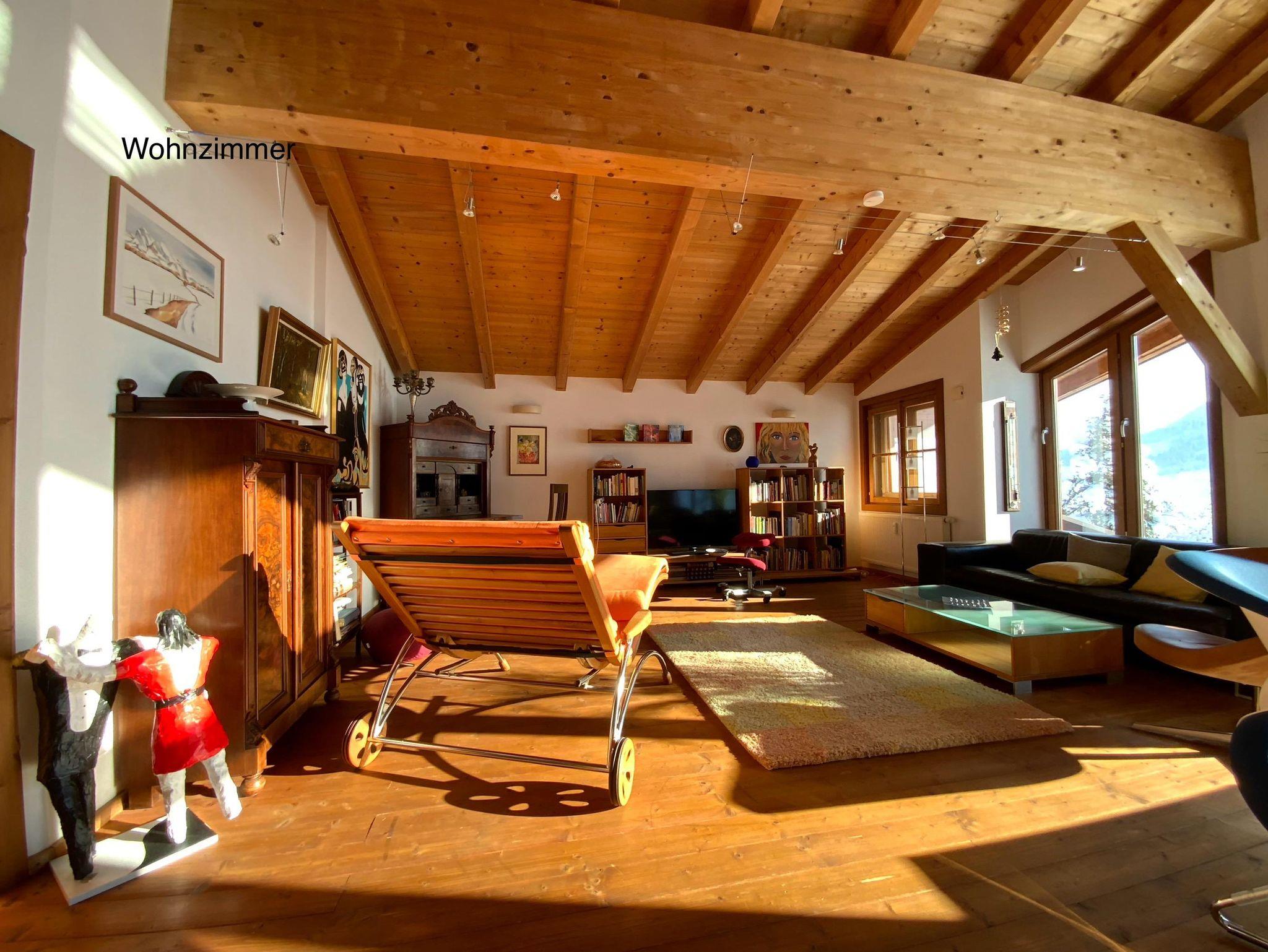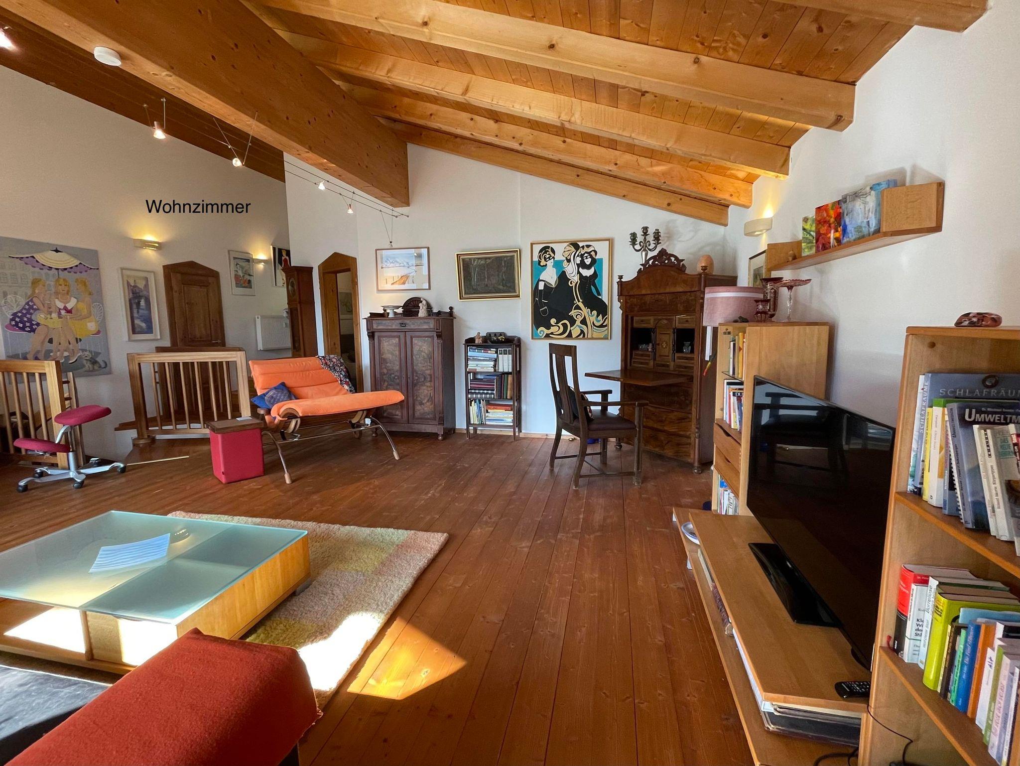 Das Chalet mit 3 Wohnebenen umfasst ein sehr großzügiges Schlafzimmer (Luxusbett 180/200 cm, Daybett 90/200 cm, TV, Infrarot-Wellness-Liege...), angrenzendes Badezimmer, ein weiteres Schlafzimmer ( Bett 160/200 cm ), ein Extra-WC, eine Wohnküche mit Kochinsel und großer Tischgruppe, Ecksofa und TV, einen Schrankraum mit Waschmaschine, Flur. Auf dem angrenzenden Balkon befindet sich auch eine große Tischgruppe. In der oberen Wohnebene befindet sich ein drittes Schlafzimmer, zwei weitere Badezimmer und ein sehr großes Wohnzimmer mit Zugang zur Dachterrasse.Der Garten incl. Außensauna ( 2 Abende pro Woche gratis ) stehen zur alleinigen Nutzung. Unter den Arkaden befindet sich der umfangreiche Fitnessbereich.Die Polsterbetten in Boxspringoptik sind mit hochwertigen Naturlatexzonenmatratzen und Naturbettwaren sowie Baumwollbettwäsche ausgestattet. In das große Schlafzimmer kann auf Wunsch ein Babybett (70/140 cm) gestellt werden. Im gesamten Haus gibt es farbenfrohe, originale Bilder.