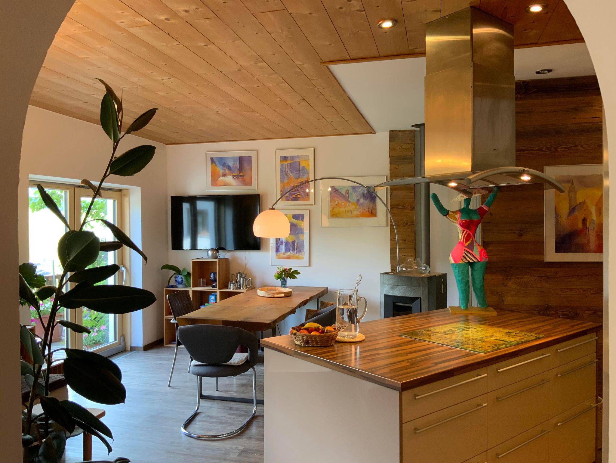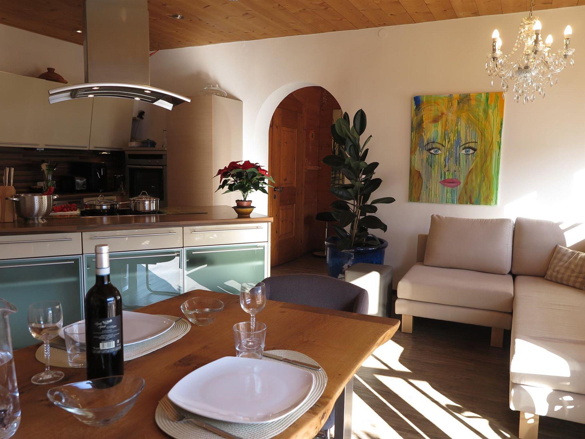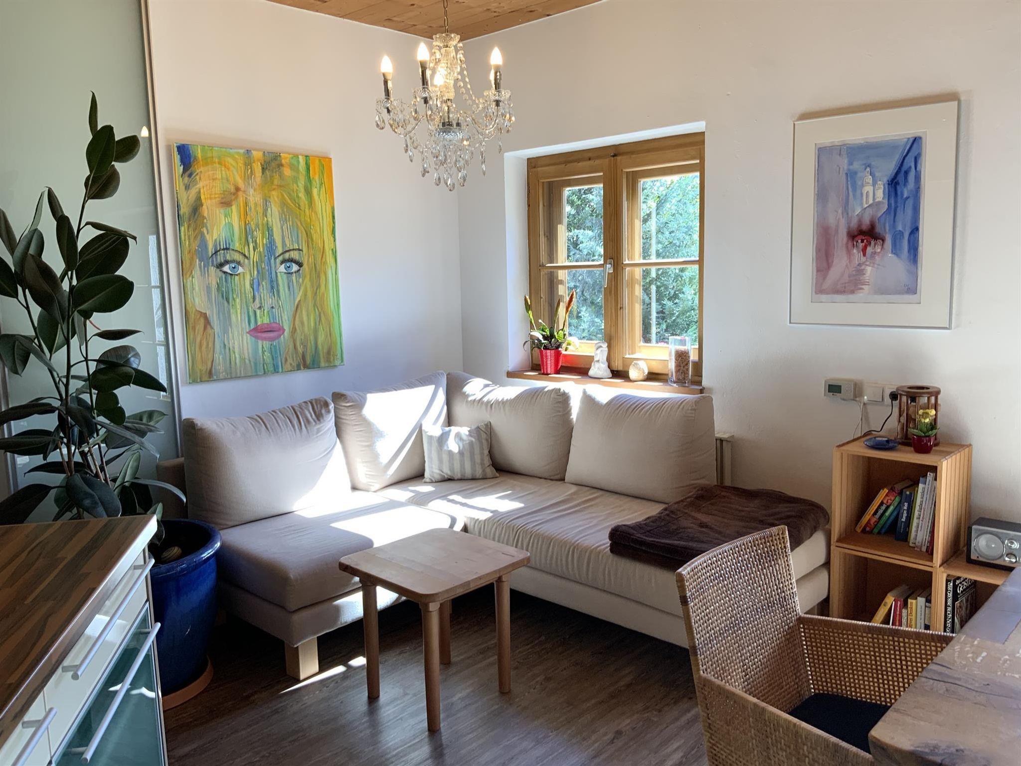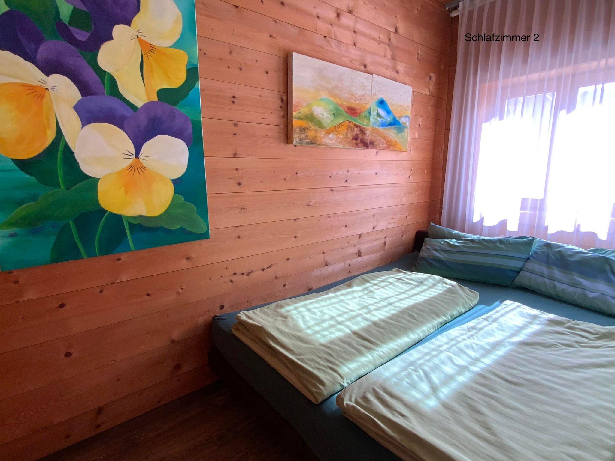Das Chalet mit 3 Wohnebenen umfasst ein sehr großzügiges Schlafzimmer (Luxusbett 180/200 cm, Daybett 90/200 cm, TV, Infrarot-Wellness-Liege...), angrenzendes Badezimmer, ein weiteres Schlafzimmer ( Bett 160/200 cm ), ein Extra-WC, eine Wohnküche mit Kochinsel und großer Tischgruppe, Ecksofa und TV, einen Schrankraum mit Waschmaschine, Flur. Auf dem angrenzenden Balkon befindet sich auch eine große Tischgruppe. In der oberen Wohnebene befindet sich ein drittes Schlafzimmer, zwei weitere Badezimmer und ein sehr großes Wohnzimmer mit Zugang zur Dachterrasse.Der Garten incl. Außensauna ( 2 Abende pro Woche gratis ) stehen zur alleinigen Nutzung. Unter den Arkaden befindet sich der umfangreiche Fitnessbereich.Die Polsterbetten in Boxspringoptik sind mit hochwertigen Naturlatexzonenmatratzen und Naturbettwaren sowie Baumwollbettwäsche ausgestattet. In das große Schlafzimmer kann auf Wunsch ein Babybett (70/140 cm) gestellt werden. Im gesamten Haus gibt es farbenfrohe, originale Bilder.