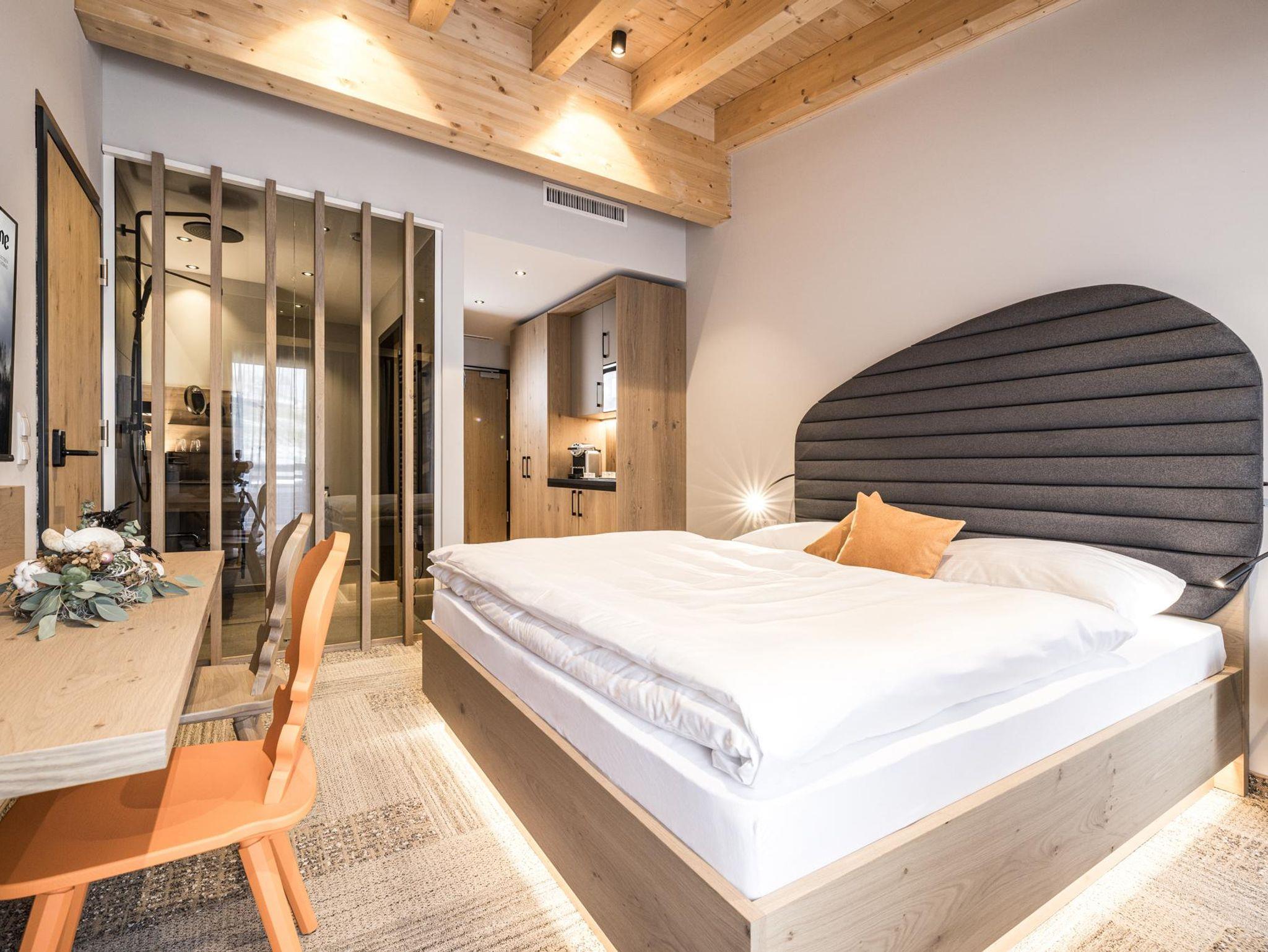 24 m², kompakt und fein, Schlafzimmer mit King Size Doppelbett, angrenzendes Badezimmer, Kitchenette, Balkon mit Sitzgelegenheit und Blick über die Wildschönau, Verbindungstüre zur Kombination mit anderen Apartments (auf Wunsch), Premium Vollausstattung: Mikrowelle, Kühlschrank, Kaffeemaschine, Wasserkocher, Flat-Screen TV, High-Speed Internetverbindung, Badezimmer mit Dusche und WC, Stellplätze in der Tiefgarage mit E-Ladestationen (First come, first serve)