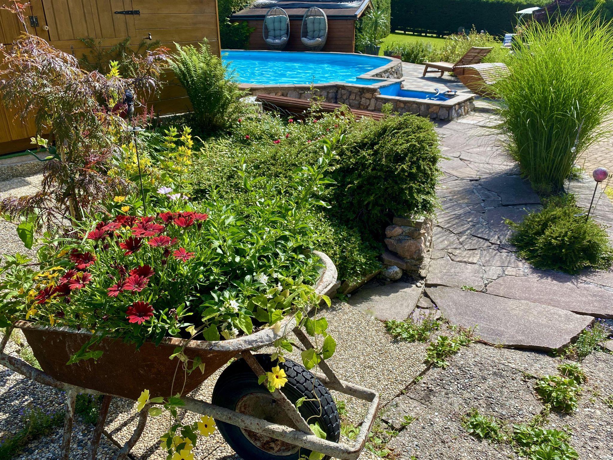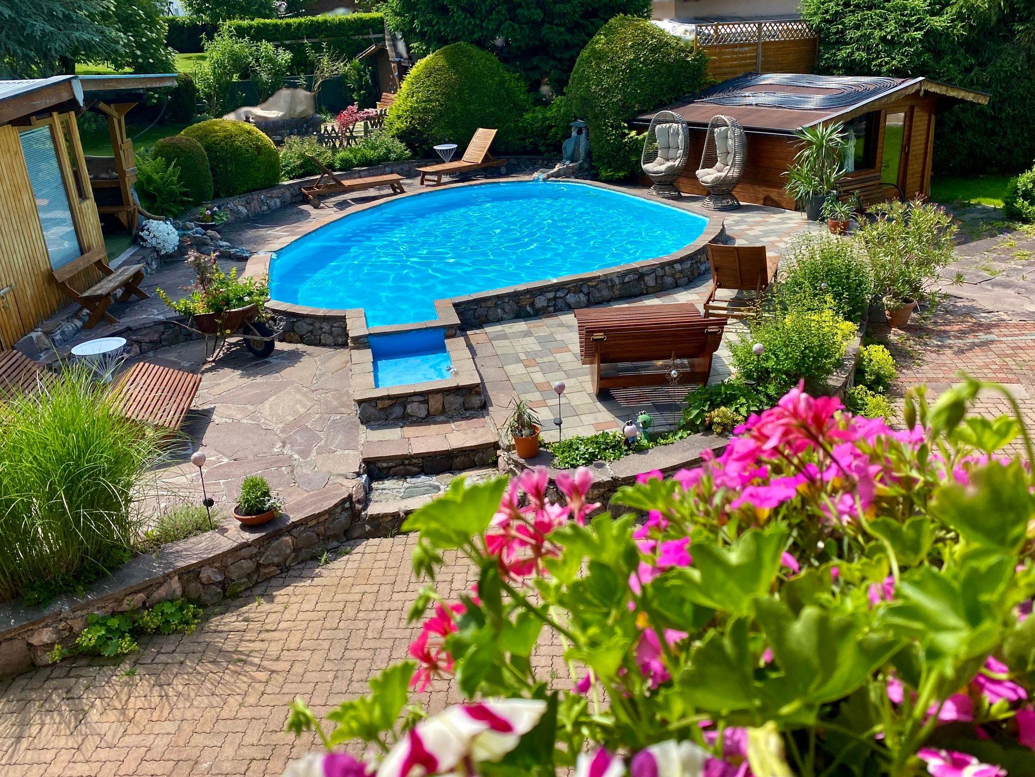 solarbeheizter Swimmingpool, große Gartenoase, Liegewiese, überdacht Parkplätze,