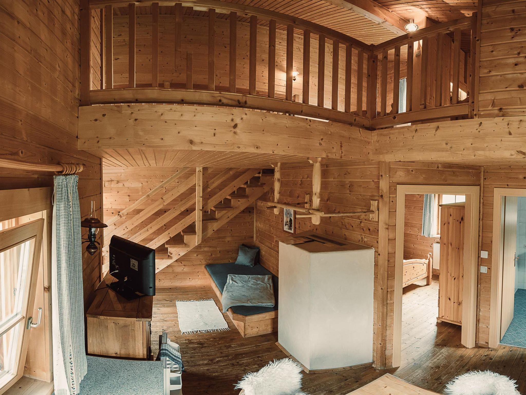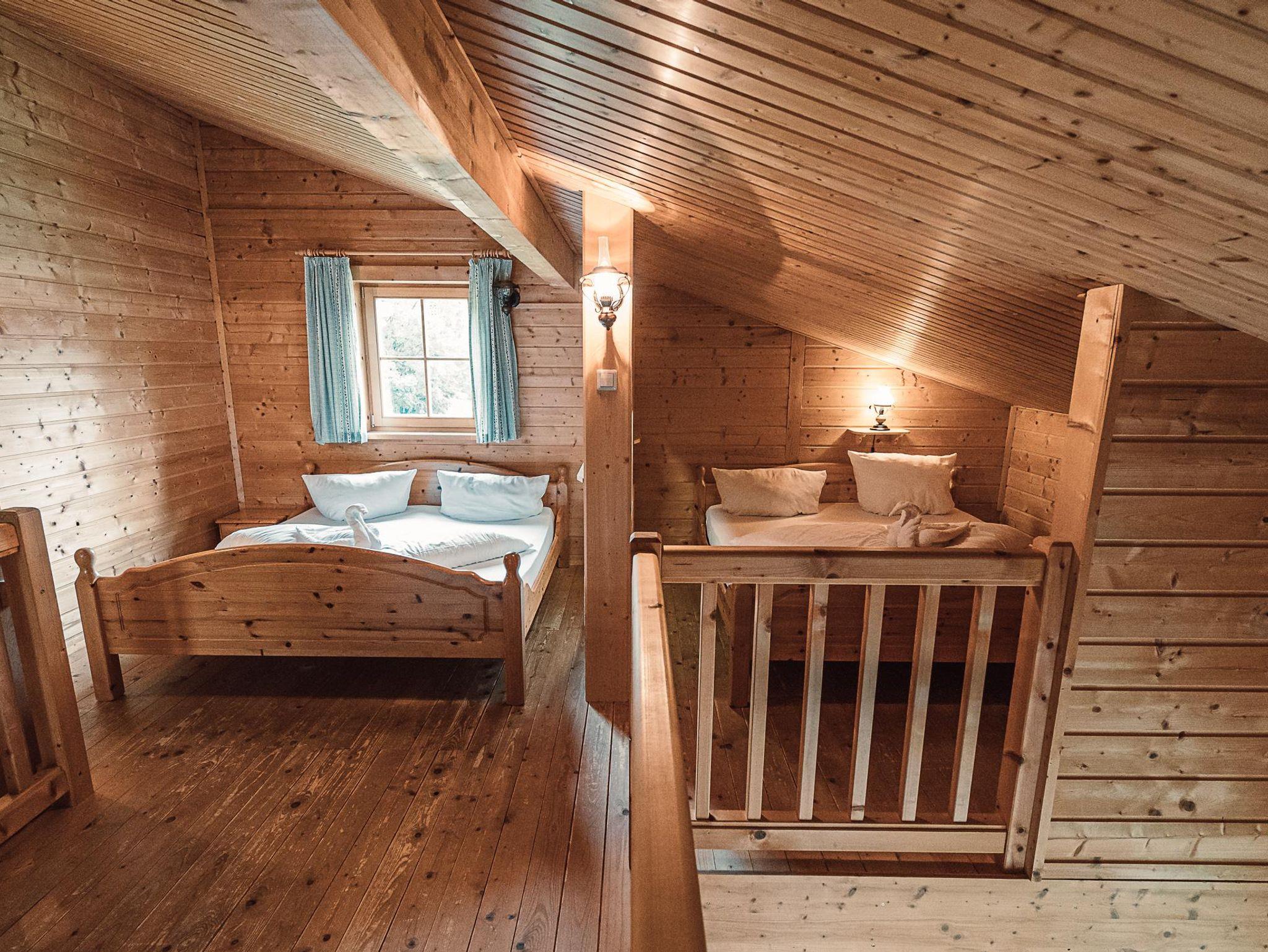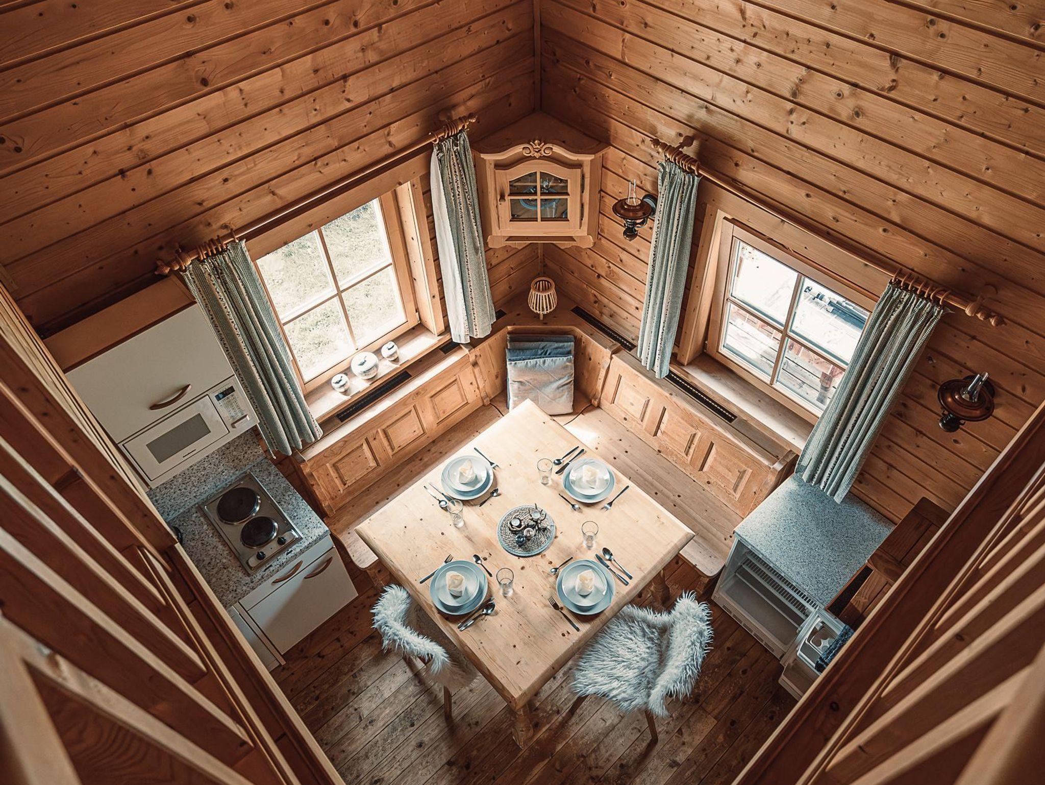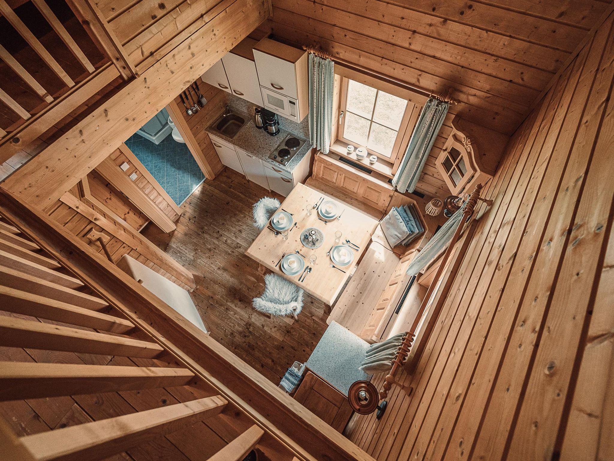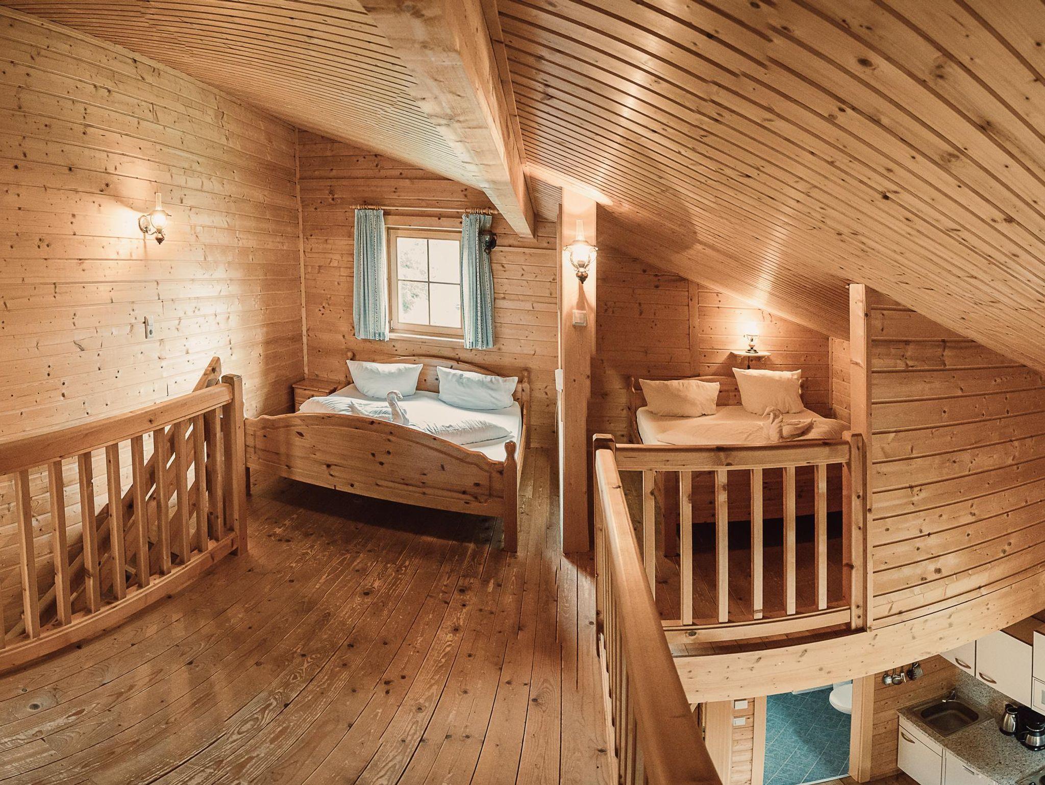 Almhütte Family & Friends – perfekt für größere Familien oder befreundete Paare: Im Erdgeschoss befindet sich ein separat abgetrenntes Schlafzimmer; darüber liegt ein offenes Galerieschlafzimmer, das nur durch eine Trennwand abgegrenzt ist (keine einzelnen Räume). Bei Bedarf auf Anfrage können zwei nebeneinander liegende Hütten zusammen gebucht werden – komfortabel für Gruppen von bis zu 12 Personen.