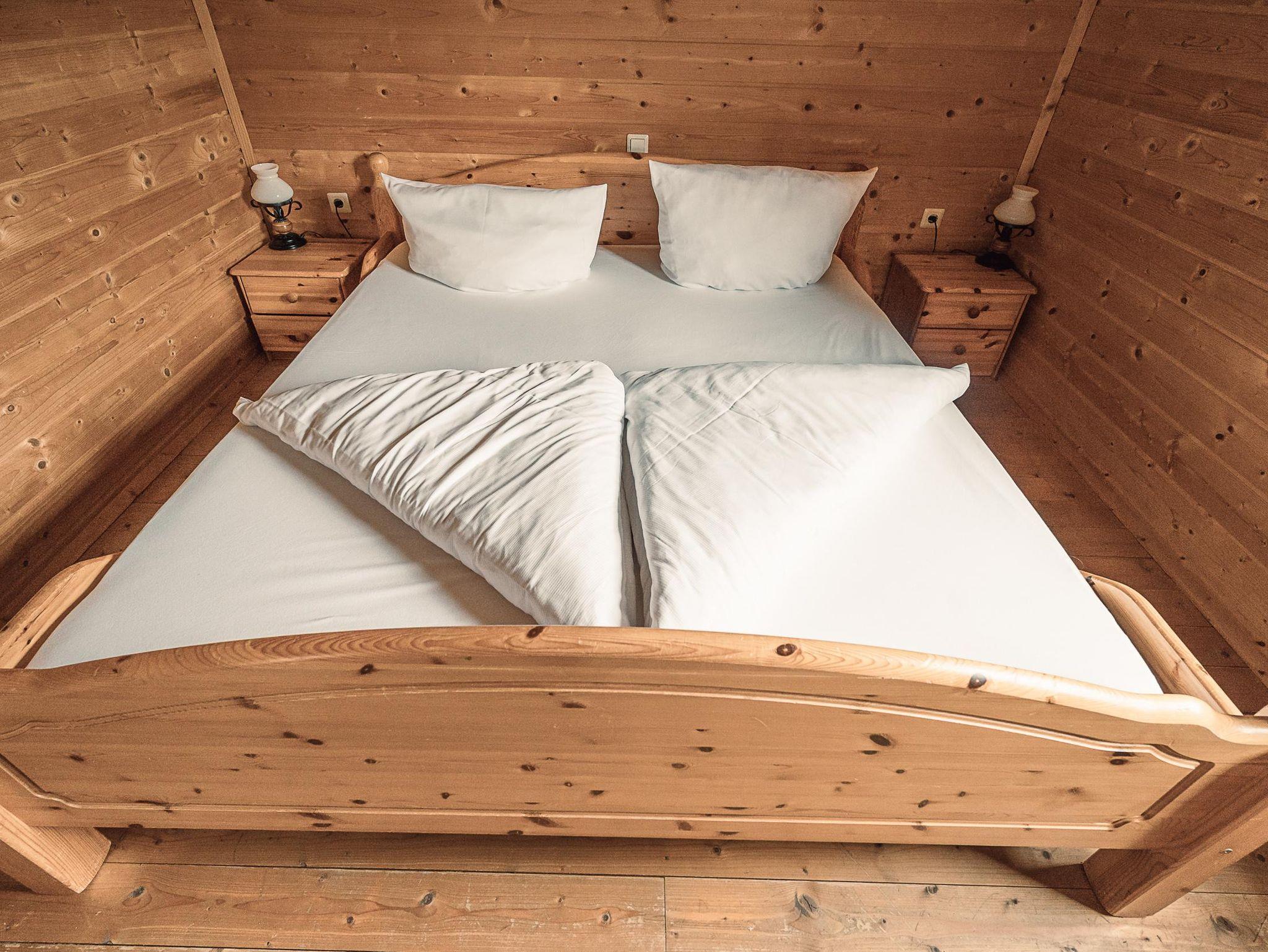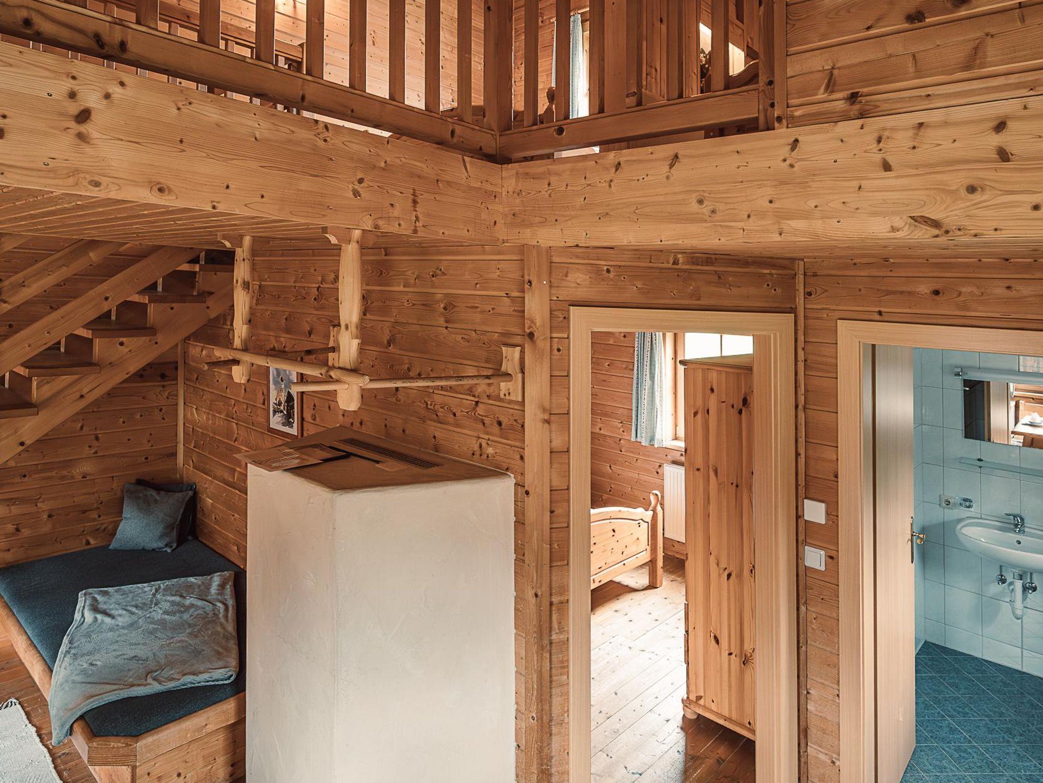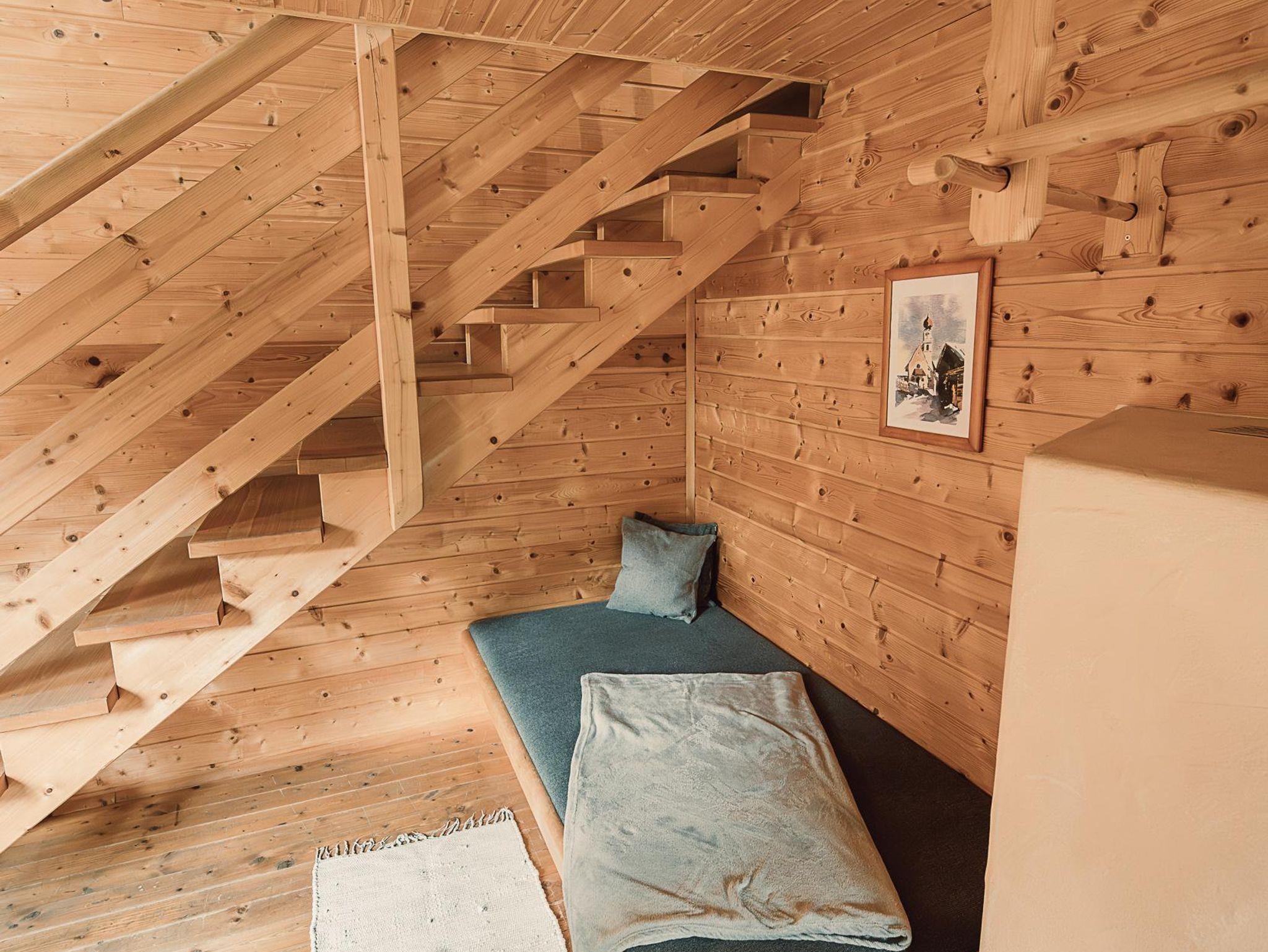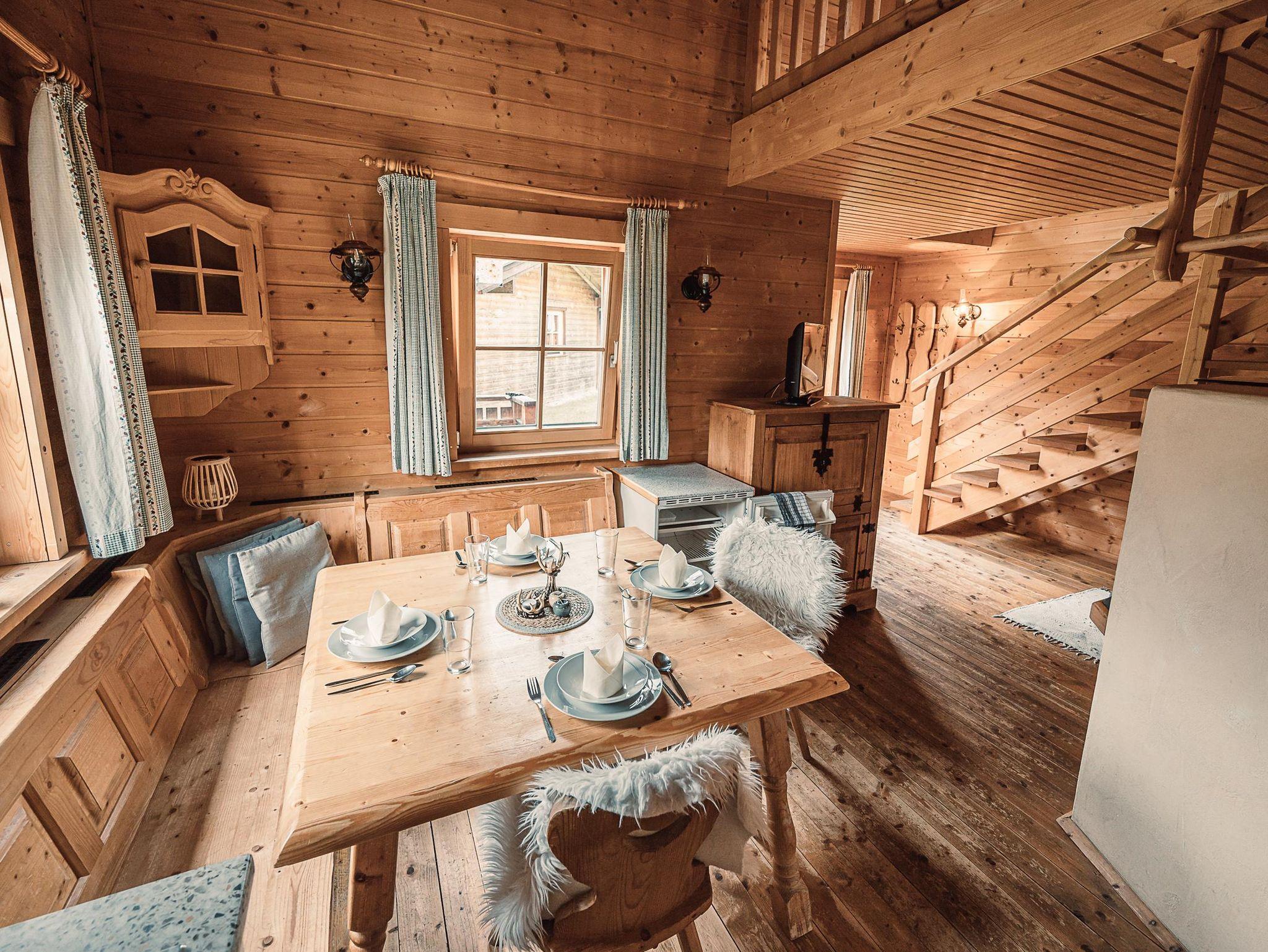 Almhütte Family & Friends – perfekt für größere Familien oder befreundete Paare: Im Erdgeschoss befindet sich ein separat abgetrenntes Schlafzimmer; darüber liegt ein offenes Galerieschlafzimmer, das nur durch eine Trennwand abgegrenzt ist (keine einzelnen Räume). Bei Bedarf auf Anfrage können zwei nebeneinander liegende Hütten zusammen gebucht werden – komfortabel für Gruppen von bis zu 12 Personen.