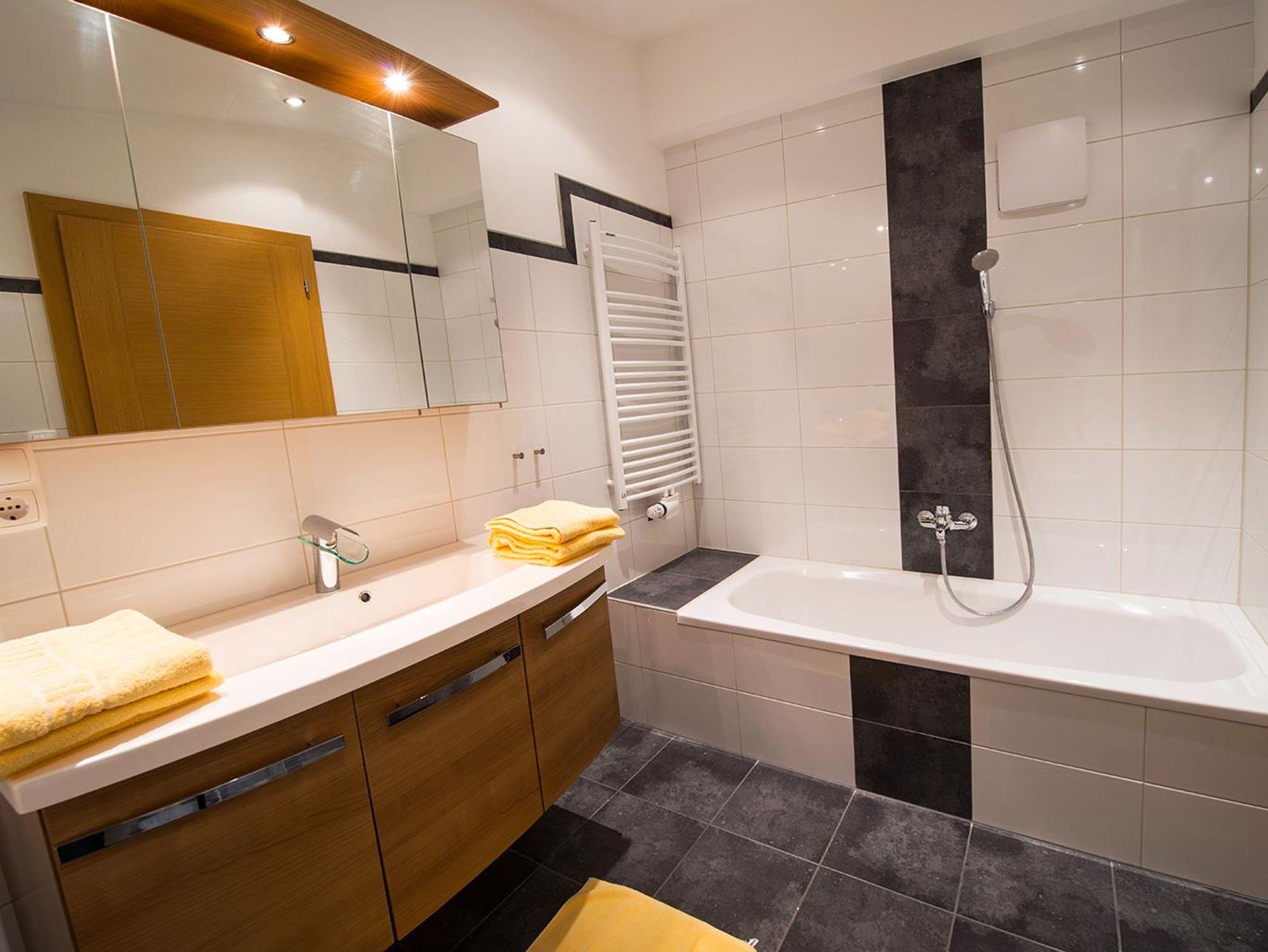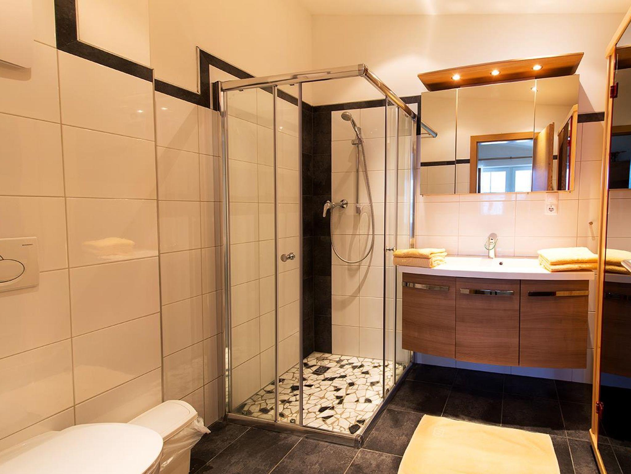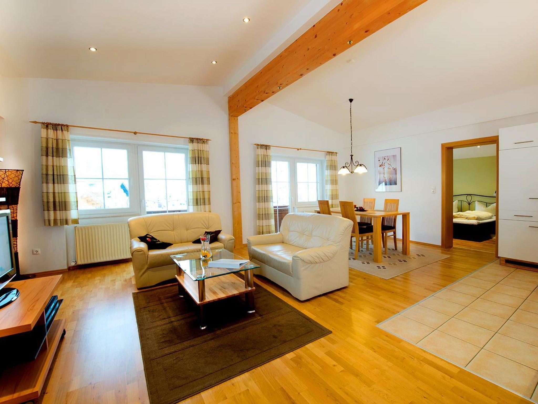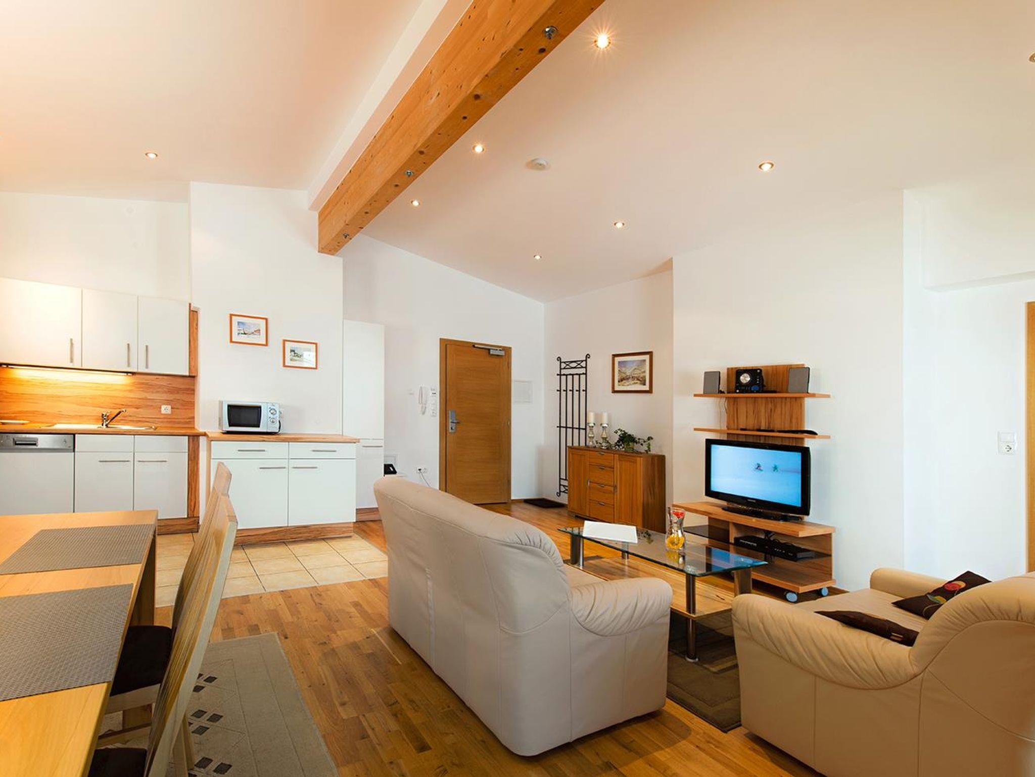 Apartment mit 2 Schlafzimmern, 2 Bädern (Dusche/WC, Badewanne/WC), privater Physioterm-Wellnesskabine, privatem Balkon mit herrlicher Aussicht großzügiger Wohnraum mit Sitzecke, Flachbildschirm, DVD-Player, Stereoanlage, kostenloses WLAN komplett ausgestattete Küche mit Geschirrspüler, Kühlschrank mit Gefrierfach, Elektroherd mit Backofen, Mikrowelle, Kaffeemaschine, Wasserkocher, Toaster zusätzliches SAT-TV in einem Schlafzimmer Waschmaschine, Bügelbrett, Bügeleisen in jedem Apartment Eichenparkettboden für angenehmes Wohnklima