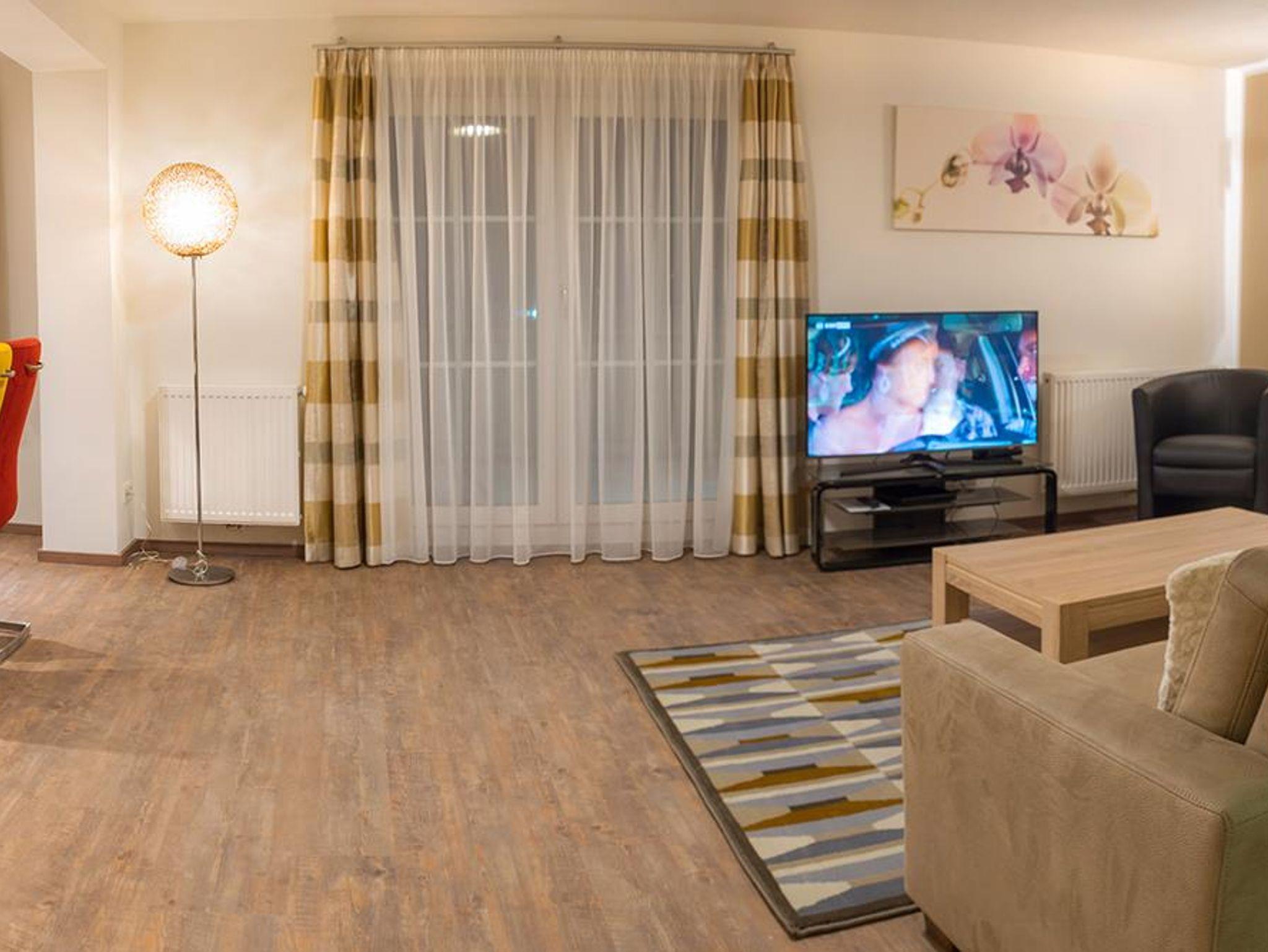 48 Zoll (120 cm) Flachbildschirm im Wohnzimmer, 32 Zoll Fernseher im jedem Schlafzimmer sowie kostenloses W-LAN gehören zur Standardeinrichtung.